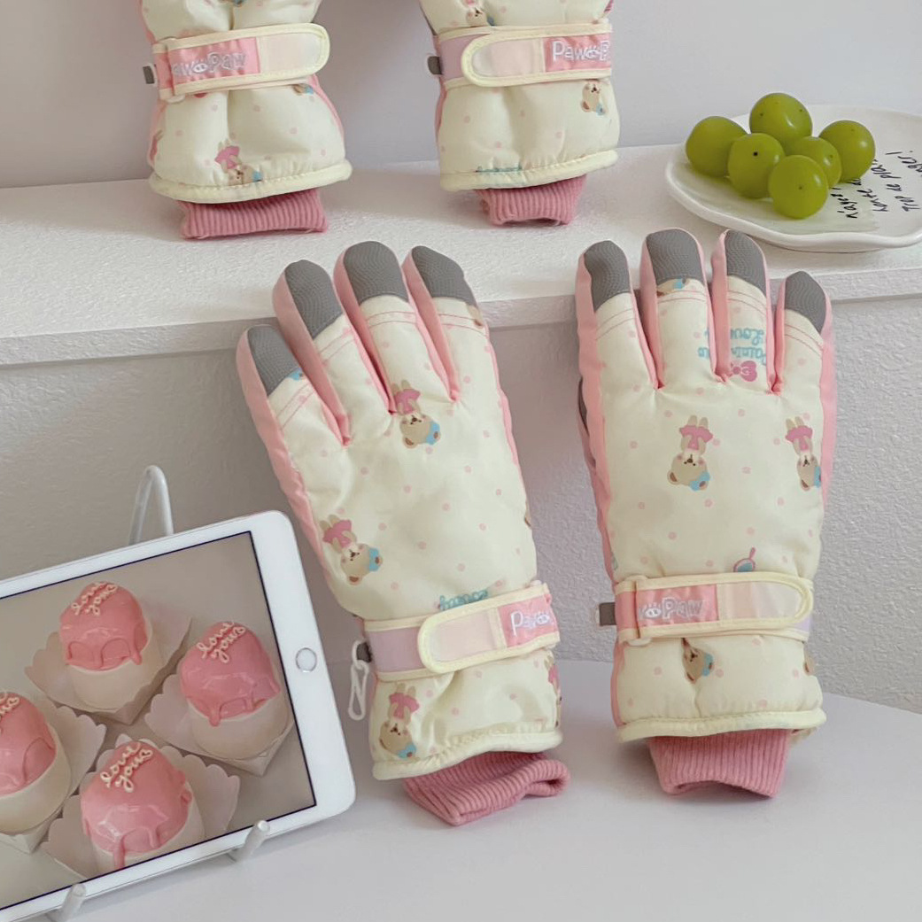Мягкие лыжные перчатки для девочек в Корейском стиле, милый медведь, зимние теплые Нескользящие уличные ветрозащитные перчатки на пять пальцев с флисовой подкладкой