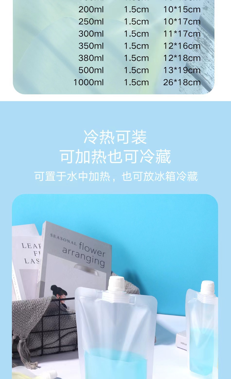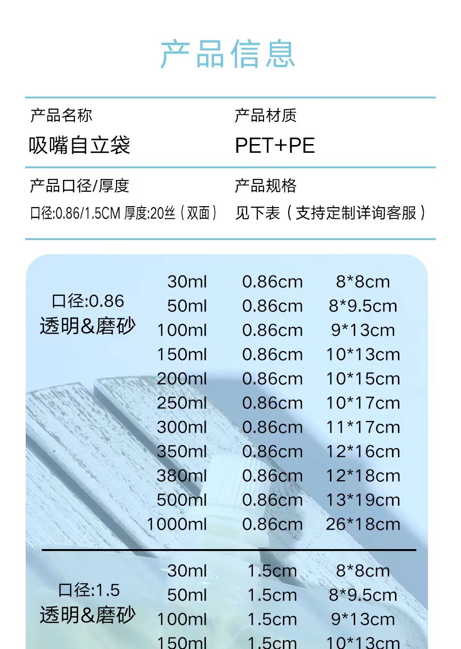 0.86 прозрачный 30ml(8.8 2.5); 0.86 прозрачный 50ml(8*9.5 2.5); 0.86 маленький прозрачный 100ml(9*13 2.5); 0.86 маленький прозрачный 150ml(10*13 3); 0.86 маленький прозрачный 200ml(10*15 3); 0.86 маленький прозрачный 250ml(10*17 3); 0.86 маленький прозрачный 300ml(11*17 3); 0.86 маленький прозрачный 380ml(12*18 3); 0.86 маленький прозрачный 500ml(13*19 3); 1.5 Большой прозрачный мешок 30ml(8*8 2.5); 1,5 большой прозрачный мешок 50ml(8*9.5 2.5); 1.5 Большой прозрачный мешок 100ml(9*13 2.5); 1,5 большой прозрачный мешок 150ml(10*13 3); 1,5 большой прозрачный мешок 200ml(10*15 3); 1.5 Большой прозрачный мешок 250ml(10*17 3); 1,5 большой прозрачный мешок 300ml(11*17 3); 1.5 Большой прозрачный мешок 380ml(12*18 3); 1,5 большой прозрачный мешок 500ml(13*19 3); 0,86 матовый 30ml(8*8 2.5); 0,86 скраба 50ml(8*9 2.5); 0,86 скраба 100ml(9*13 2.5); 0,86 маленький рот матовый 150ml(10*13 3); 0,86 матовый 200ml(10*15 3); 0.86 Малый рот скраб 250ml(10*17 3); 0,86 скраба 300ml(11*17 3); 0,86 маленький рот матовый 380ml(12*18 3.); 0,86 скраба 50ml(13*19 3); 1,5 мешок с большим ртом 30ml(8*8 2.5); 1,5 большой рот матовый мешок 50ml(9*13 2.5); 1.5 Большой рот матовый мешок 100ml(9*13 2.5); 1,5 большой рот матовый мешок 150ml(10*13 3); 1,5 мешок с матовым матом 200ml(10*15 3); 1,5 большой рот матовый мешок 250ml(10*17 3); 1,5 большой рот матовый мешок 300ml(11*17 3); 1.5 Большой рот матовый мешок 380ml(12*18 3); 1,5 большой рот матовый мешок 500ml(13*19 3); Наклонный рот 250ml0.86 калибра прозрачный мешок; Наклонный рот 420ml0.86 калибра прозрачный мешок PE; Косый рот 500ml0.86 калибра прозрачный мешок PE