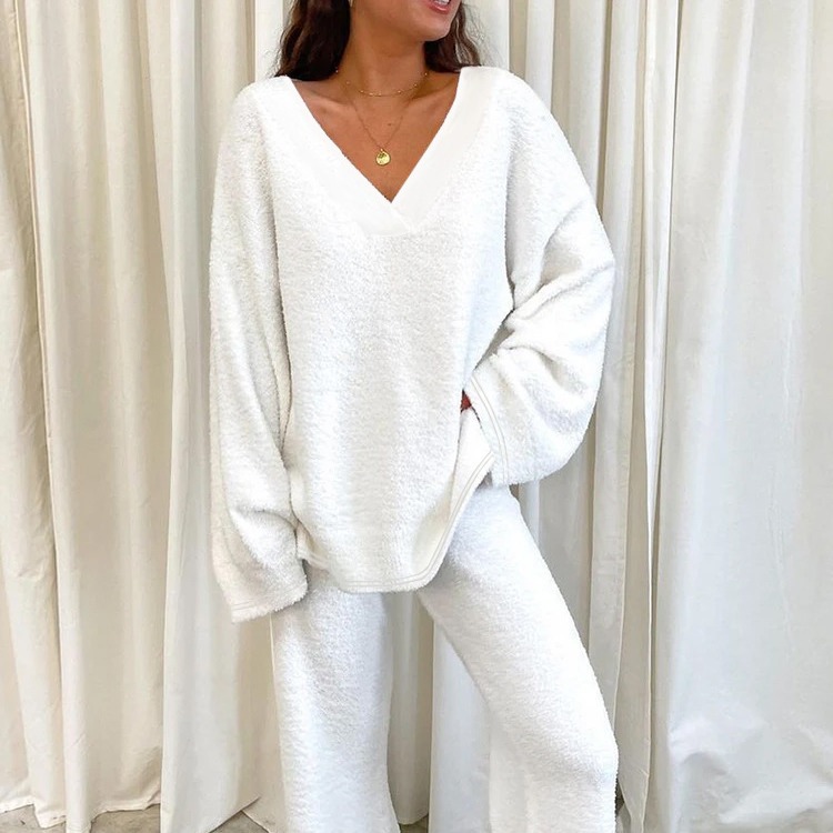 Женский костюм больших размеров, европейский и американский зимний удобный однотонный Повседневный теплый домашний костюм из двух частей с V-образным вырезом