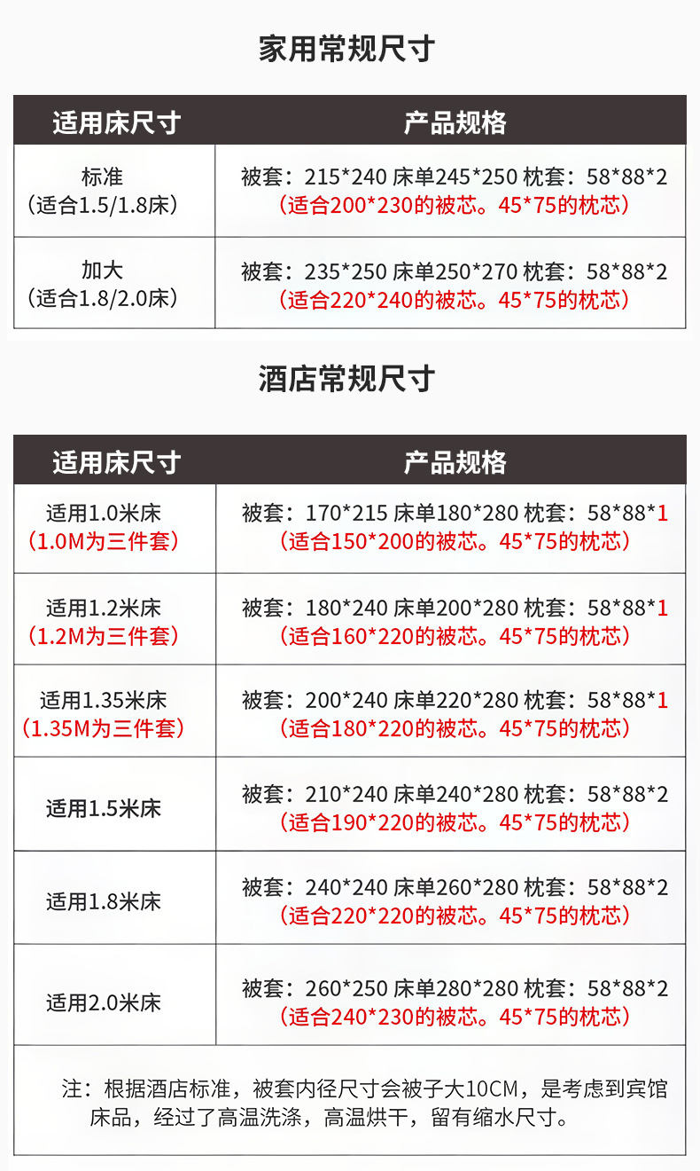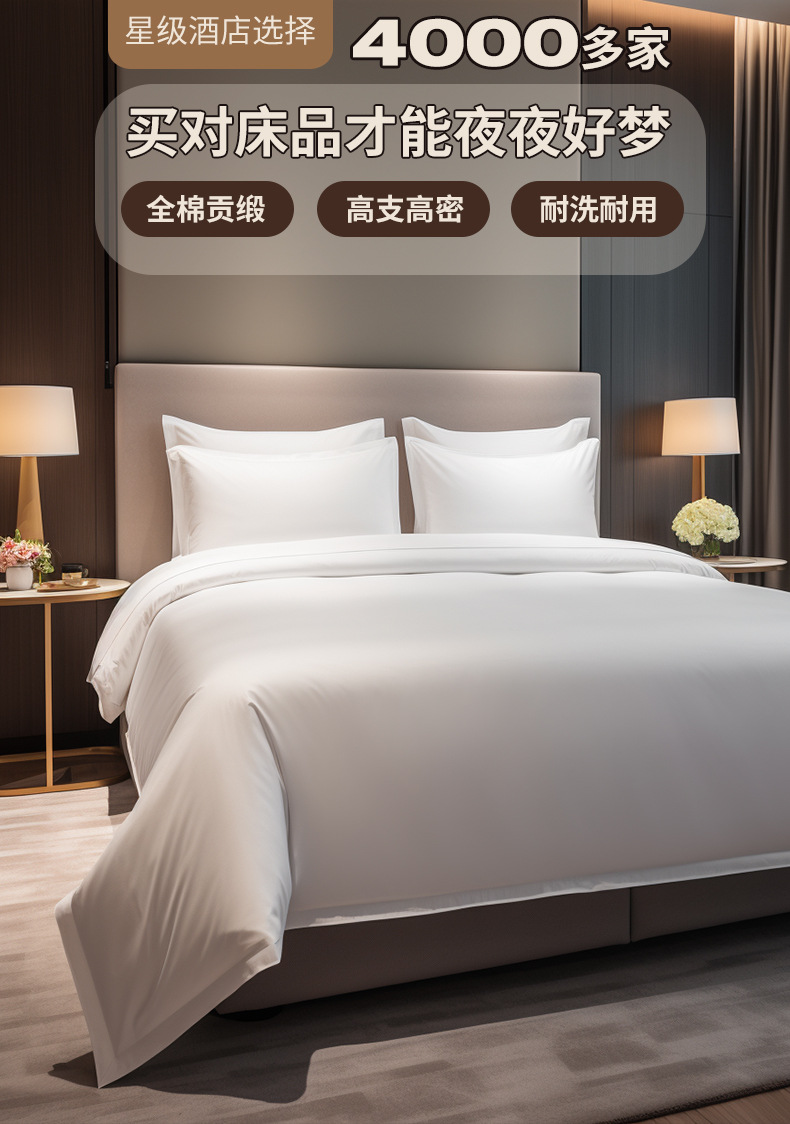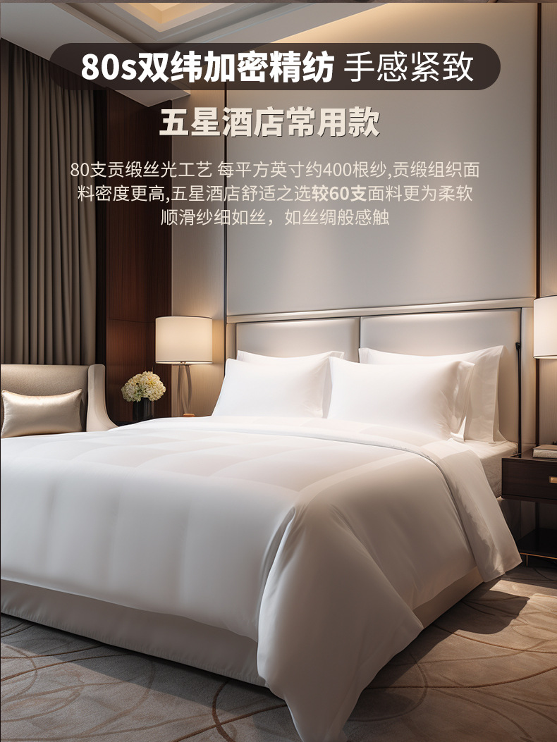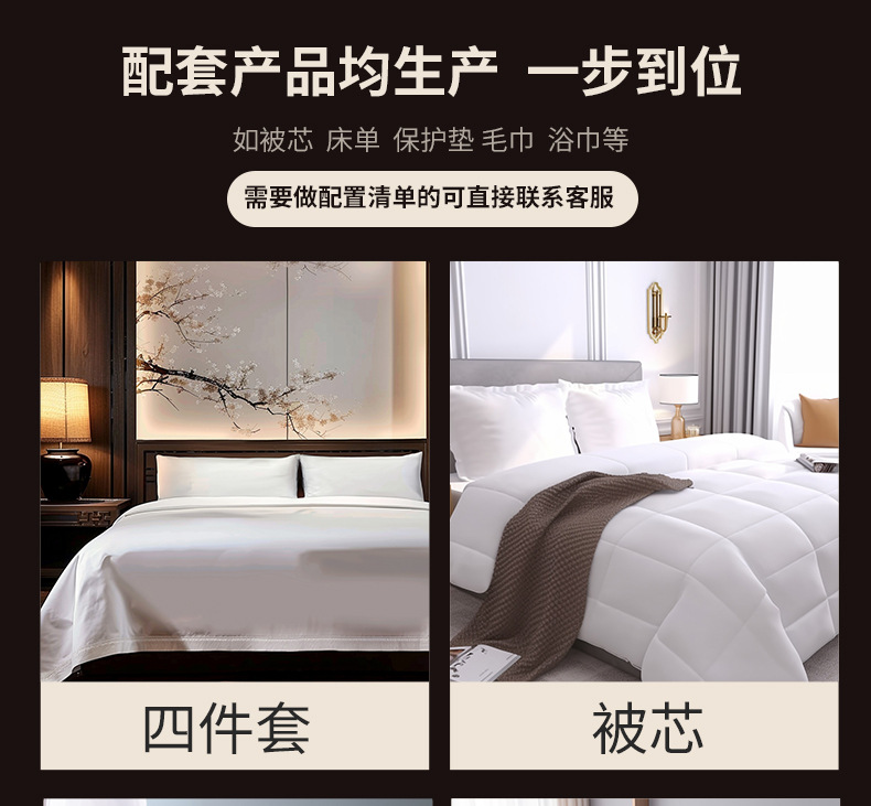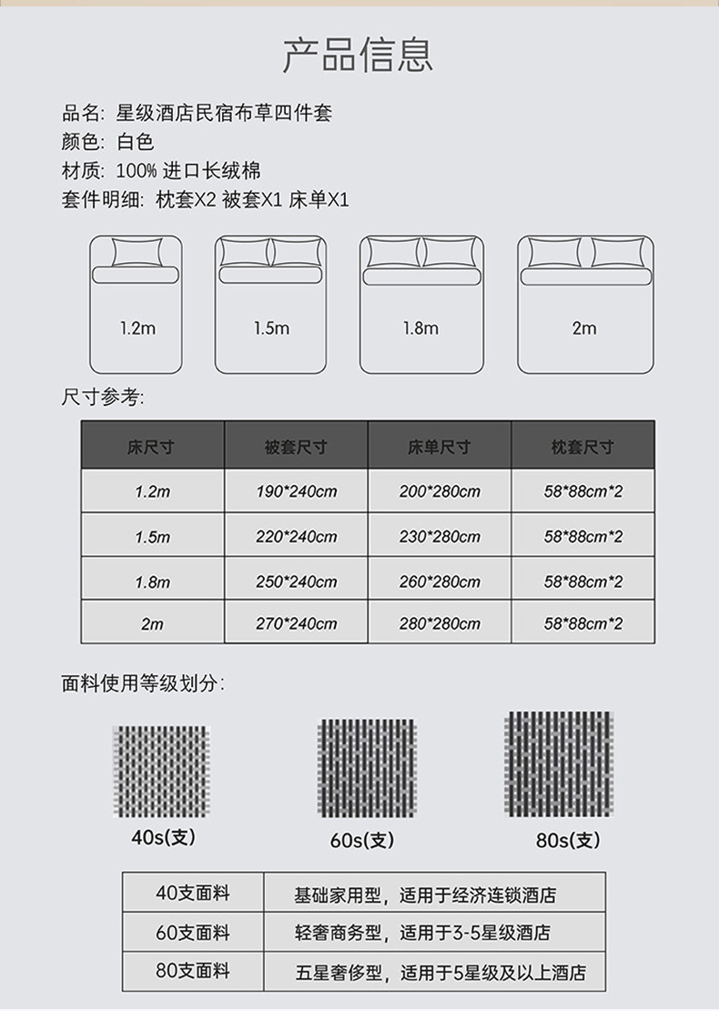 Комплект из трех предметов для гостиничной кровати 1.0m (применимо к одеялу 150*200); Комплект из трех предметов для гостиничной кровати 1.2m (применимо к одеялу 160*220); Комплект из трех предметов для гостиничной кровати 1.35m (применимо к одеялу 180*220); Комплект из четырех предметов для гостиницы с 1.5m кроватью (применимо к одеялу 190*220); Комплект из четырех предметов для гостиничной кровати 1.8m (применимо к одеялу 220*220); Комплект из четырех предметов для гостиничной кровати 2.0m (применимо к одеялу 240*230); Простыня 1М 180х280см; Пододеяльник 1М 170х215см; 1М наволочка 58х88см; Сердцевина одеяла 1м 150х200см (ткань, устойчивая к перьям); Мягкая подушка 1 м, 45X75 см (чистое перо, шелк, хлопок), 1200 г.; Защитная накладка 1М 200GSM; Защитная накладка 1М 300GSM; Простыня 1,2 м 200X280 см; Пододеяльник 1,2М 180Х240см; Наволочка 1,2М 58х88см; Сердцевина одеяла 1,2 м 160X220 см (ткань, устойчивая к перьям); Мягкая подушка 1,2 м, 45X75 см (чистое перо, шелк, хлопок), 1200 г.; Защитная накладка 1,2 м, 200 GSM; Защитная накладка 1,2 м, 300 GSM; Простыня 1,35М 220х280см; Пододеяльник 1,35М 200х240см; Наволочка 1,35М 58Х88см; Сердцевина одеяла 1,35 м 160X220 см (ткань, устойчивая к перьям); Мягкая подушка 1,35 м, 45X75 см (чистое перо, шелк, хлопок), 1200 г.; Защитная накладка 1,35 м, 200 GSM; Защитная накладка 1,35 м, 300 GSM; Простыня 1,5М 230х280см; Пододеяльник 1,5М 210Х240см; Наволочка 1,5М 58Х88см; Сердцевина одеяла 1,5 м 190X220 см (ткань, устойчивая к перьям); Мягкая подушка 1,5 м, 45X75 см (чистое перо, шелк, хлопок), 1200 г.; Защитная накладка 1,5 м, 200 GSM; Защитная накладка 1,5 м, 300 GSM; Простыня 1,8М 260X280см; Пододеяльник 1,8М 240Х240см; Наволочка 1,8М 58Х88см; Сердцевина одеяла 1,8 м 220X220 см (ткань, устойчивая к перьям); Мягкая подушка 1,8 м, 45X75 см (чистое перо, шелк, хлопок), 1200 г.; Защитная накладка 1,8 м, 200 GSM; Защитная накладка 1,8 м, 300 GSM; Простыня 2М 280х280см; Пододеяльник 2М 260Х250см; Наволочка 2М 58Х88см; Сердцевина одеяла 2М 240X230см (ткань, устойчивая к перьям); Мягкая подушка 2М, 45х75см (чистое перо, шелк, хлопок), 1200г.; Защитная накладка 2М 200GSM; Защитная накладка 2М 300GSM