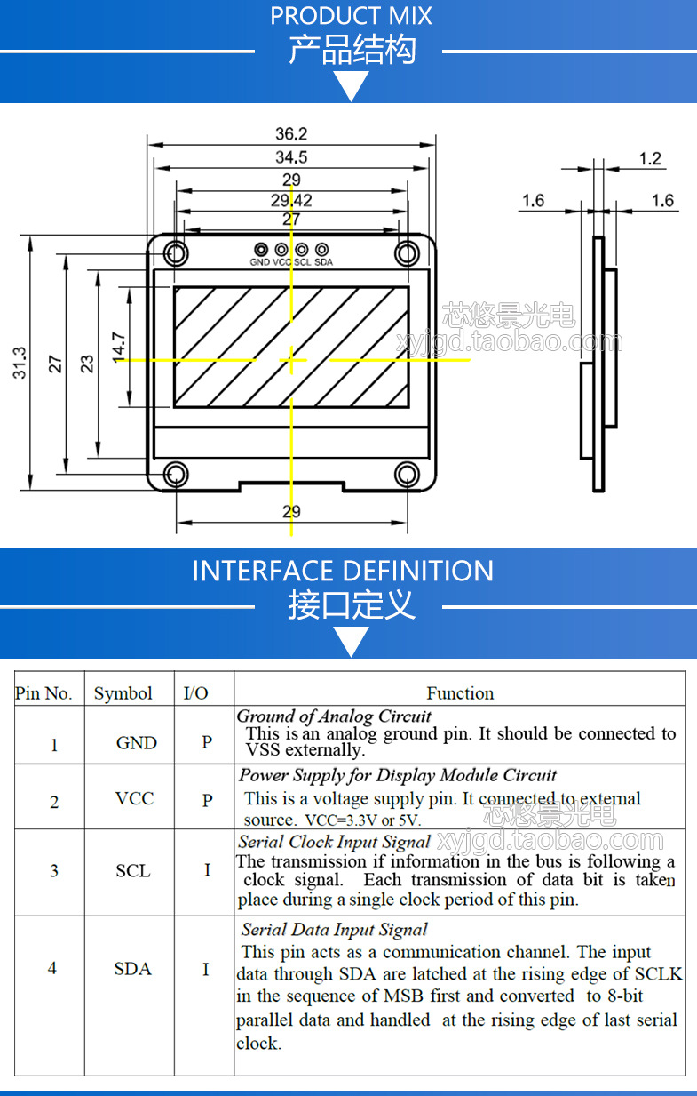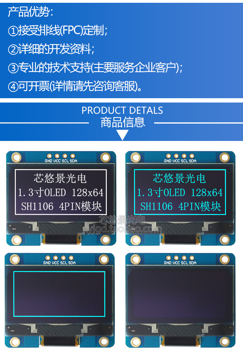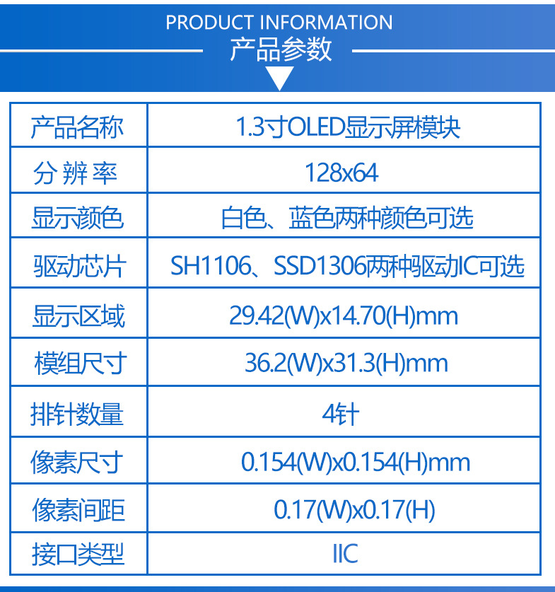 默认发白光、SH1106驱动、不焊针、不送针,如需要指定颜色、驱动IC、要焊针、送针,请联系客服!
