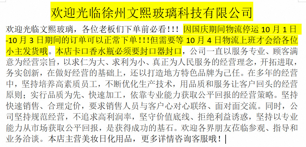 徐州文熙玻璃科技有限公司是香水瓶、化妆品包装瓶、玻璃瓶、啤酒瓶、香薰瓶等产品专业生产加工的公司,拥有完整、科学的质量管理体系。公司一直以服务专业、顾客满意为经营宗旨,以求仁为大、求利为小、真正为人民服务的经营理念,开拓进取,务实创新,在做好经营的基础上,还以打造地方品牌为己任。在多年的经营中,坚持培养高素质员工,不断优化生产技术,用品质和服务让客户回头的经营原则;实行品质为先、快速加工,依靠专业能力获取公平回报的经营策略。坚持快速销售、合理定价,要求销售人员与客户心对心联络、面对面交流。同时,公司坚持规范经营,不追求高利润率,坚守价值底线、拒绝利益诱惑,坚持以专业能力从市场获取公平回报,是获得成功的基石。欢迎各界朋友莅临参观、指导和业务洽谈。