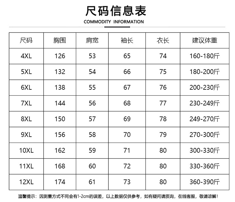 Рекомендуется 4XL 80-90kg; Рекомендуется 5XL 90-100kg; Рекомендуется 6XL 100-115kg; Рекомендуется 7XL 115-124.5kg; 8XL рекомендуется 124.5-135kg; Рекомендуется 9XL 135-150kg; Рекомендуется 10XL 150-165kg; Рекомендуется 11XL 165-180kg; Рекомендуется 12XL 180-195kg