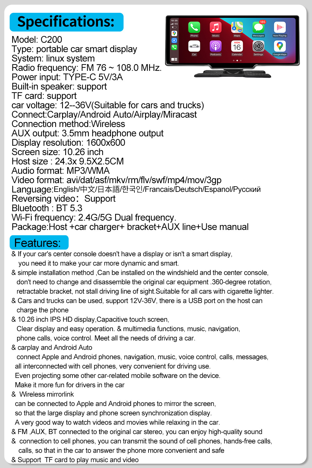 10.26inch Автомобильный смарт-экран Carplay+Android Auto (международная английская версия)