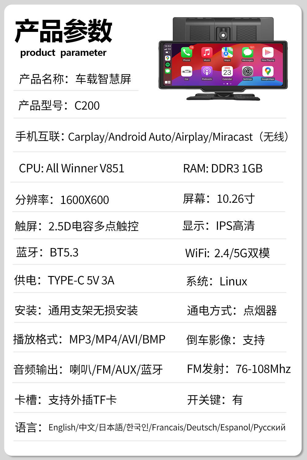 10.26寸IPS便携式中控台无线Carplay/Auto手机投屏车载智慧屏双蓝牙