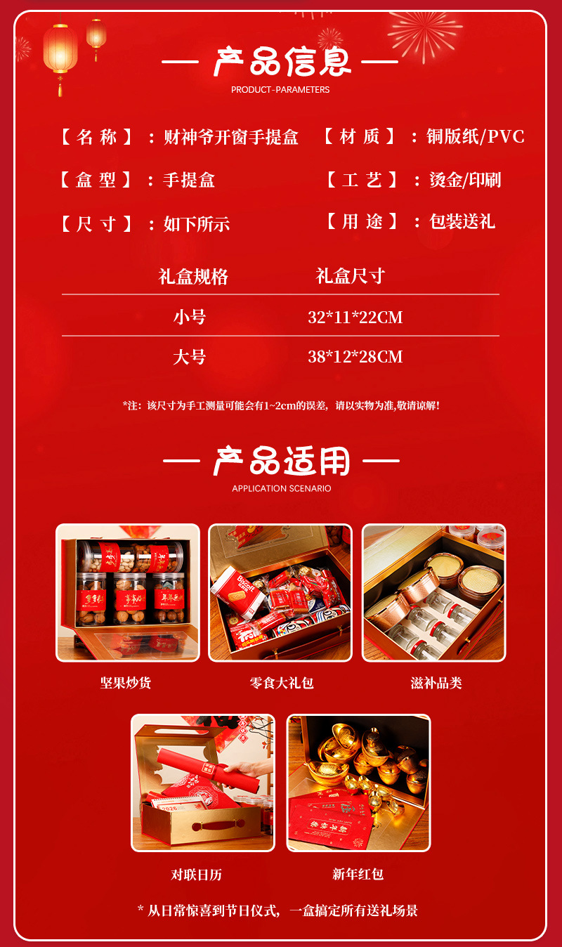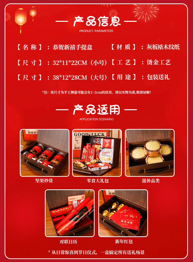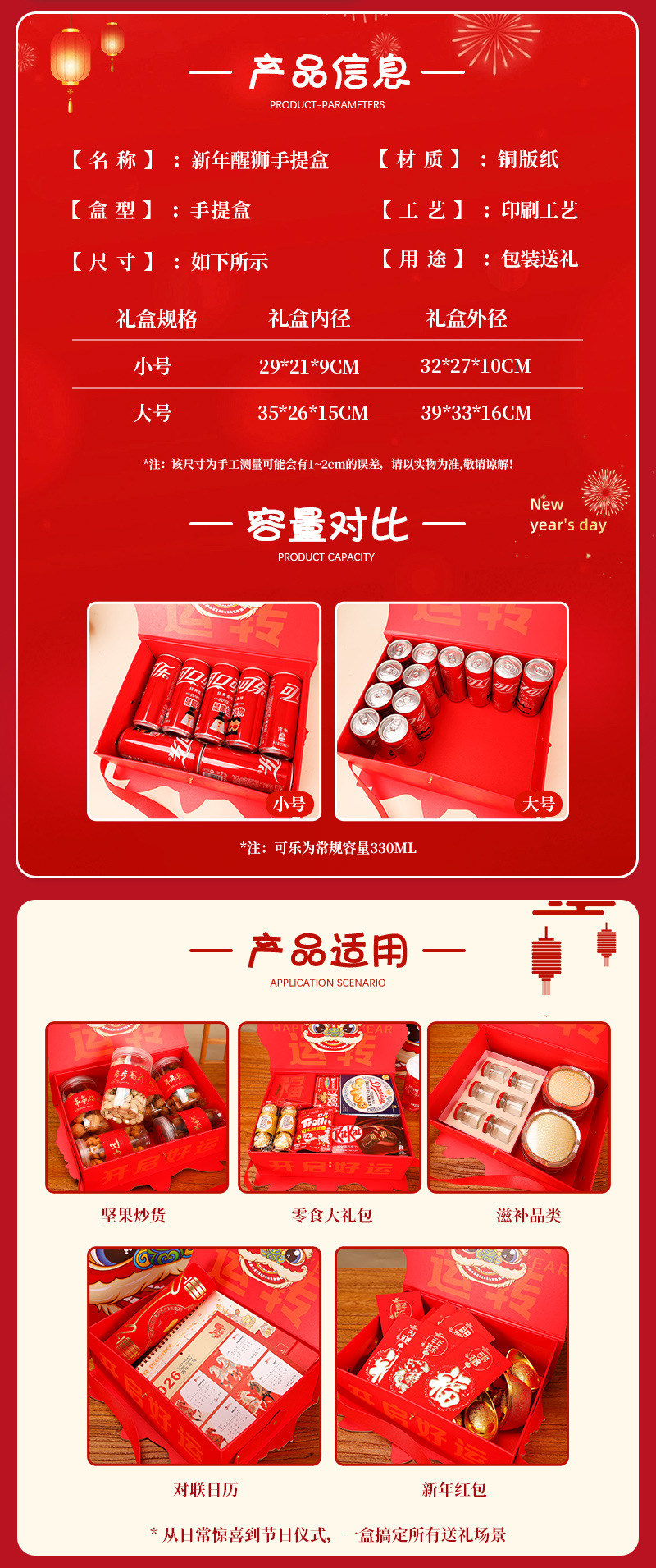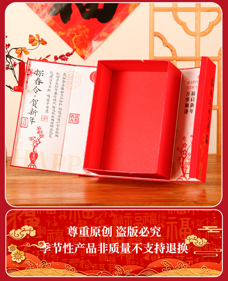 С Новым годом двойная коробка (пустая коробка + подарочный пакет) 29*21*9 см; Ведро благословений, небольшой размер 20*21 см; Круглая коробка красного цвета среднего размера 18*16,5 см.; Круглая коробка красного цвета большого размера 20*22 см.; Красная маленькая квадратная коробка, 23*18*14 см; Квадратная коробка красного цвета большого размера 30*20*16 см.; С Новым годом двойная коробка (пустая коробка + подарочный пакет) 35*26*11 см; Подарочная коробка «Танец Льва» - Маленькая (30*22*10 см); Подарочная коробка «Танец Льва» - Большой размер: 35*27*15 см; Круглая коробка красного цвета, небольшого размера, 10*13 см.; Коробка «Мгновенное счастье» с крышкой «Небо и Земля» 20*18*8 см (включая подарочный пакет); Коробка «Мгновенное Счастье» с крышкой, размеры 29*21*9 см (включает подарочный пакет); Квадратная коробка-красная среднего размера 19*14*12см.; Квадратная коробка-красная большого размера 24*18*14,5 см.; Квадратная коробка-красная, небольшой размер 14*9*8 см.; Круглая коробка-красная небольшого размера 10*14см.; Станьте богатым мгновенно! Оконная коробка большого размера 38*12*28 см; Круглая коробка-красная большого размера 19,5*21см.; Круглая коробка-красная среднего размера 16,5*17,5 см.; Счастливый и прибыльный большой размер 36*28*12 см; Lucky Fortune Маленький размер 30*25*10 см; Ротанговый чемодан 30*21*12 см; Деревянная шкатулка «Счастье и Процветание» 56,5*11*18,5 см (включая пояс); Поздравляем с Новым годом! Портативная коробка небольшого размера: 32*11*22 см.; Поздравляем с Новым годом! Портативная коробка большого размера 38*12*28 см; Назначенная трёхмерная коробка Fortune 32*27*11 см (включая подарочный пакет); Caiju Bafang Большой размер 37*14,5*30 см (включая подарочный пакет); Получите деньги мгновенно, компактный портативный размер 32*22*10 см; Открывающийся портативный деревянный ящик 24*10,5*35 см; Caiju Bafang небольшой размер 34*11,5*25 см (включая подарочный пакет); Получите деньги немедленно, большой размер 38*28*12 см.; Золотая лошадь Xianrui, ручная коробка, средний размер 35*14*26 см; Сумка Golden Horse Xianrui большого размера 45*18*29см.; Ведро благословений, большой размер 25*33 см; Ежедневная пустая подарочная коробка золотого цвета 37*26*21 см; Пустая подарочная коробка Fulai 37*26*21 см