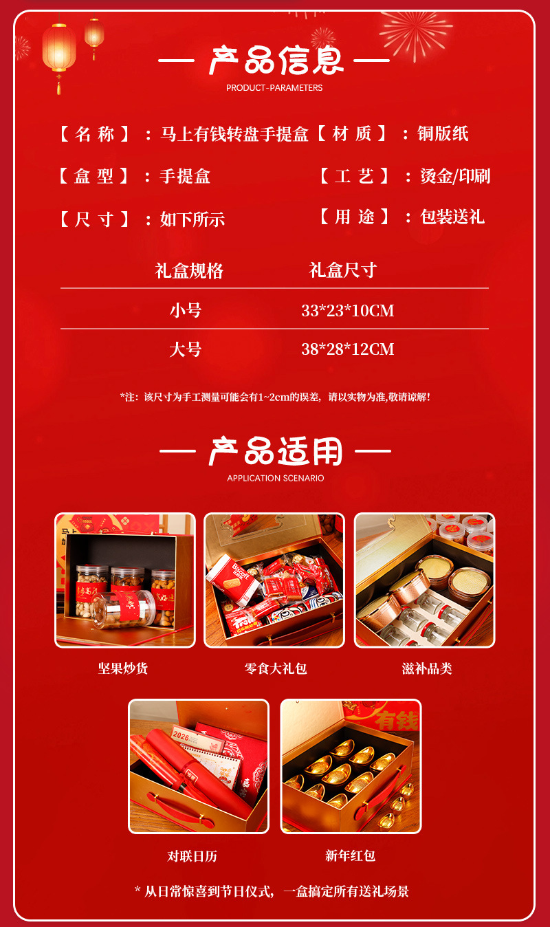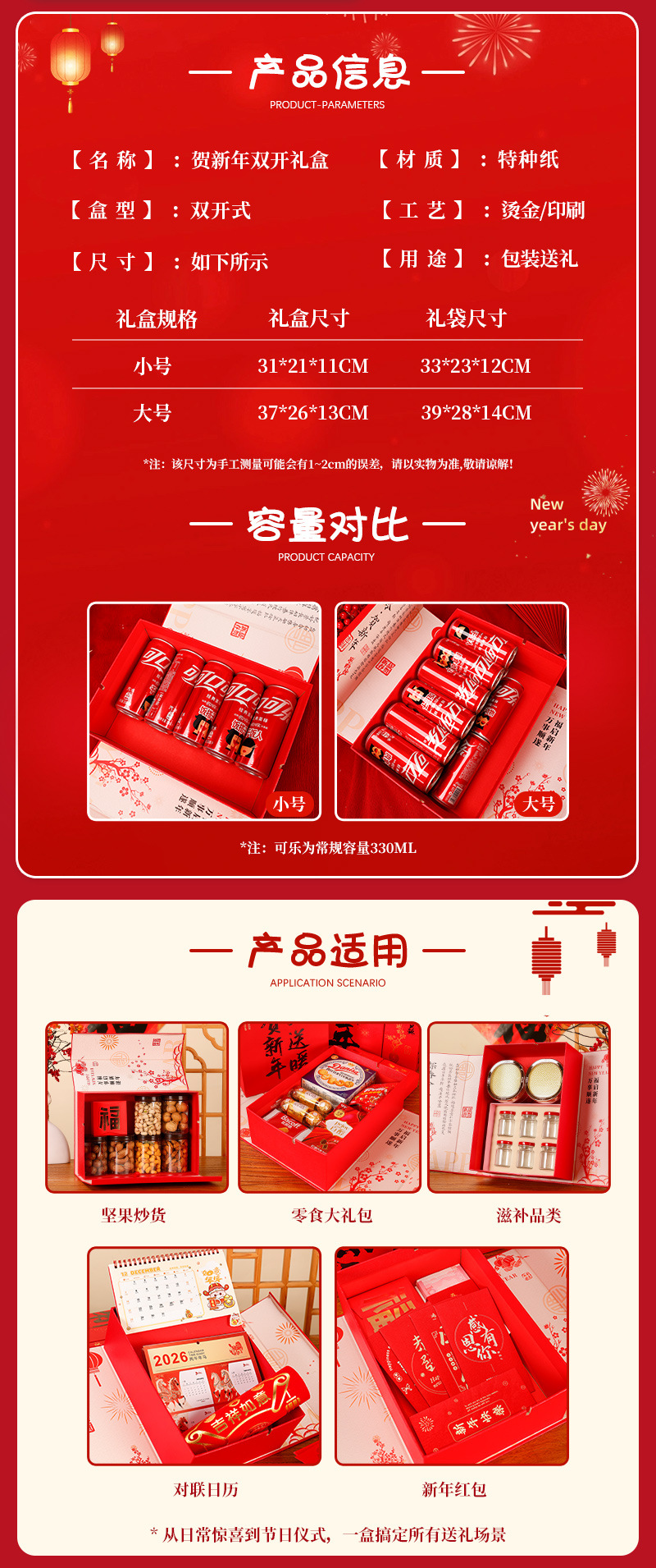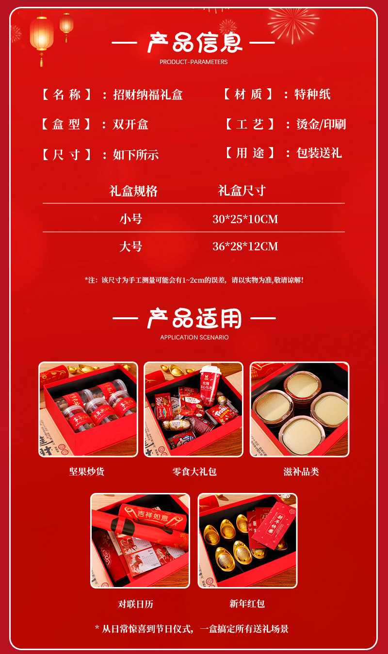 С Новым годом двойная коробка (пустая коробка + подарочный пакет) 29*21*9 см; Ведро благословений, небольшой размер 20*21 см; Круглая коробка красного цвета среднего размера 18*16,5 см.; Круглая коробка красного цвета большого размера 20*22 см.; Красная маленькая квадратная коробка, 23*18*14 см; Квадратная коробка красного цвета большого размера 30*20*16 см.; С Новым годом двойная коробка (пустая коробка + подарочный пакет) 35*26*11 см; Подарочная коробка «Танец Льва» - Маленькая (30*22*10 см); Подарочная коробка «Танец Льва» - Большой размер: 35*27*15 см; Круглая коробка красного цвета, небольшого размера, 10*13 см.; Коробка «Мгновенное счастье» с крышкой «Небо и Земля» 20*18*8 см (включая подарочный пакет); Коробка «Мгновенное Счастье» с крышкой, размеры 29*21*9 см (включает подарочный пакет); Квадратная коробка-красная среднего размера 19*14*12см.; Квадратная коробка-красная большого размера 24*18*14,5 см.; Квадратная коробка-красная, небольшой размер 14*9*8 см.; Круглая коробка-красная небольшого размера 10*14см.; Станьте богатым мгновенно! Оконная коробка большого размера 38*12*28 см; Круглая коробка-красная большого размера 19,5*21см.; Круглая коробка-красная среднего размера 16,5*17,5 см.; Счастливый и прибыльный большой размер 36*28*12 см; Lucky Fortune Маленький размер 30*25*10 см; Ротанговый чемодан 30*21*12 см; Деревянная шкатулка «Счастье и Процветание» 56,5*11*18,5 см (включая пояс); Поздравляем с Новым годом! Портативная коробка небольшого размера: 32*11*22 см.; Поздравляем с Новым годом! Портативная коробка большого размера 38*12*28 см; Назначенная трёхмерная коробка Fortune 32*27*11 см (включая подарочный пакет); Caiju Bafang Большой размер 37*14,5*30 см (включая подарочный пакет); Получите деньги мгновенно, компактный портативный размер 32*22*10 см; Открывающийся портативный деревянный ящик 24*10,5*35 см; Caiju Bafang небольшой размер 34*11,5*25 см (включая подарочный пакет); Получите деньги немедленно, большой размер 38*28*12 см.; Золотая лошадь Xianrui, ручная коробка, средний размер 35*14*26 см; Сумка Golden Horse Xianrui большого размера 45*18*29см.; Ведро благословений, большой размер 25*33 см; Ежедневная пустая подарочная коробка золотого цвета 37*26*21 см; Пустая подарочная коробка Fulai 37*26*21 см