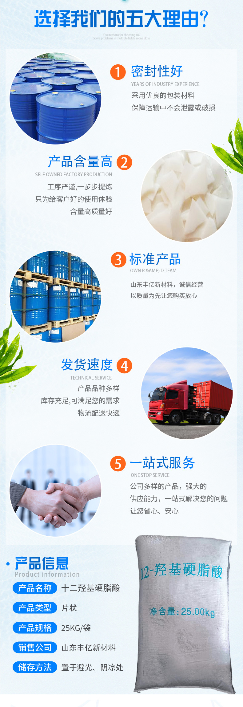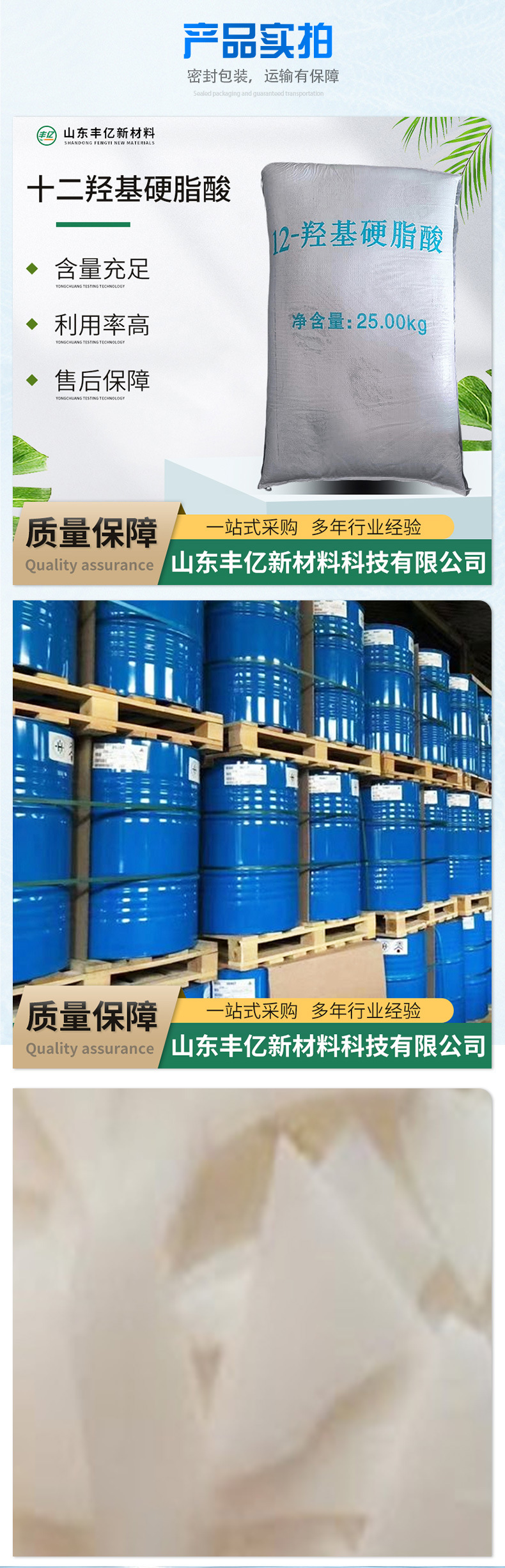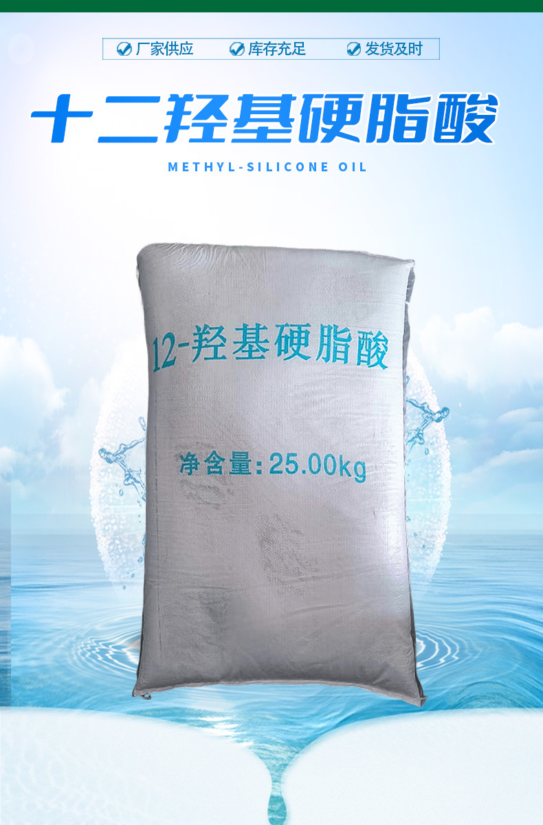 Двенадцатигидроксистеариновая кислота, текстильный загуститель, смазка, эмульгатор. 12-гидроксистеариновая кислота в наличии.