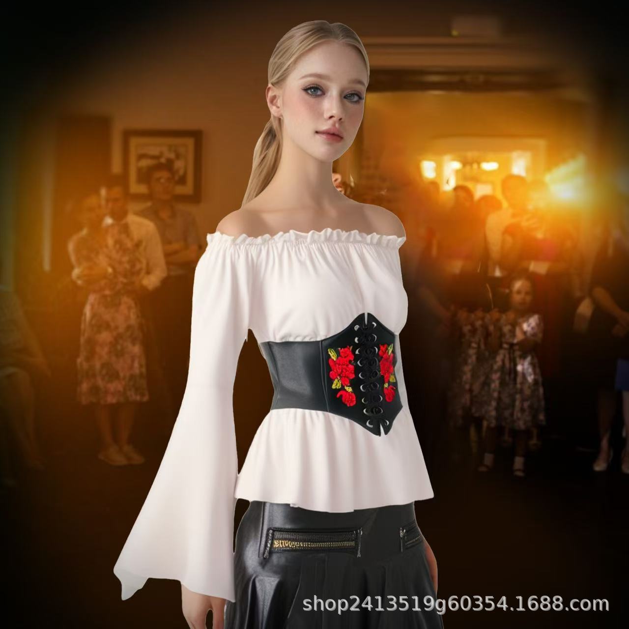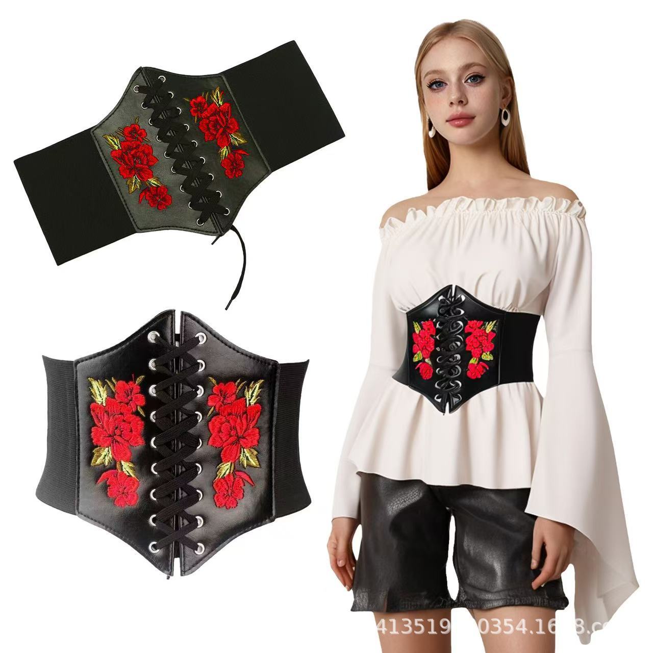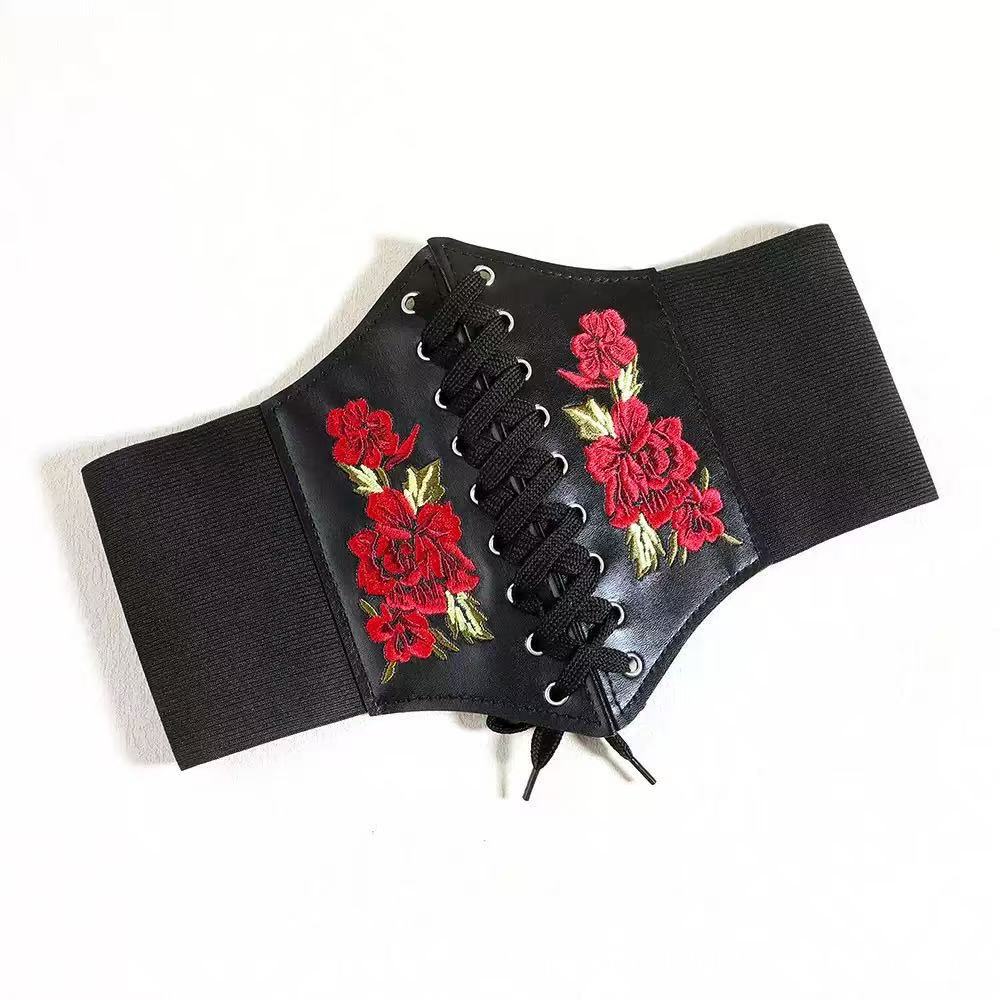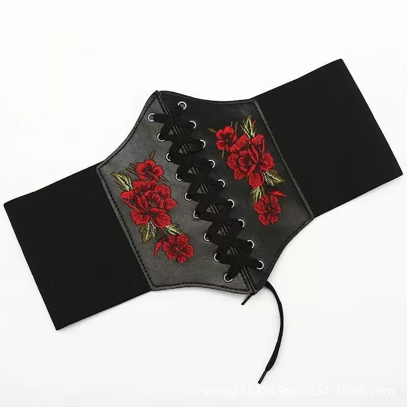 Прямые поставки с фабрики, пояс с вышивкой розами, широкий пояс во французском стиле, эластичный пояс-корсет, черный винтажный женский аксессуар.