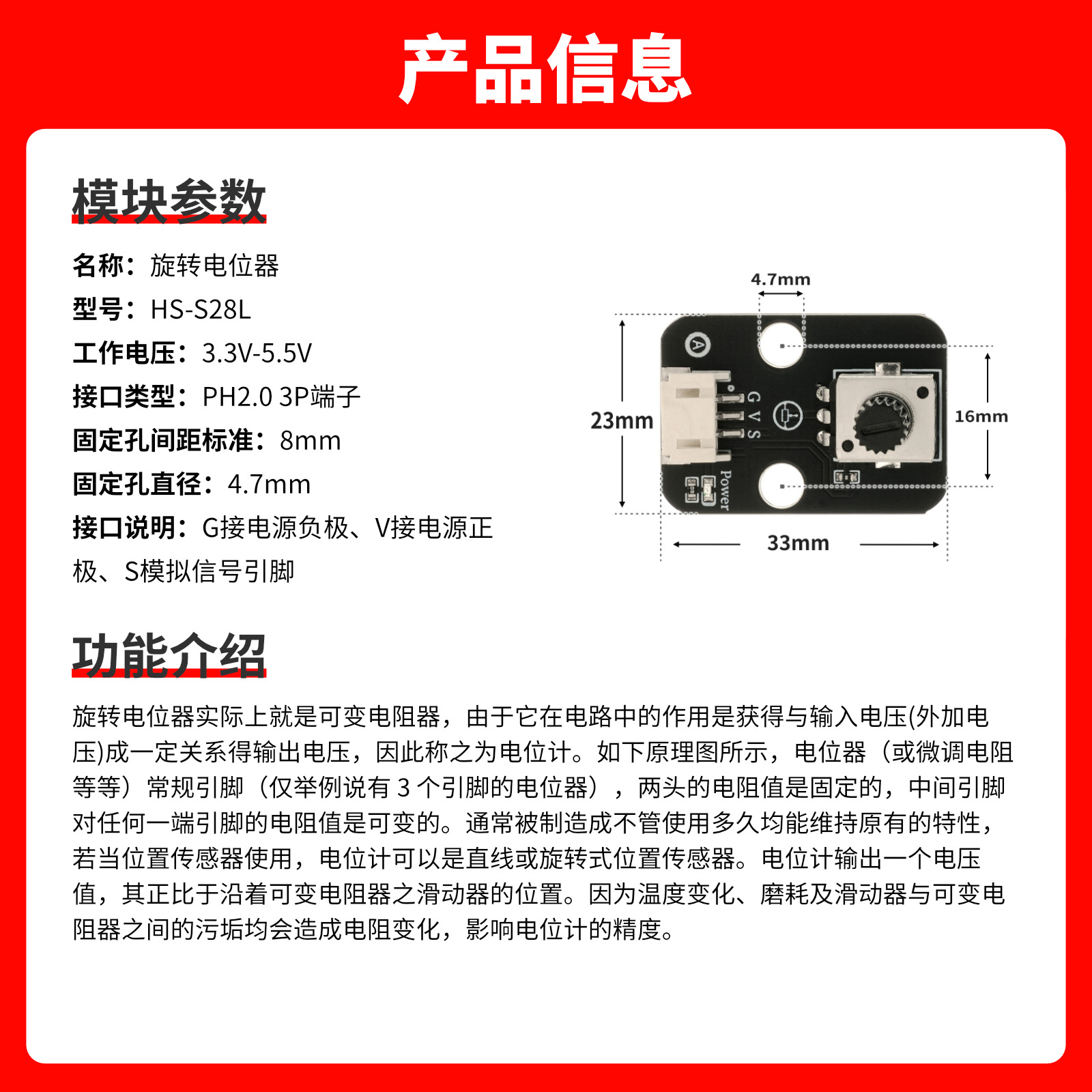 - 接口说明:G接电源负极、V接电源正极、S模拟信号引脚