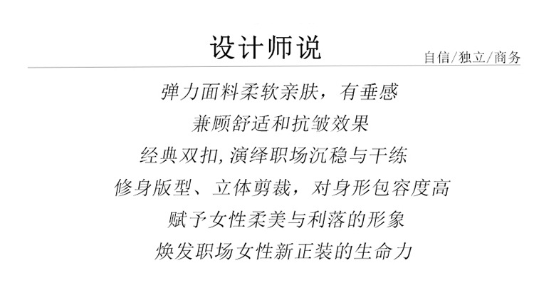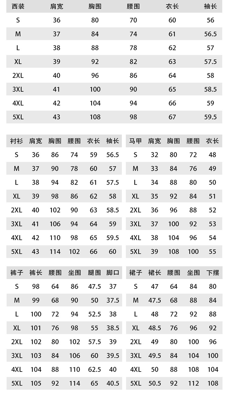 Черный костюм-слиток; Сплошной темно-синий костюм; Сплошной серый костюм; Цельный костюм с синим сапфиром; Черный костюм + брюки; Темно-синий костюм + брюки; Серый костюм + брюки; Сапфировый синий костюм + брюки; Черный костюм + юбка; Темно-синий костюм + юбка; Серый костюм + юбка; Сапфирово-синий костюм + юбка; 202 белая рубашка; 202 серая рубашка