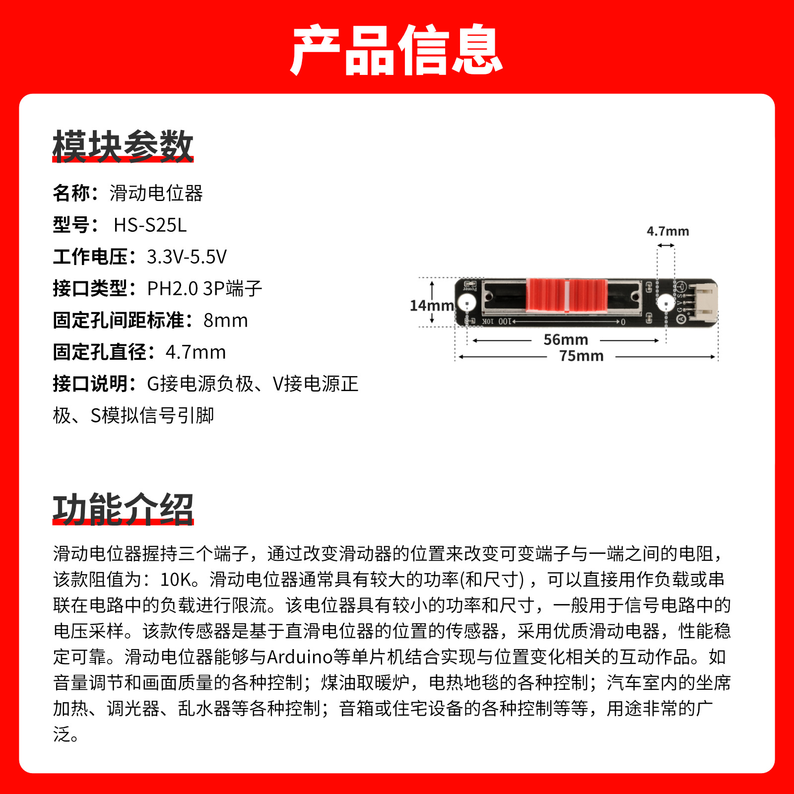 滑动电位器握持三个端子,通过改变滑动器的位置来改变可变端子与一端之间的电阻,该款阻值为:10K。滑动电位器通常具有较大的功率(和尺寸) ,可以直接用作负载或串联在电路中的负载进行限流。该电位器具有较小的功率和尺寸,一般用于信号电路中的电压采样。该款传感器是基于直滑电位器的位置的传感器,采用优质滑动电器,性能稳定可靠。滑动电位器能够与Arduino等单片机结合实现与位置变化相关的互动作品。如音量调节和画面质量的各种控制;煤油取暖炉,电热地毯的各种控制;汽车室内的坐席加热、调光器、乱水器等各种控制;音箱或住宅设备的各种控制等等,用途非常的广泛。