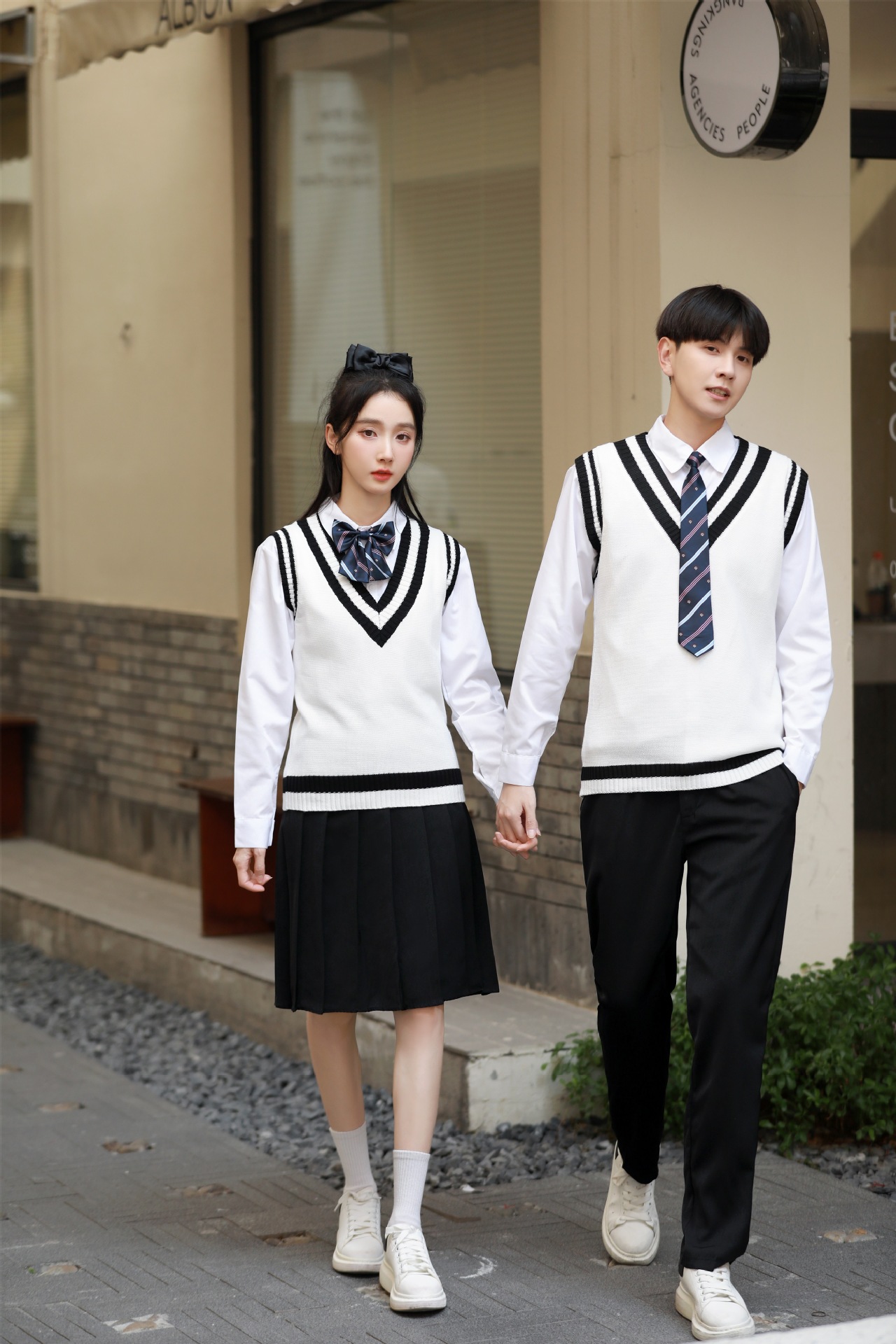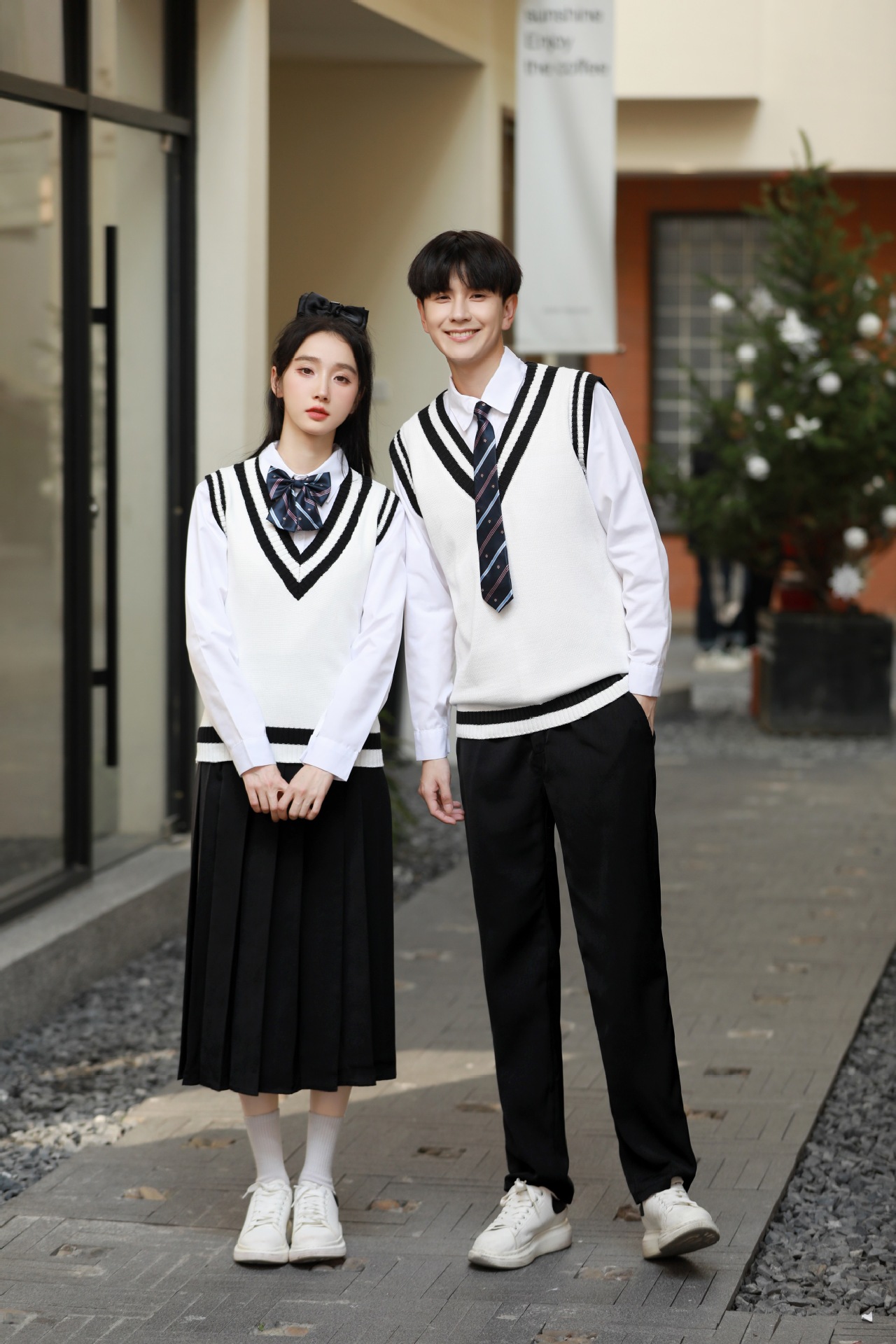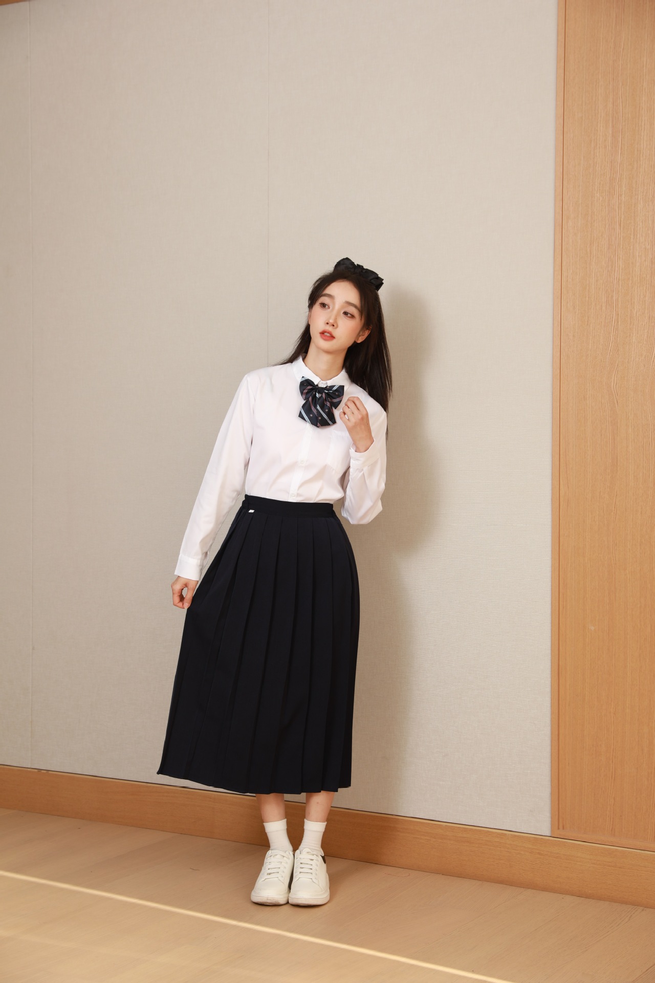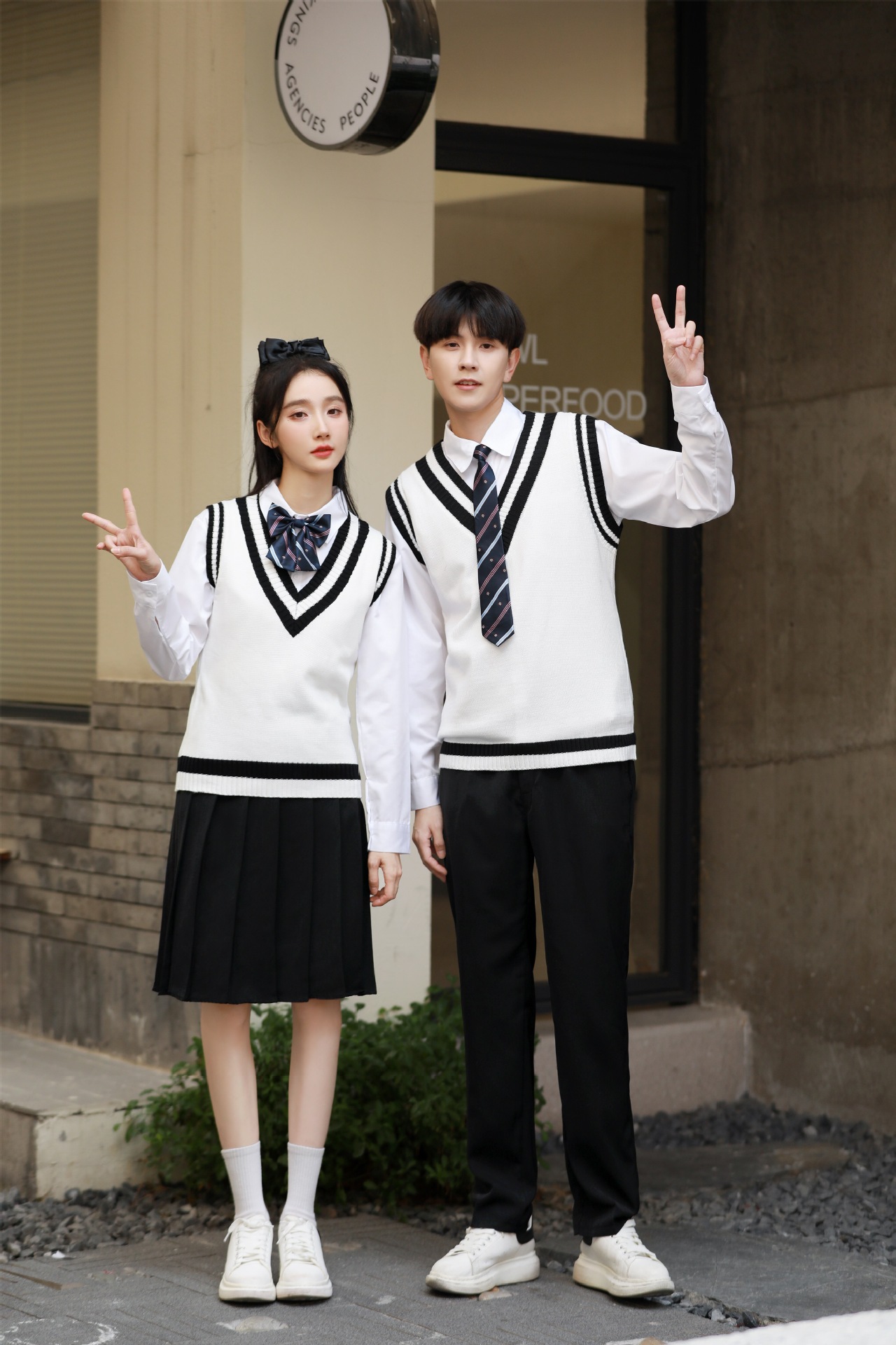 Женский белый длинный рукав + черная юбка + белый жилет + синий галстук-бабочка с короной; Женский белый длинный рукав + черное длинное платье + белый жилет + синий галстук с короной; Мужской белый длинный рукав + черные брюки + белый жилет + синий галстук с короной; Женская белая с длинным рукавом + темно-синяя юбка + корона-синий галстук-бабочка; Женщин белый длинный рукав + юбка среднего Плиссированные длинные юбки + Корона синий галстук-бабочка; Мужской белый длинный рукав + темно-синие брюки + Корона синий галстук; Белый жилет (одинаковый для мужчин и женщин)