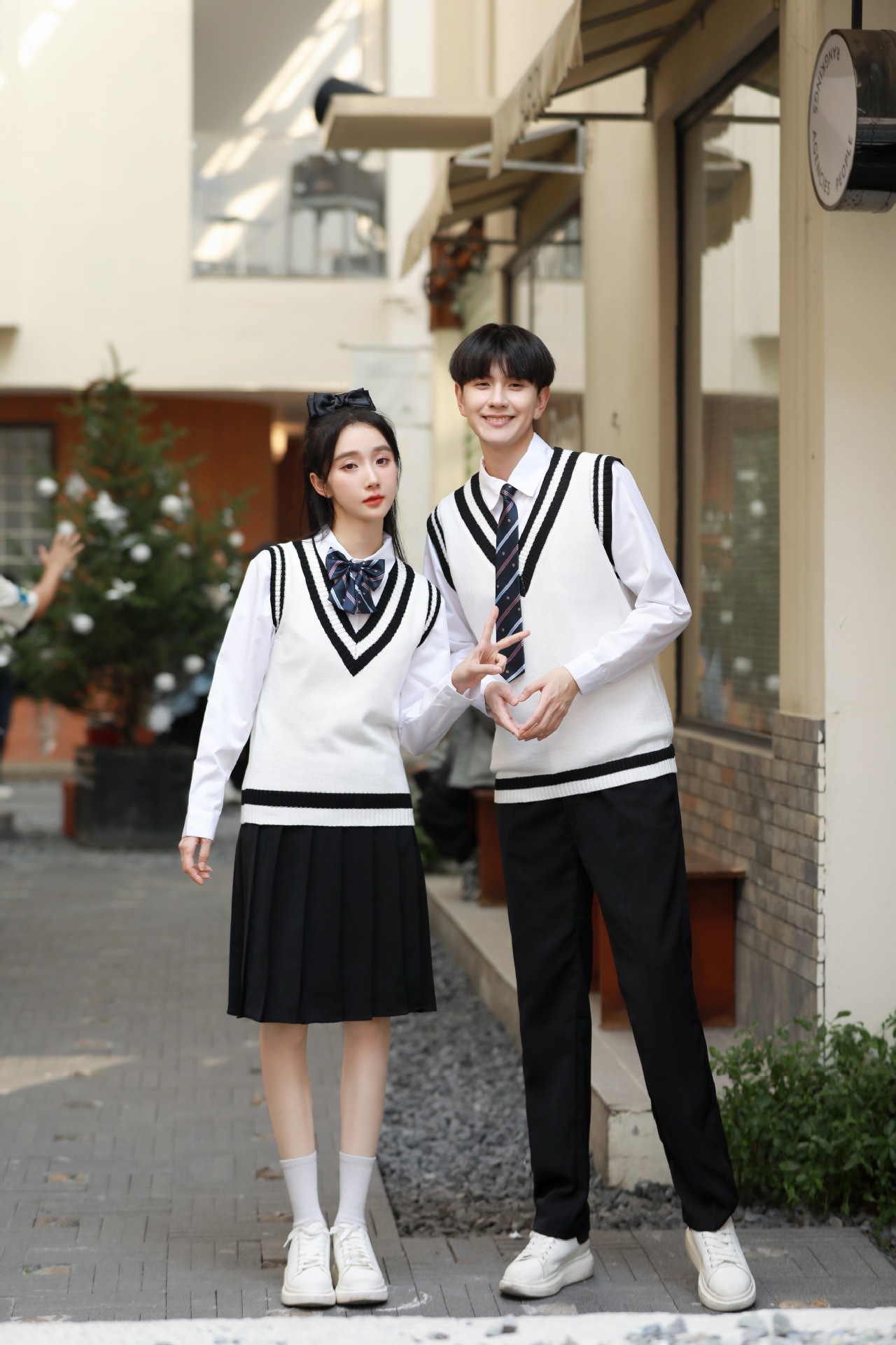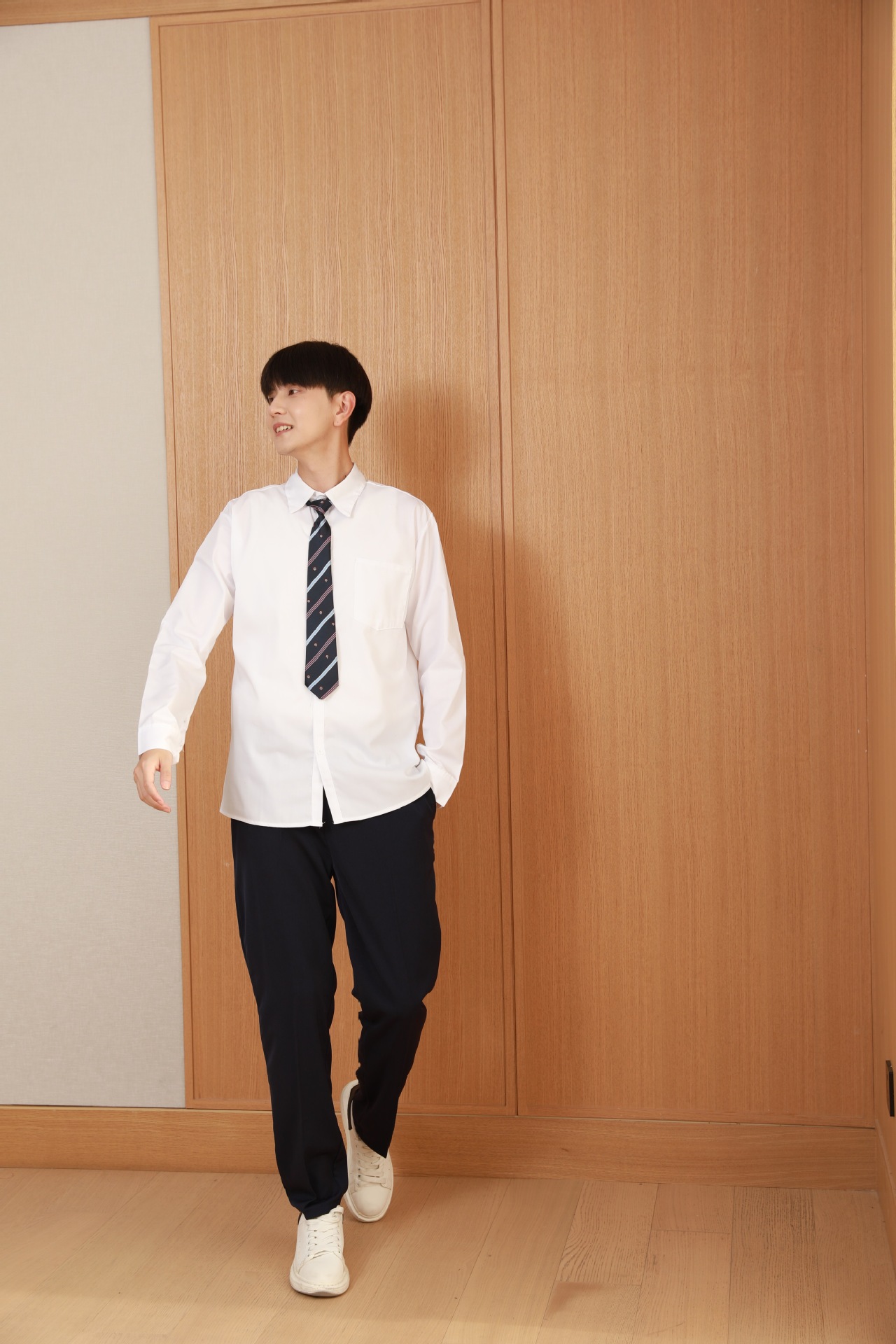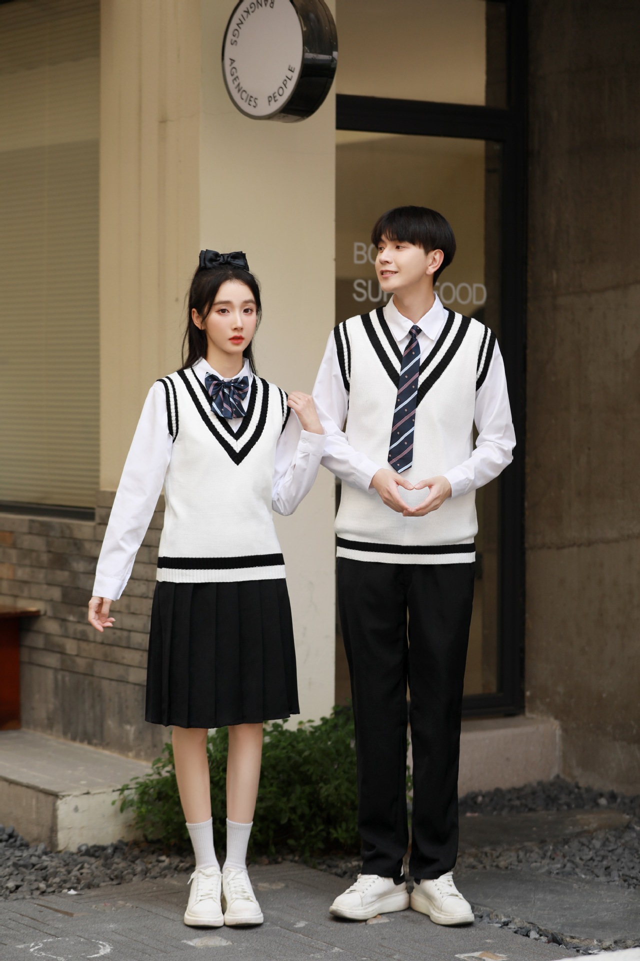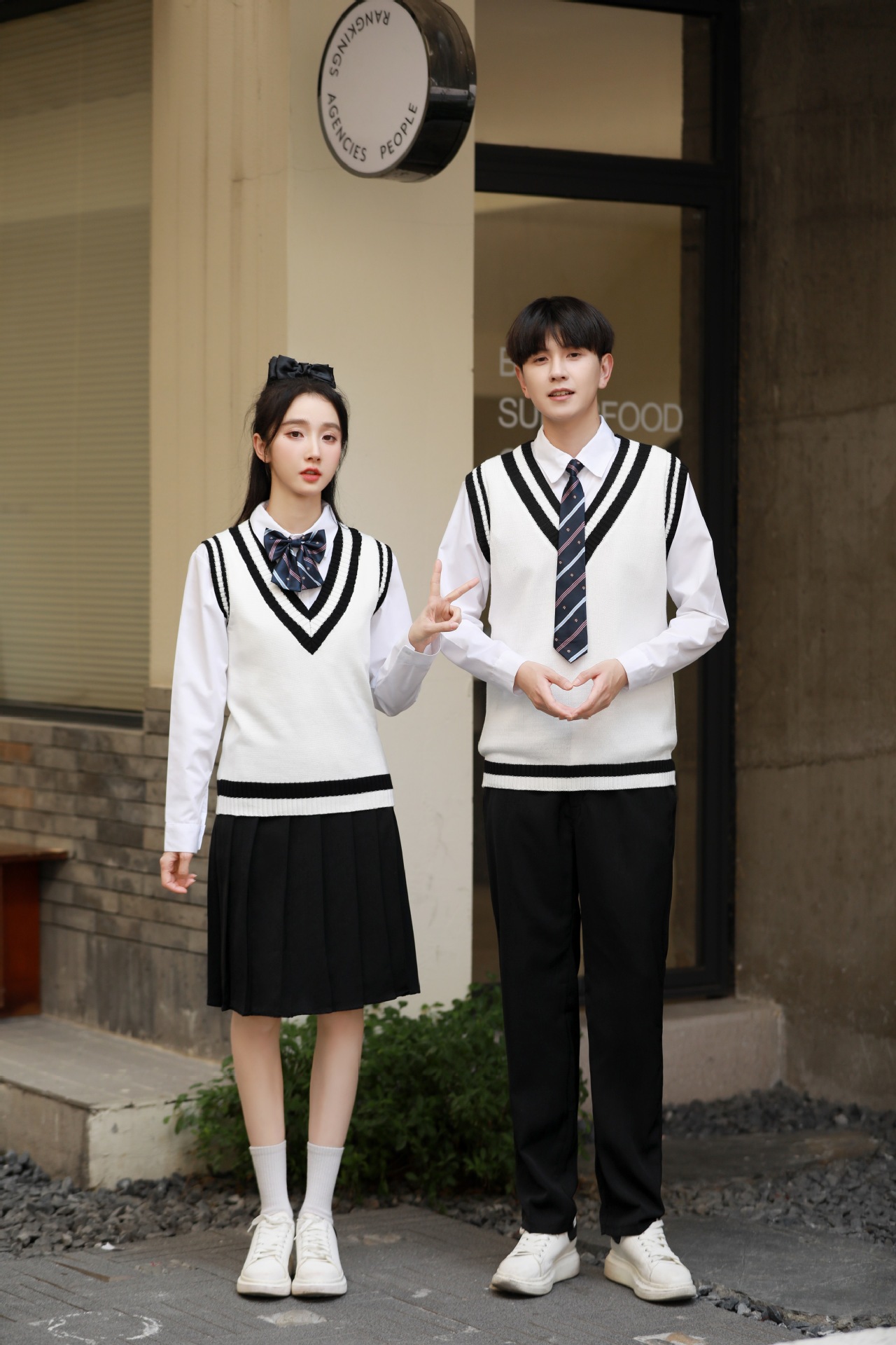 Женский белый длинный рукав + черная юбка + белый жилет + синий галстук-бабочка с короной; Женский белый длинный рукав + черное длинное платье + белый жилет + синий галстук с короной; Мужской белый длинный рукав + черные брюки + белый жилет + синий галстук с короной; Женская белая с длинным рукавом + темно-синяя юбка + корона-синий галстук-бабочка; Женщин белый длинный рукав + юбка среднего Плиссированные длинные юбки + Корона синий галстук-бабочка; Мужской белый длинный рукав + темно-синие брюки + Корона синий галстук; Белый жилет (одинаковый для мужчин и женщин)