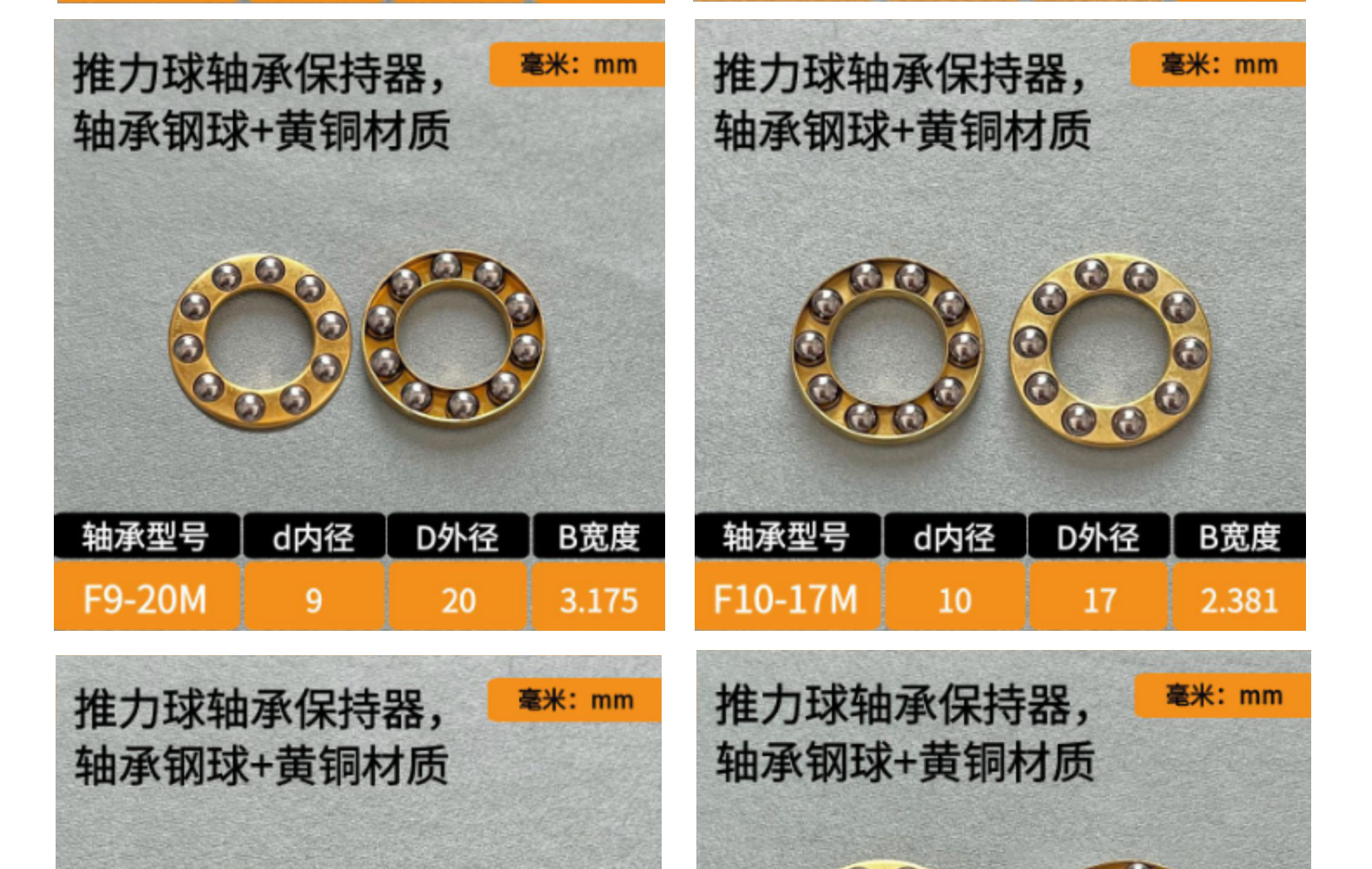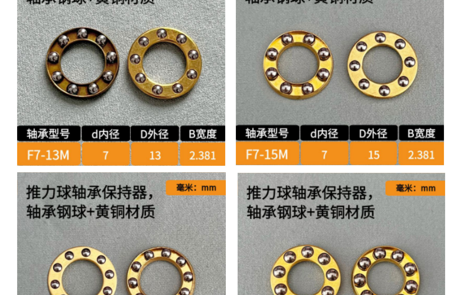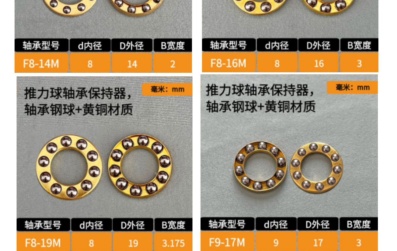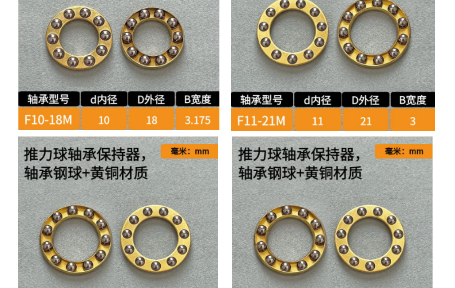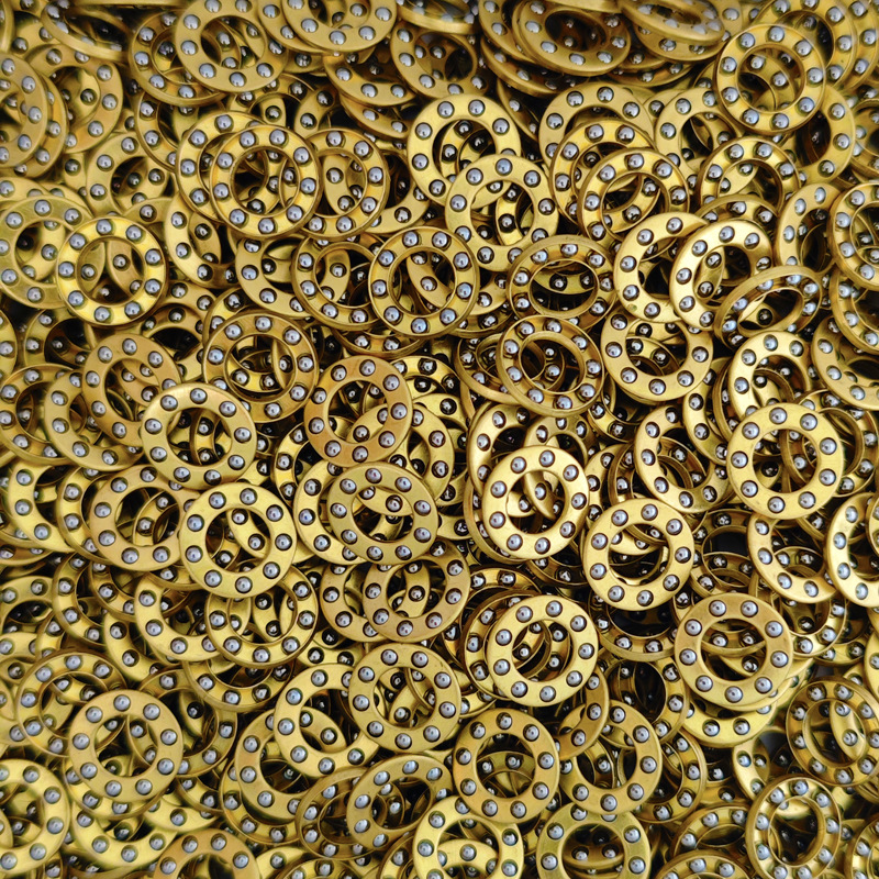 Латунные клинки, используемые в корпусах подшипников, имеют размеры от 3 до 100 миллиметров, и содержат стальные шарики для подшипников, а также плоские упорные шарикоподшипники из нержавеющей стали.