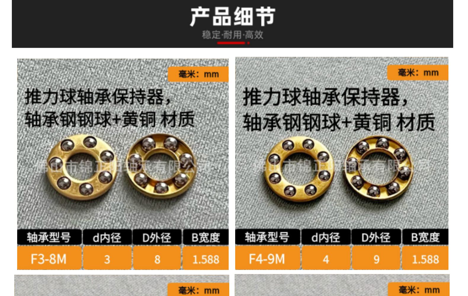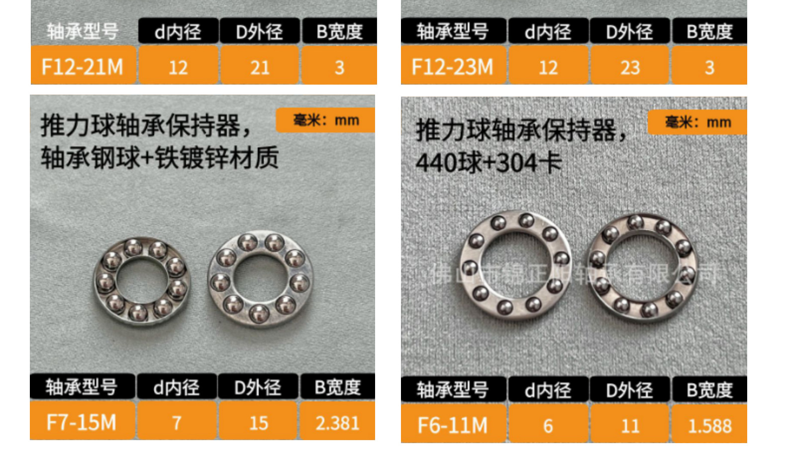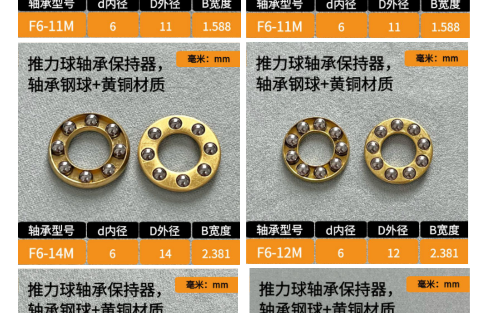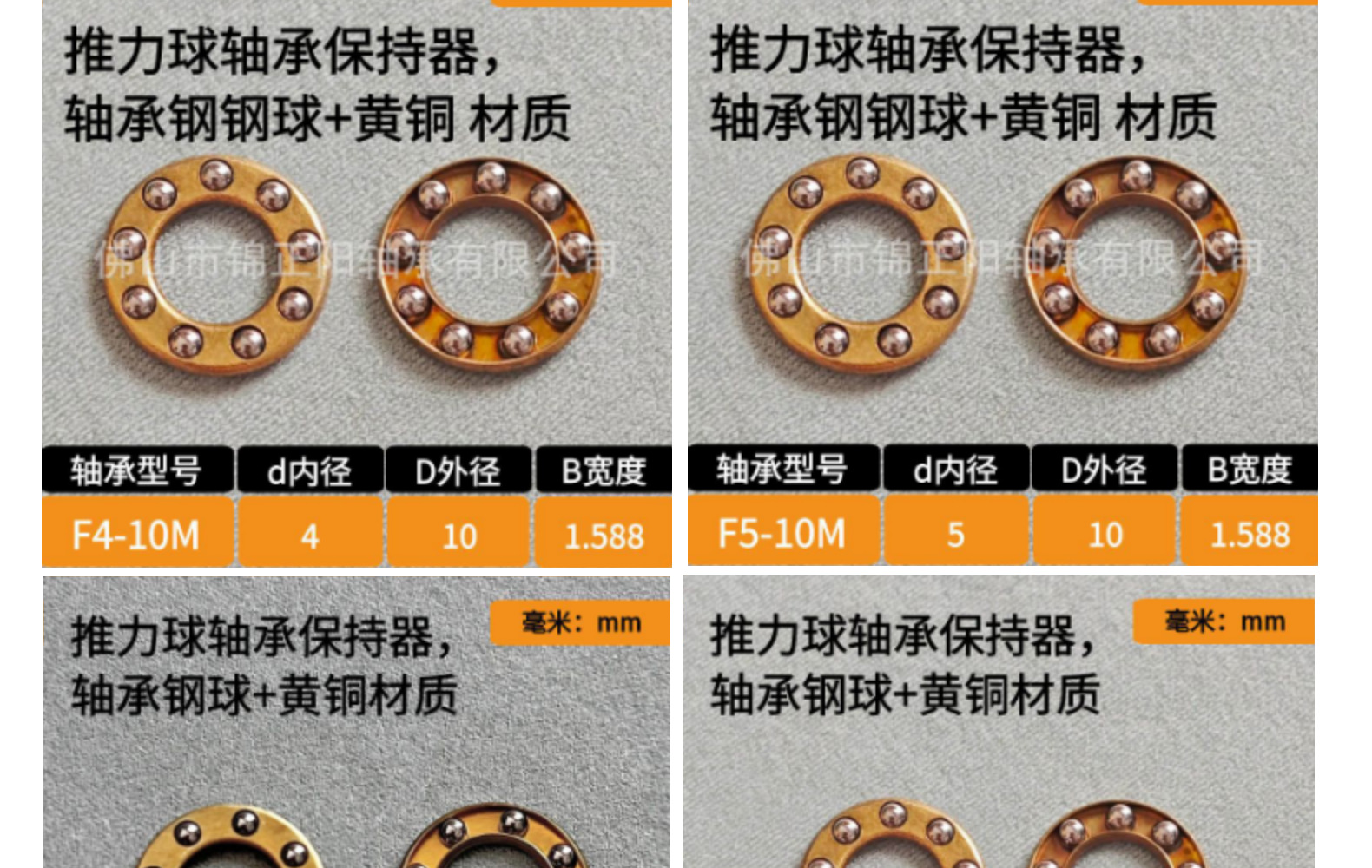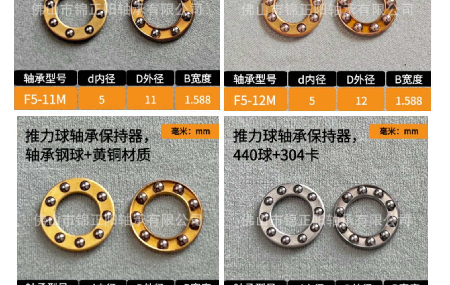 Латунные клинки, используемые в корпусах подшипников, имеют размеры от 3 до 100 миллиметров, и содержат стальные шарики для подшипников, а также плоские упорные шарикоподшипники из нержавеющей стали.