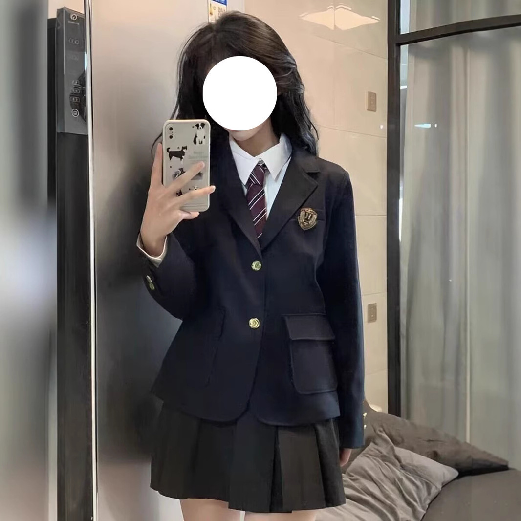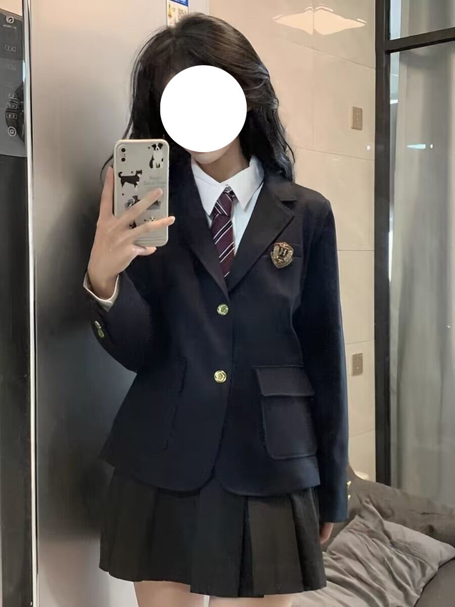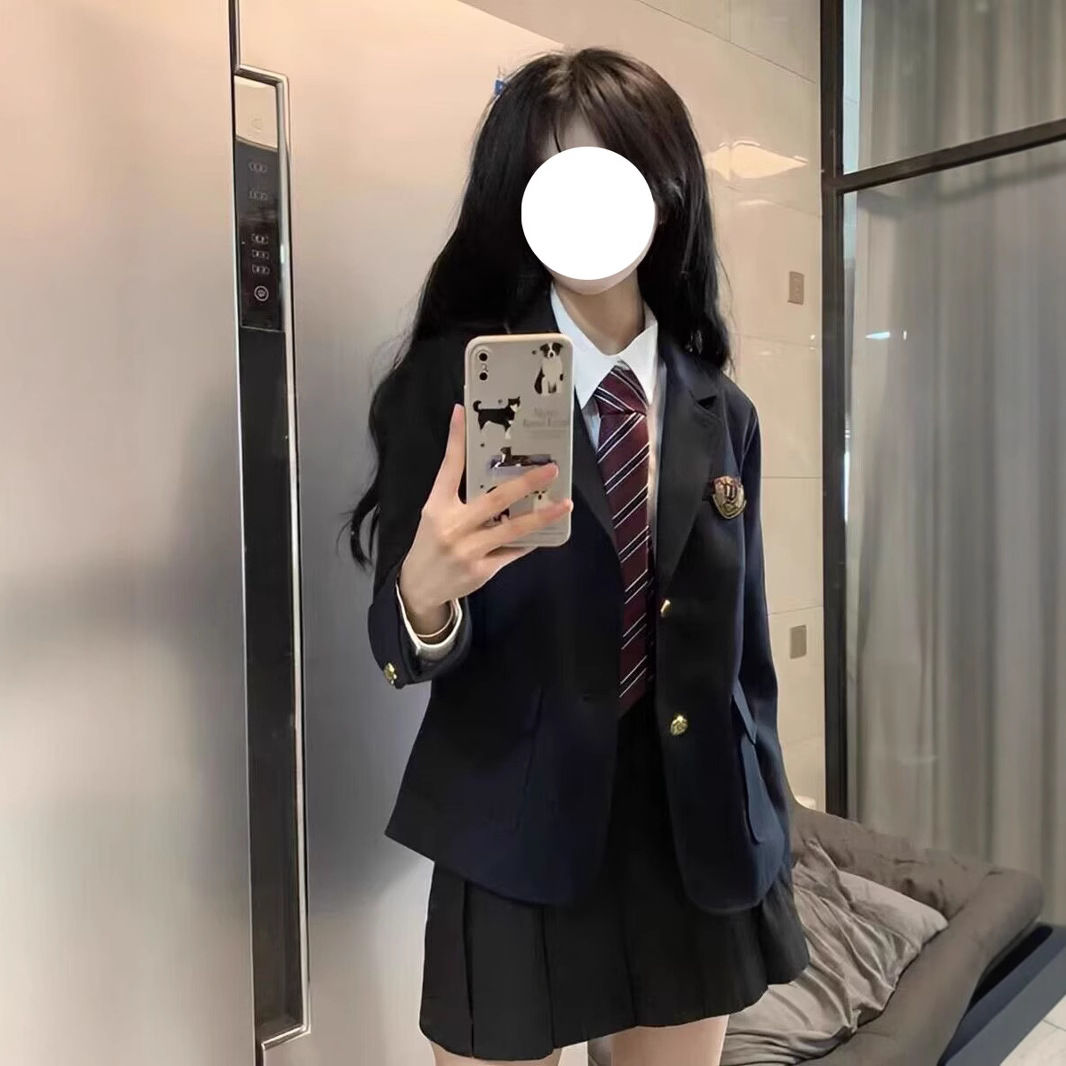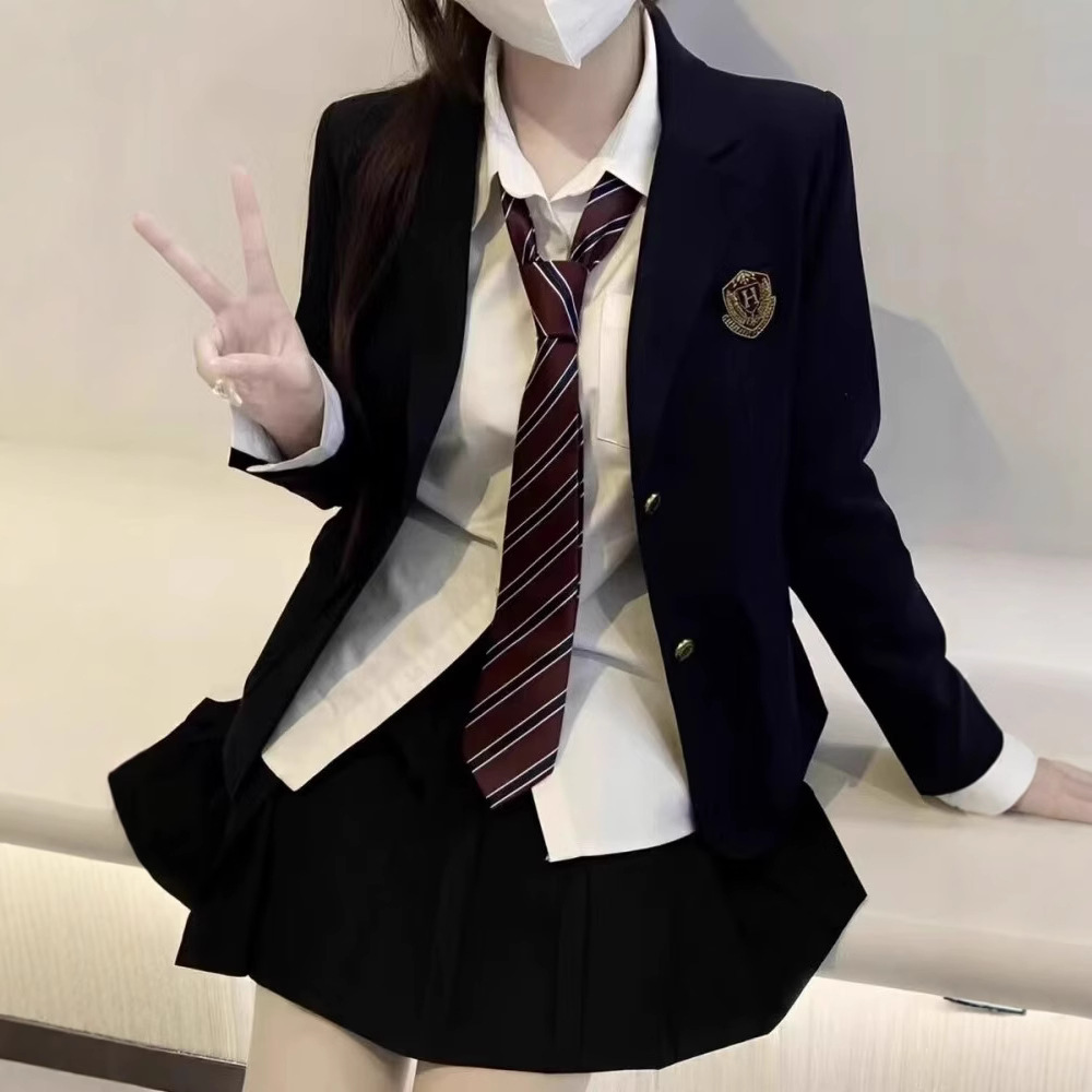 Черная Женская две пуговицы + Женская длинная рубашка + черная плиссированная юбка + красный и синий галстук + случайный значок; Одинарная Черная Женская с двумя пряжками + случайный значок