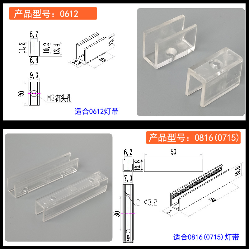 | 0816(0715)柔性灯带卡槽 | PC | 透明 | 适用于8*16(7*15)mm柔性硅胶灯带 |