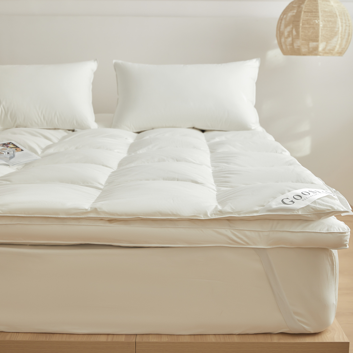 150*200 см: верхний 360 г 50 белый гусиный пух, нижний 5400 г белый гусиный пух-толщина около 8 см; 180*200 см: верхний 430 г 50 белый гусиный пух, нижний 6450 г белый гусиный пух-толщина около 8 см