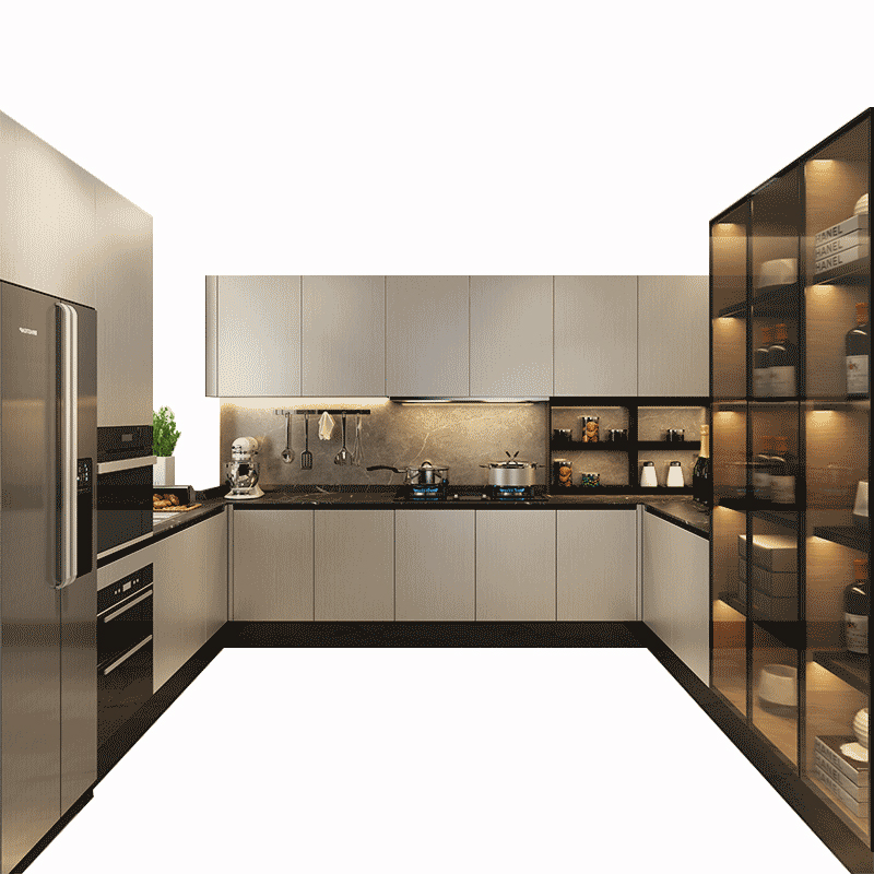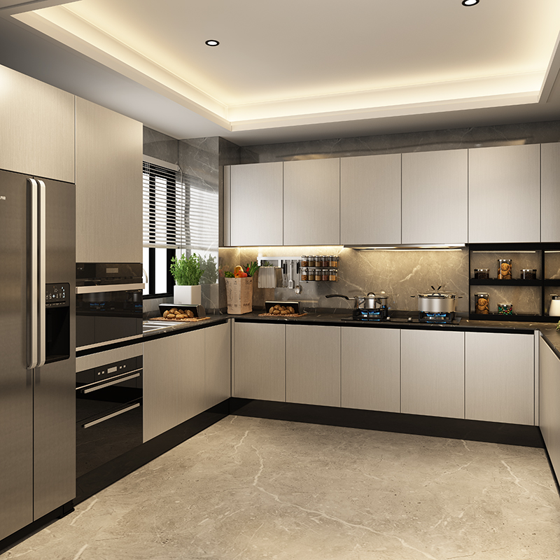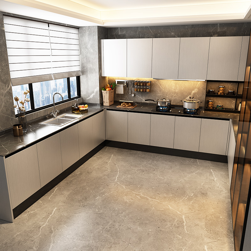 Алюминиевые сотовые шкафы, кухонные шкафы на заказ, кухонные шкафы с кварцевой столешницей, современный открытый минималистичный дизайн.