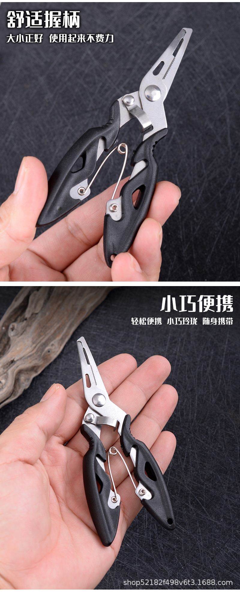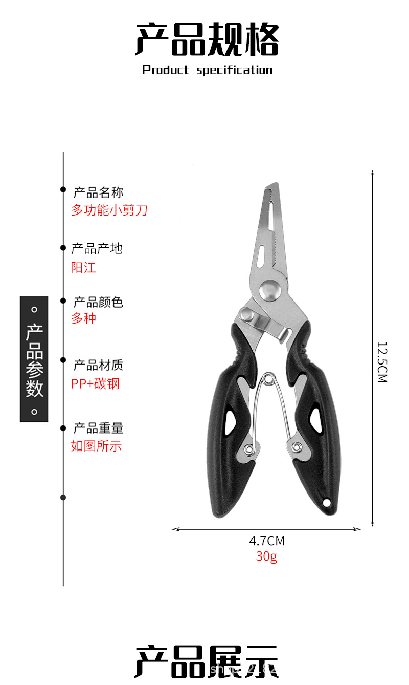 产品用途:取钩、控鱼、鱼剪、断钢丝、压咬铅、夹线。