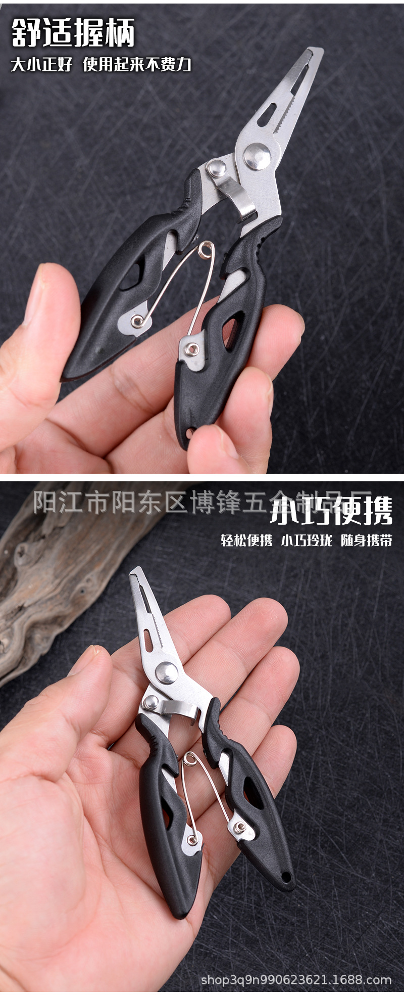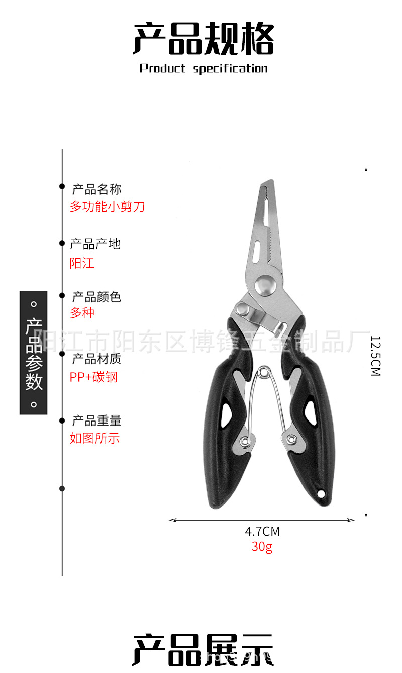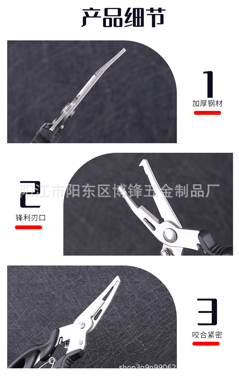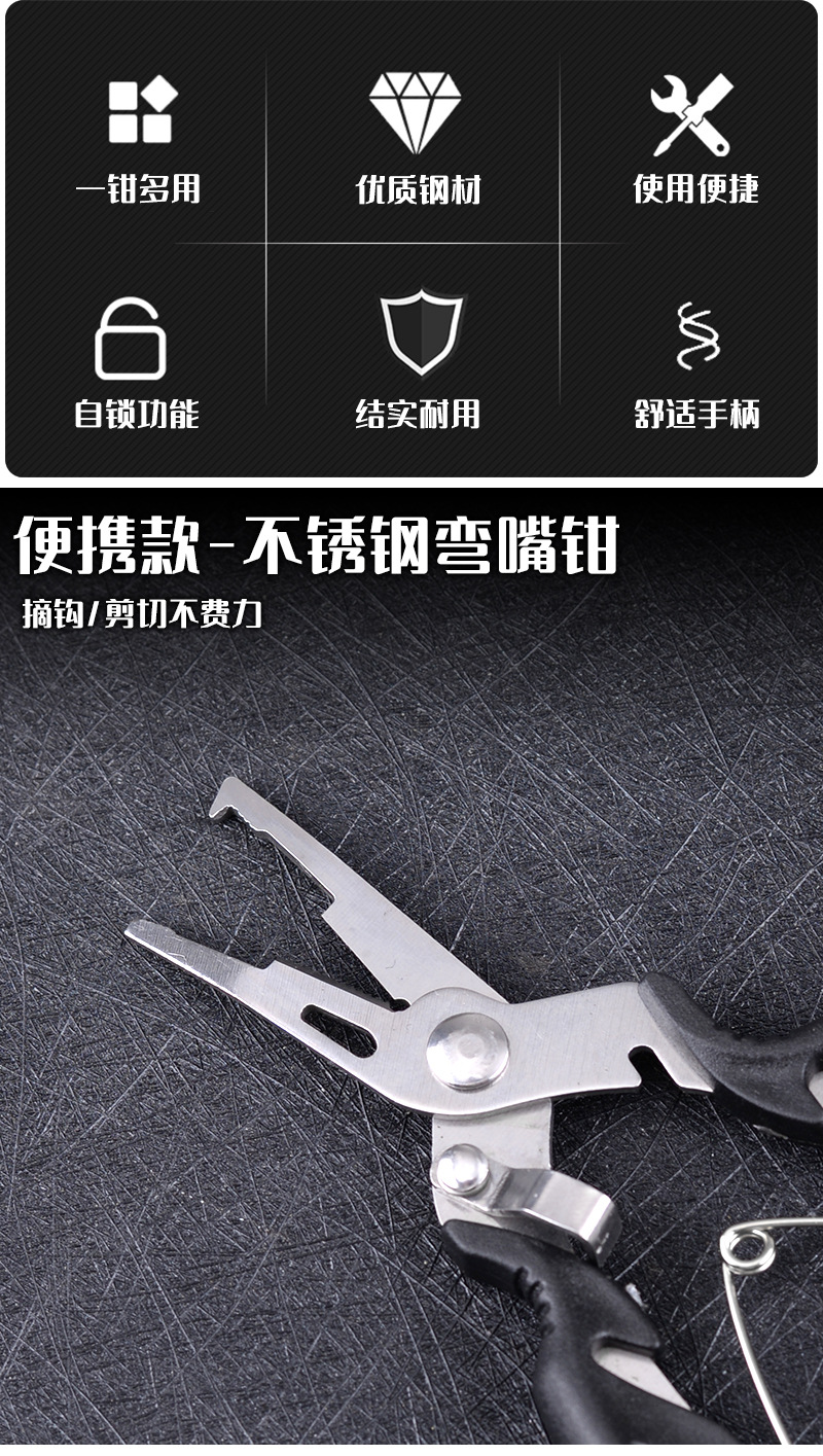 产品用途:取钩、控鱼、鱼剪、断钢丝、压咬铅、夹线。