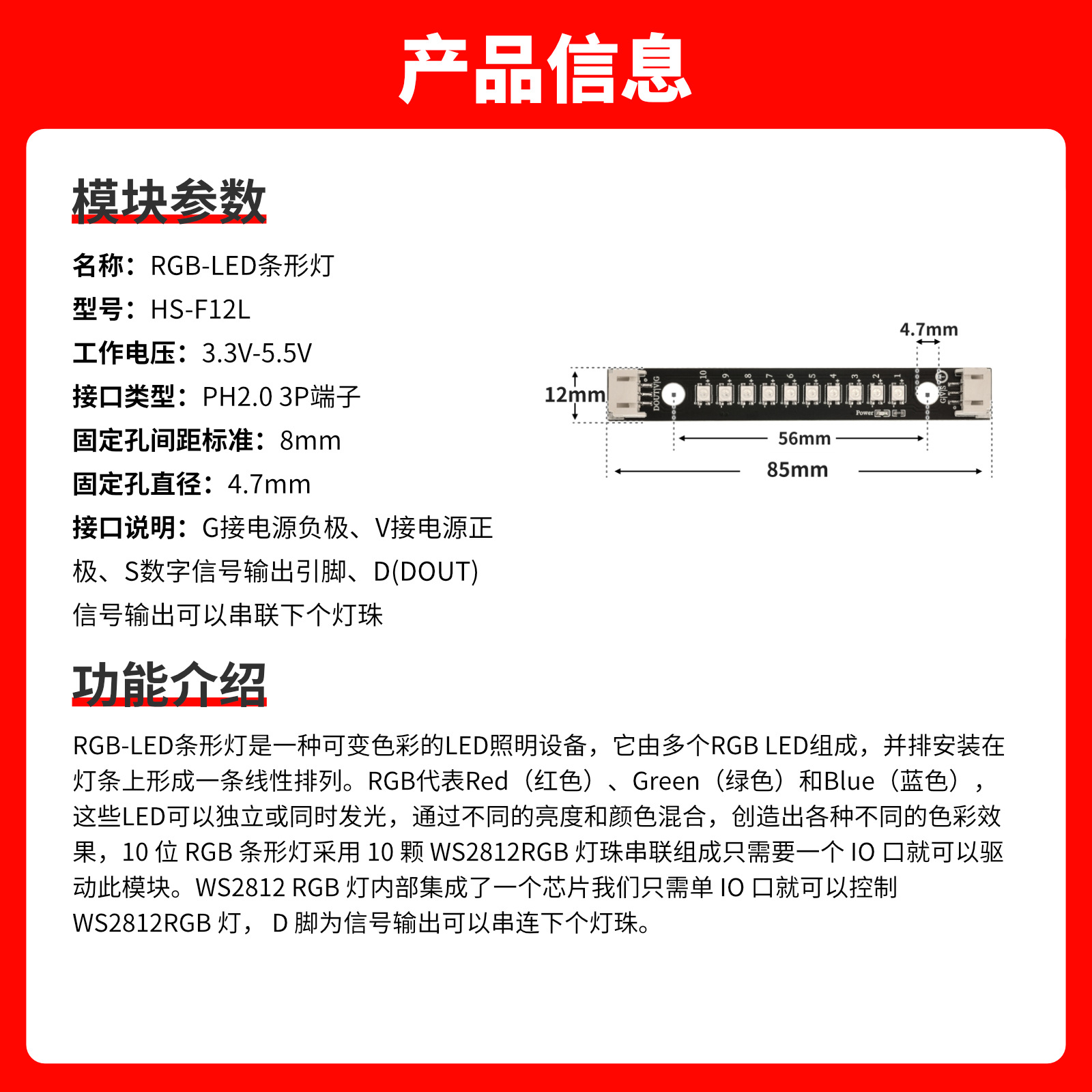 - 接口说明:G接电源负极、V接电源正极、S数字信号输出引脚、D(DOUT)信号输出可以串联下个灯珠