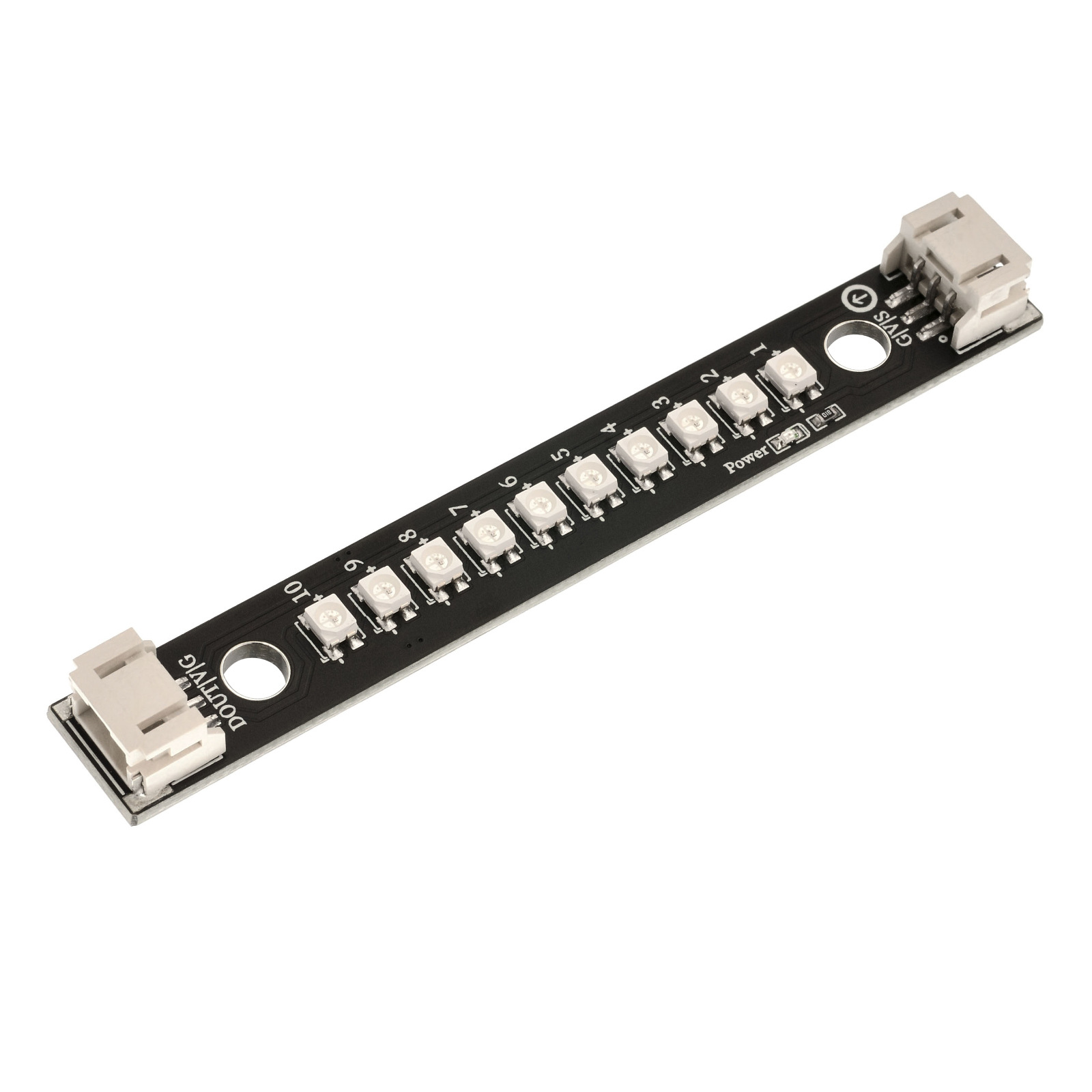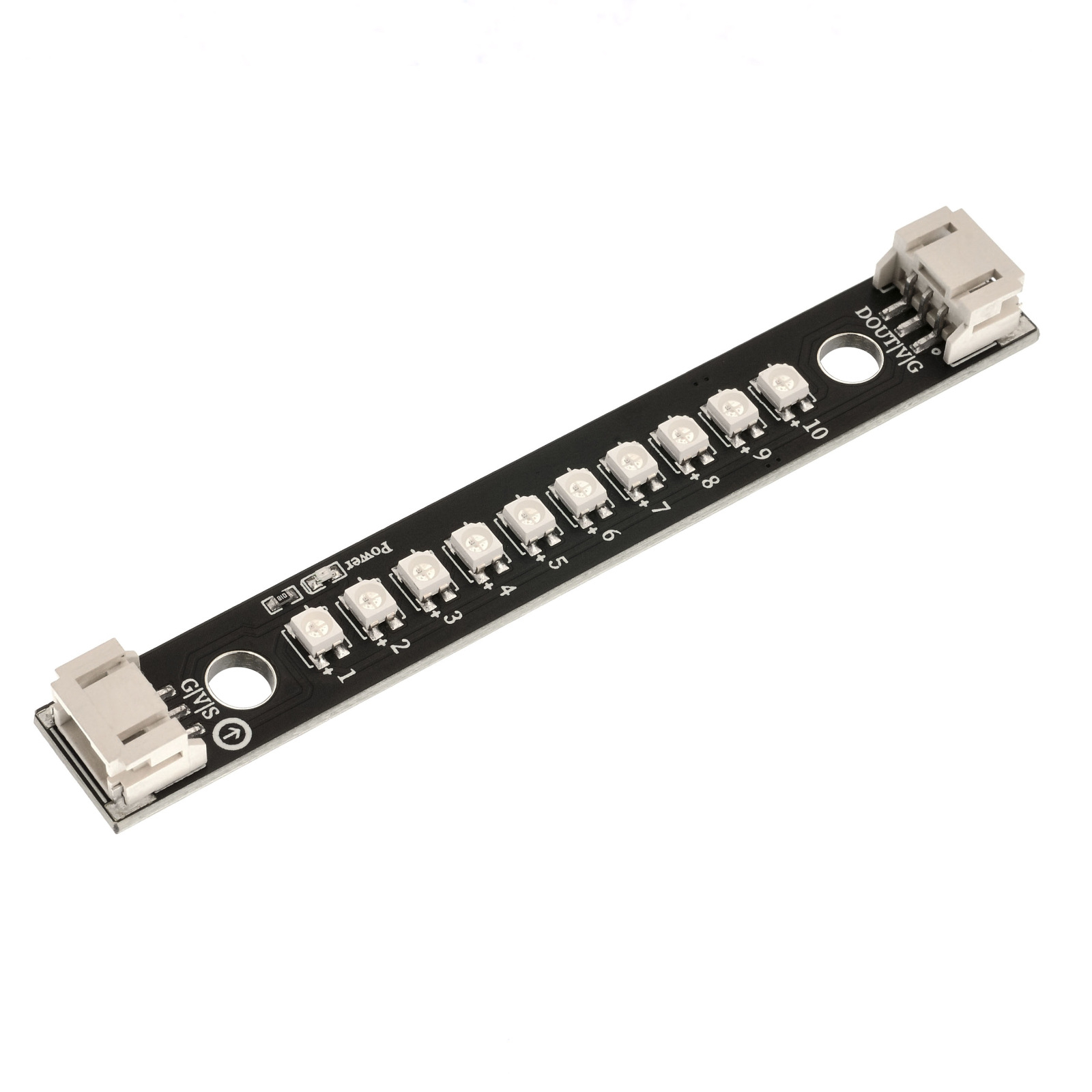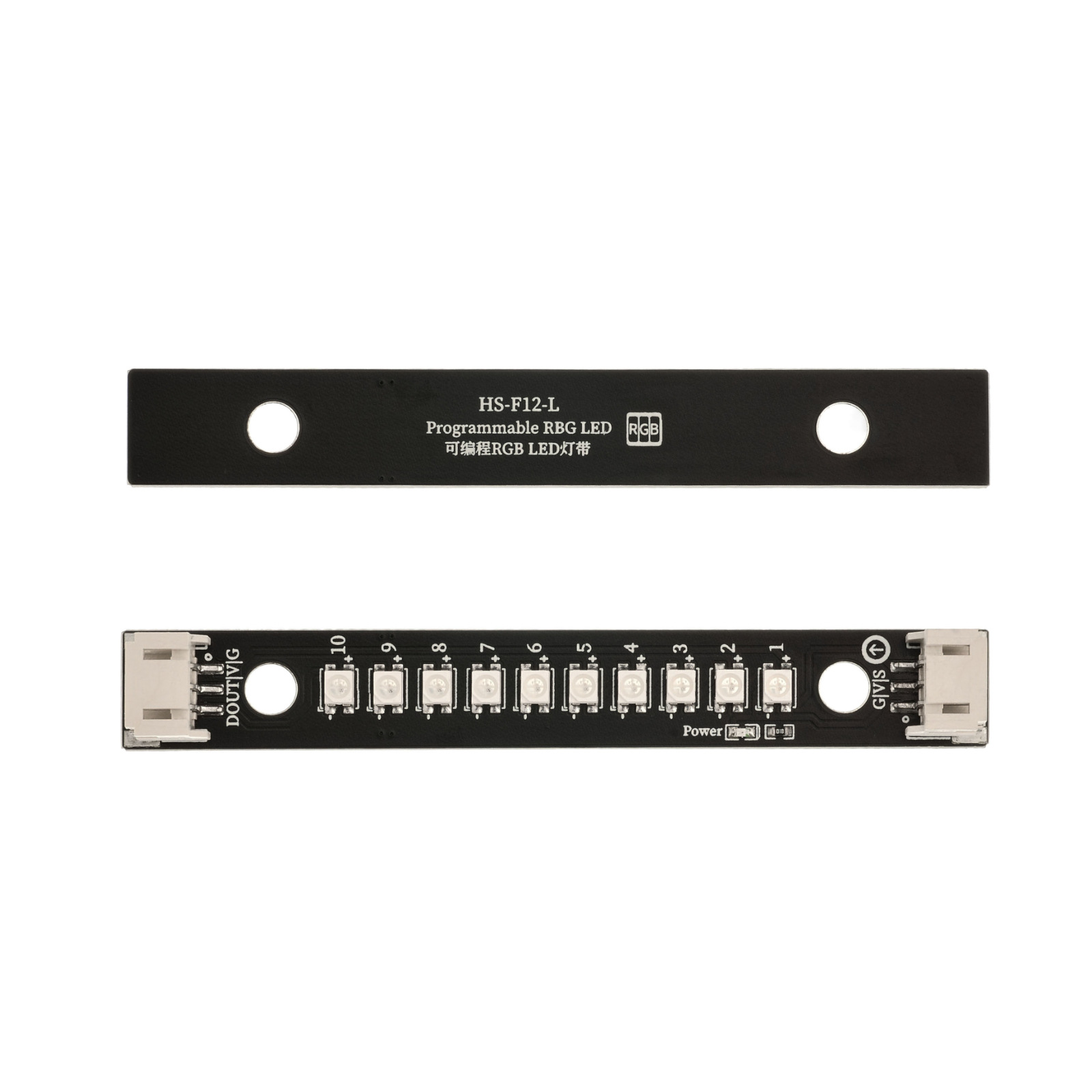 RGB-LED条形灯是一种可变色彩的LED照明设备,它由多个RGB LED组成,并排安装在灯条上形成一条线性排列。RGB代表Red(红色)、Green(绿色)和Blue(蓝色),这些LED可以独立或同时发光,通过不同的亮度和颜色混合,创造出各种不同的色彩效果,10 位 RGB 条形灯采用 10 颗 WS2812RGB 灯珠串联组成只需要一个 IO 口就可以驱动此模块。WS2812 RGB 灯内部集成了一个芯片我们只需单 IO 口就可以控制WS2812RGB 灯, D 脚为信号输出可以串连下个灯珠。