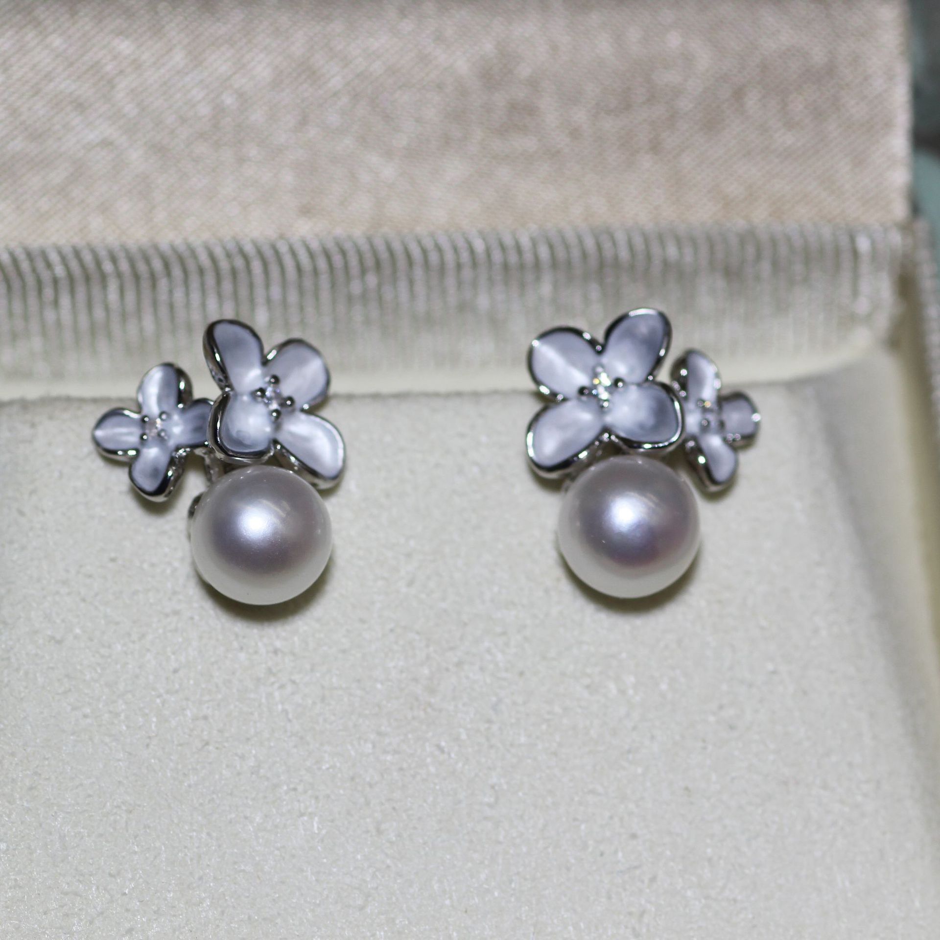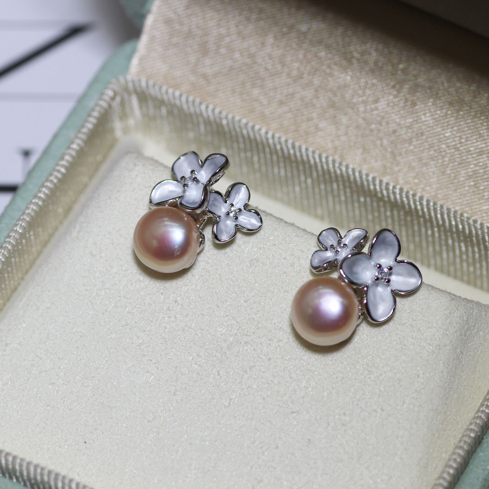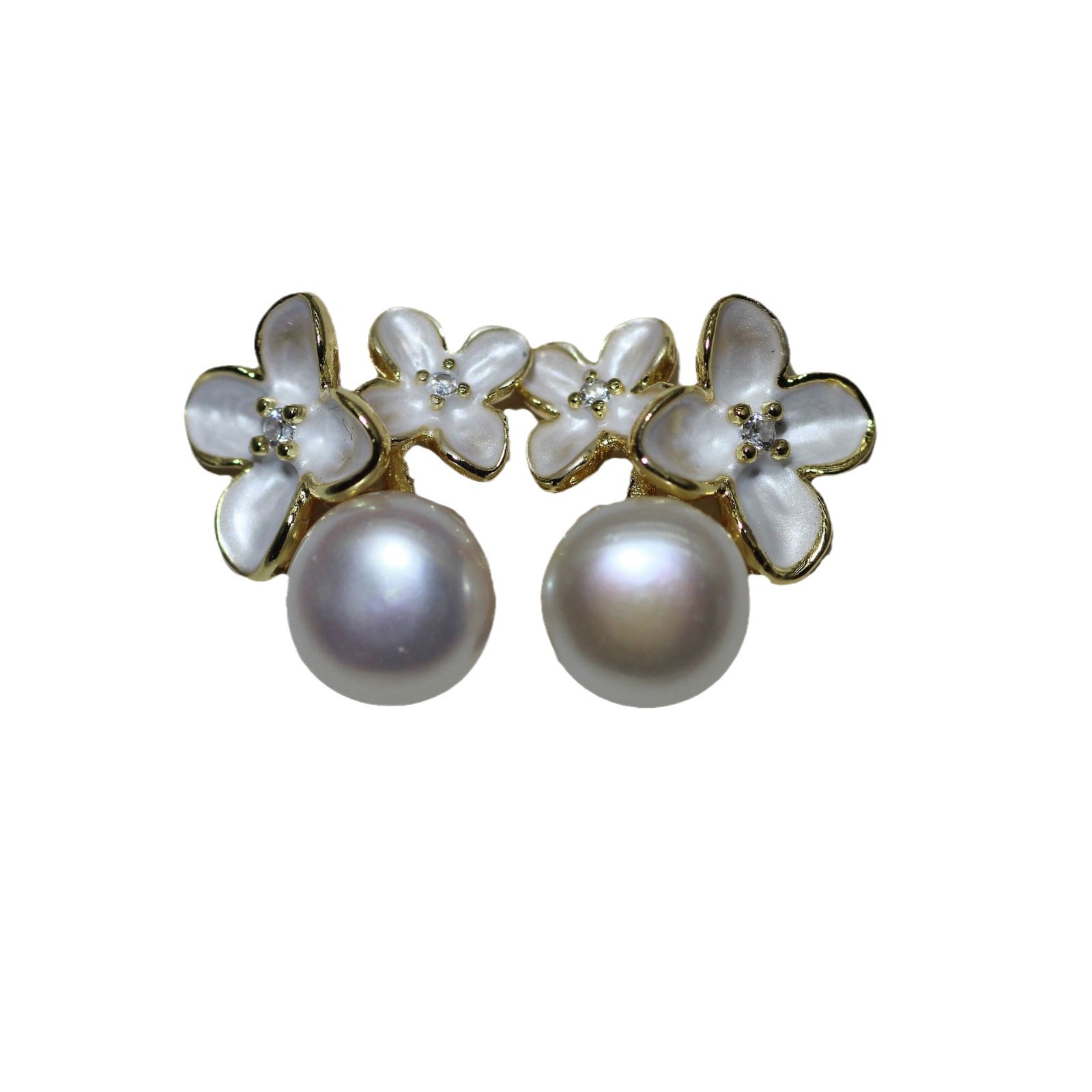 Серьги-гвоздики Dan Tao в пасторальном стиле с крупными и мелкими цветами, выполненные в технике масляной росписи, и натуральным пресноводным жемчугом.