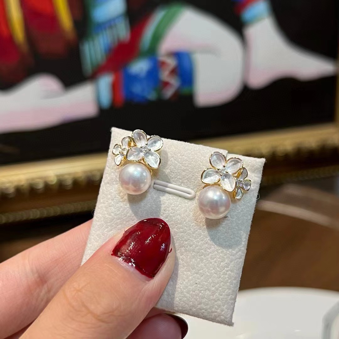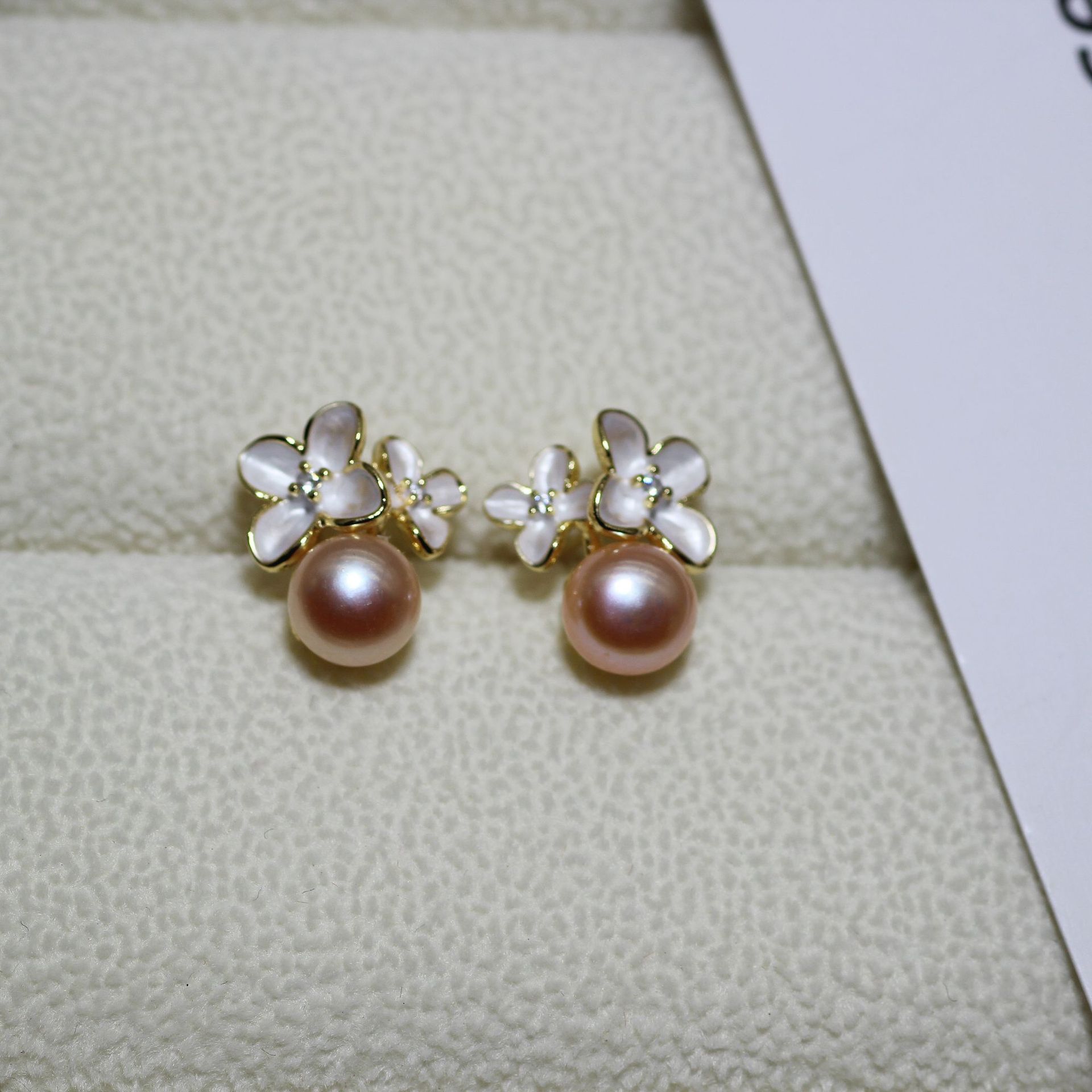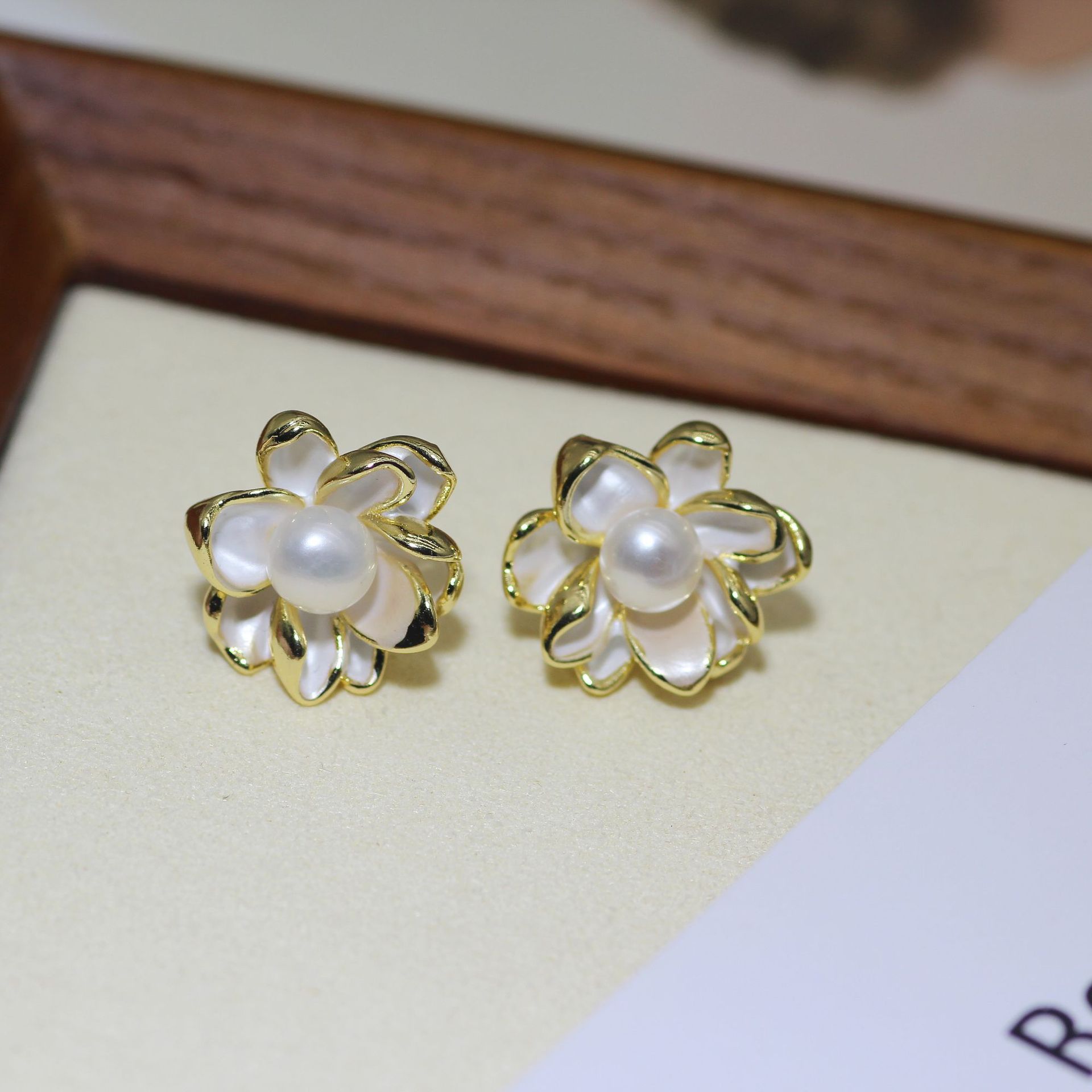 Серьги-гвоздики Dan Tao в пасторальном стиле с крупными и мелкими цветами, выполненные в технике масляной росписи, и натуральным пресноводным жемчугом.