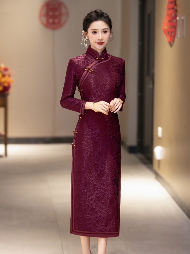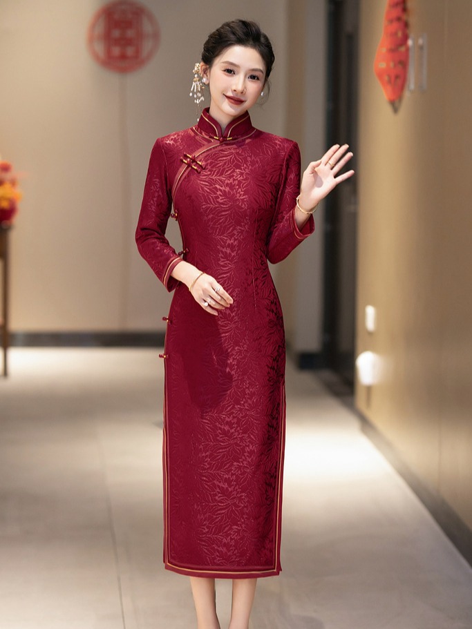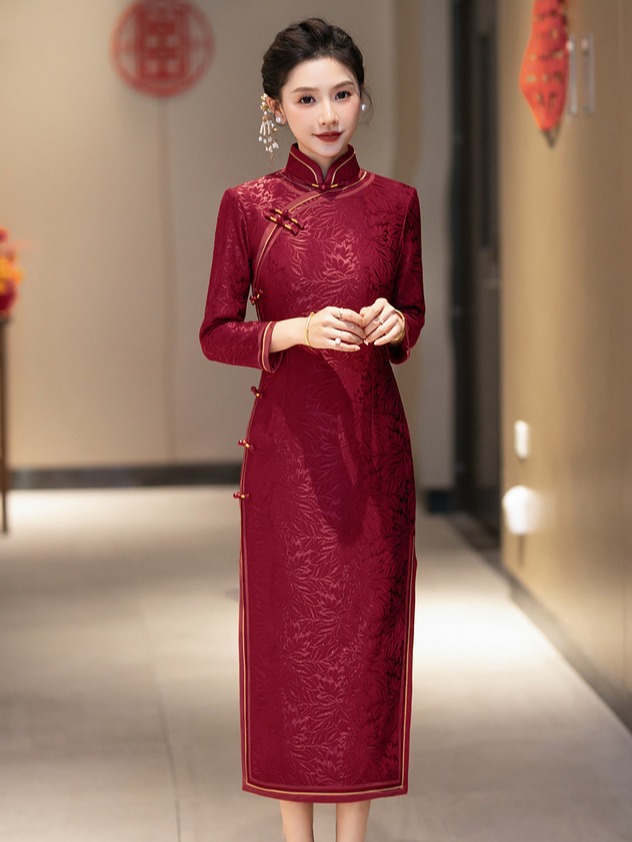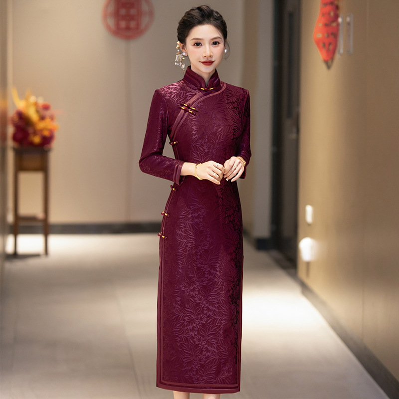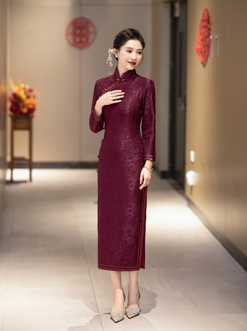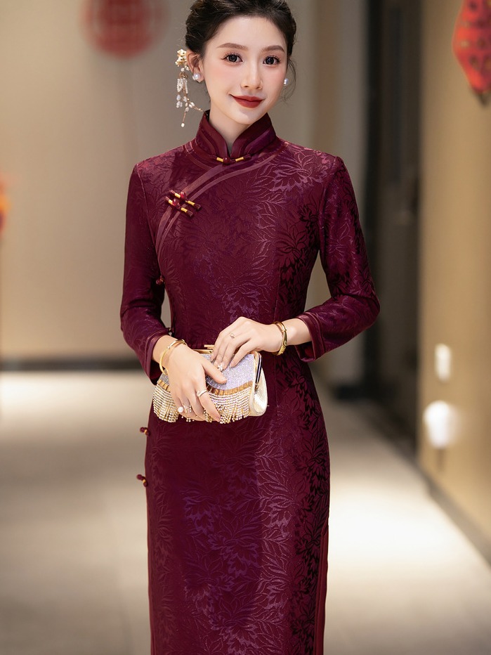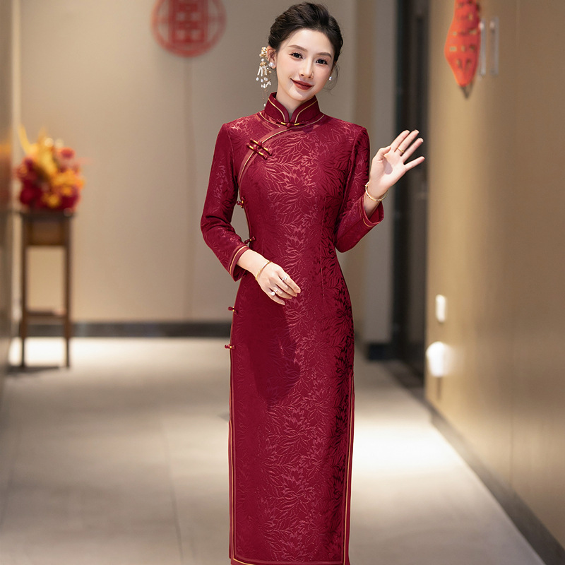 Вязаный жаккардовый чонсам для свекрови с длинными рукавами и флисовой подкладкой, утолщенный зимний вариант 2024 года, новый элитный женский свадебный банкетный наряд для мам.