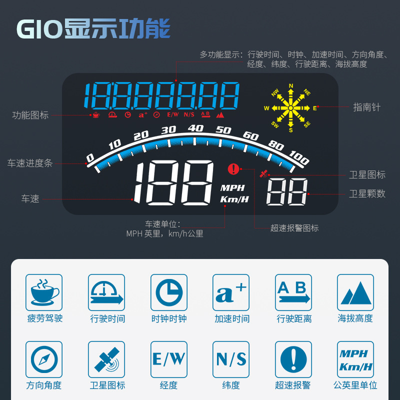 G10-蓝汽车仪表HUD抬头显示器通用GPS速度表无线旋转支架源头厂家
