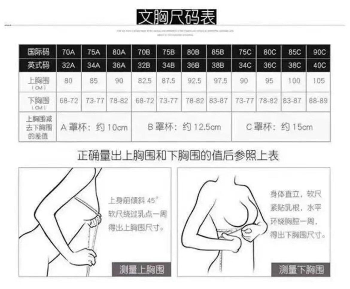 M(75D 70B 70C); L(75D 80B 80C); XL(80D 85B 85C); 2XL(85D 85B 85C); 3XL(90D 95B 95C)