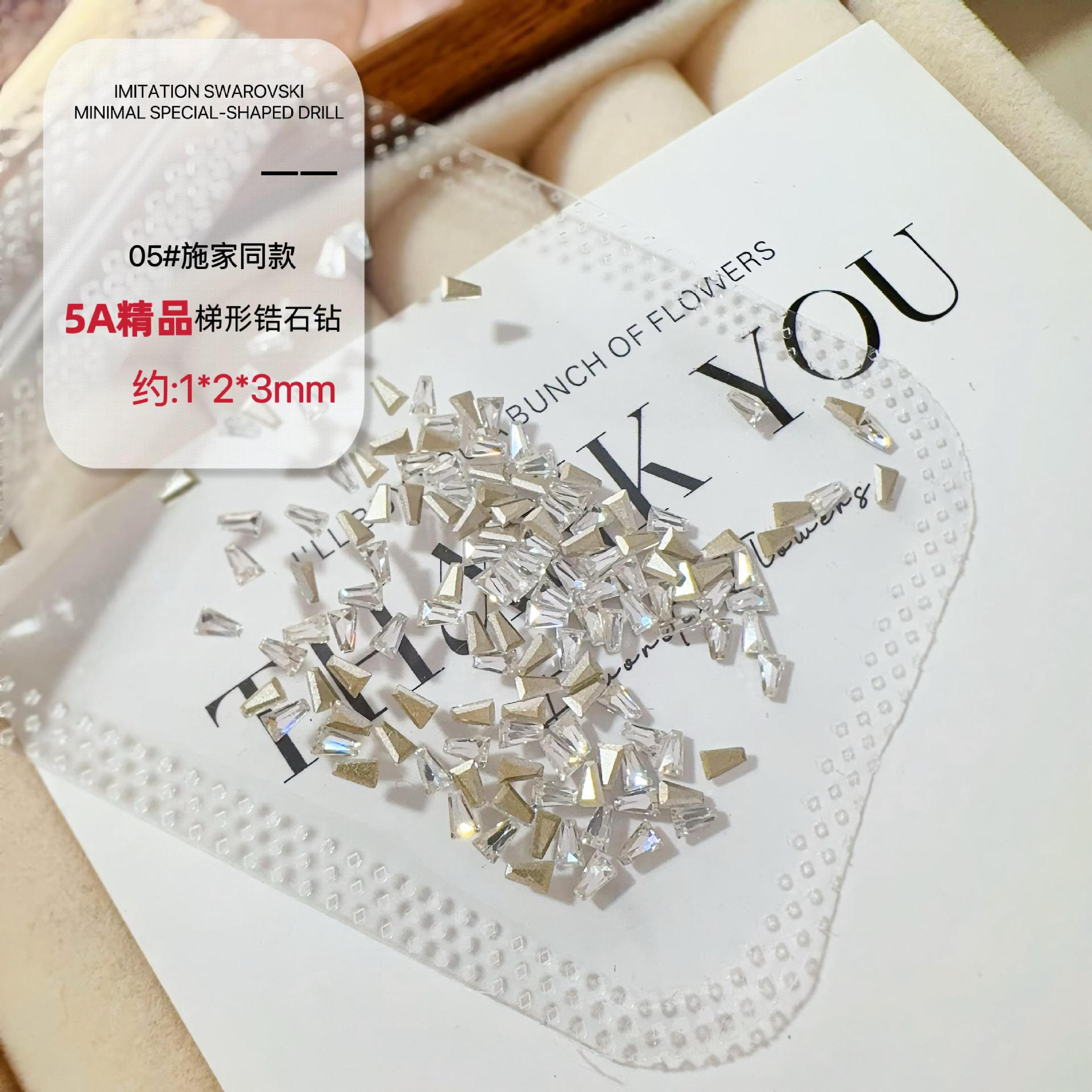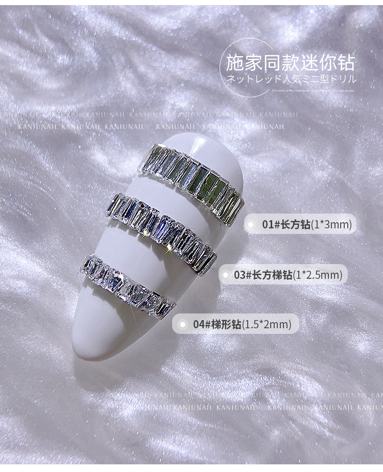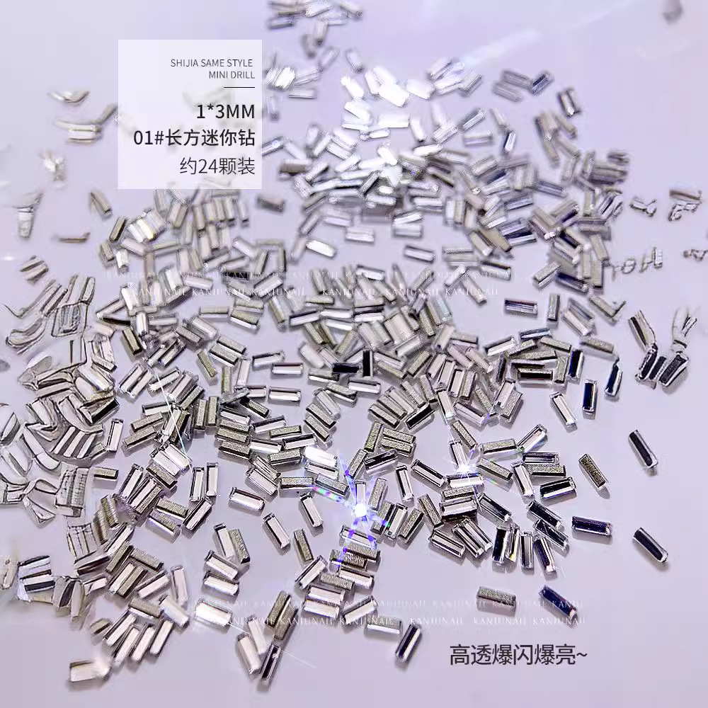 01 # Ши Цзя тот же трапециевидный бриллиант белый [0.8*1.5*2 мм]; 02 # Ши Цзя тот же T дрель белый [1*2 мм]; 03 # Ши Цзя тот же длинный бриллиант белый [1*3 мм]; 04 # 5A циркон 1,5*3 мм длинная полоса [серебристо-белый]; 05 # Ши Цзяцзя та же трапецистое бриллиантовое белое [1*2*3 мм]; 06 # Ши Цзя тот же ромбовидный бриллиант белый [1,5*3 мм]; 07 # Ши Цзяцзя та же трапецистое бриллиантовое белое [1*2*4 мм]