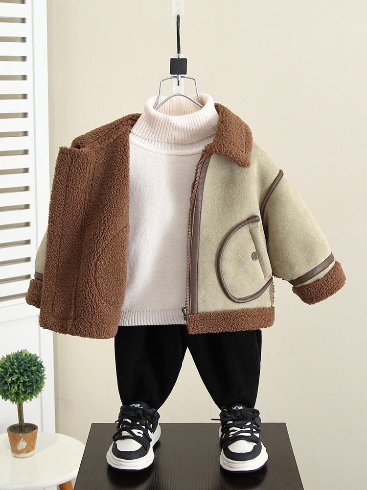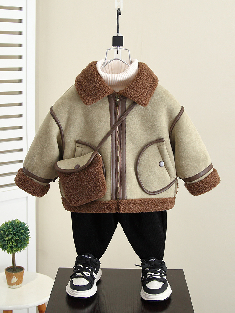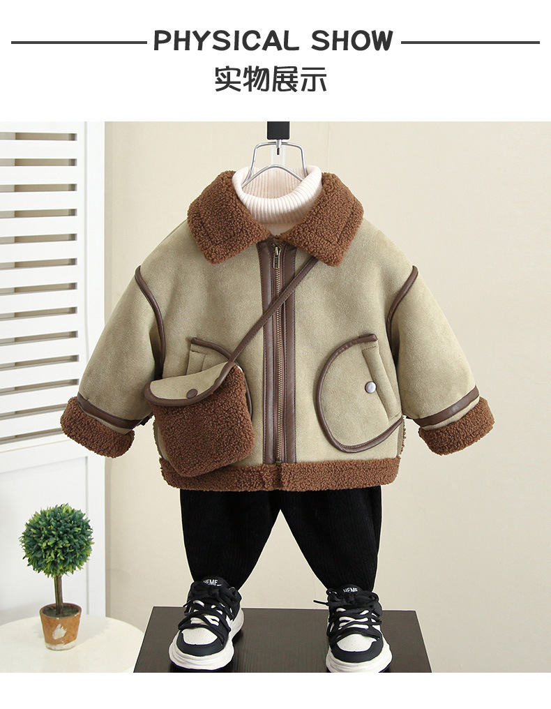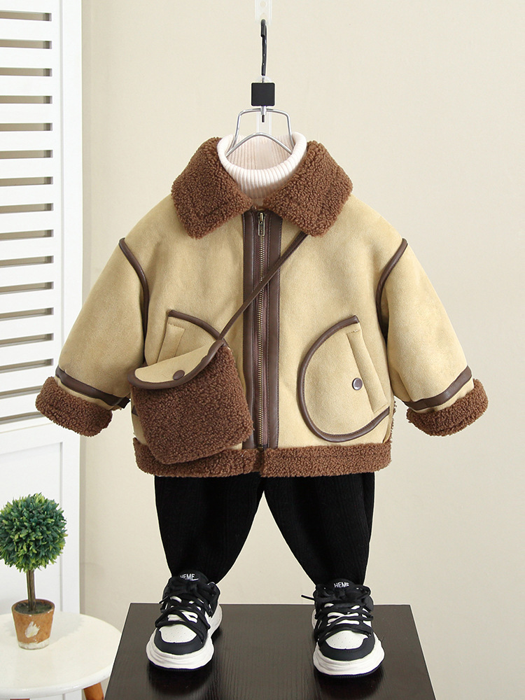 4592 Бархатная куртка для мальчиков Осень-Зима 2025 Новая детская зимняя одежда с мехом Встроенное шерстяное пальто Детская одежда