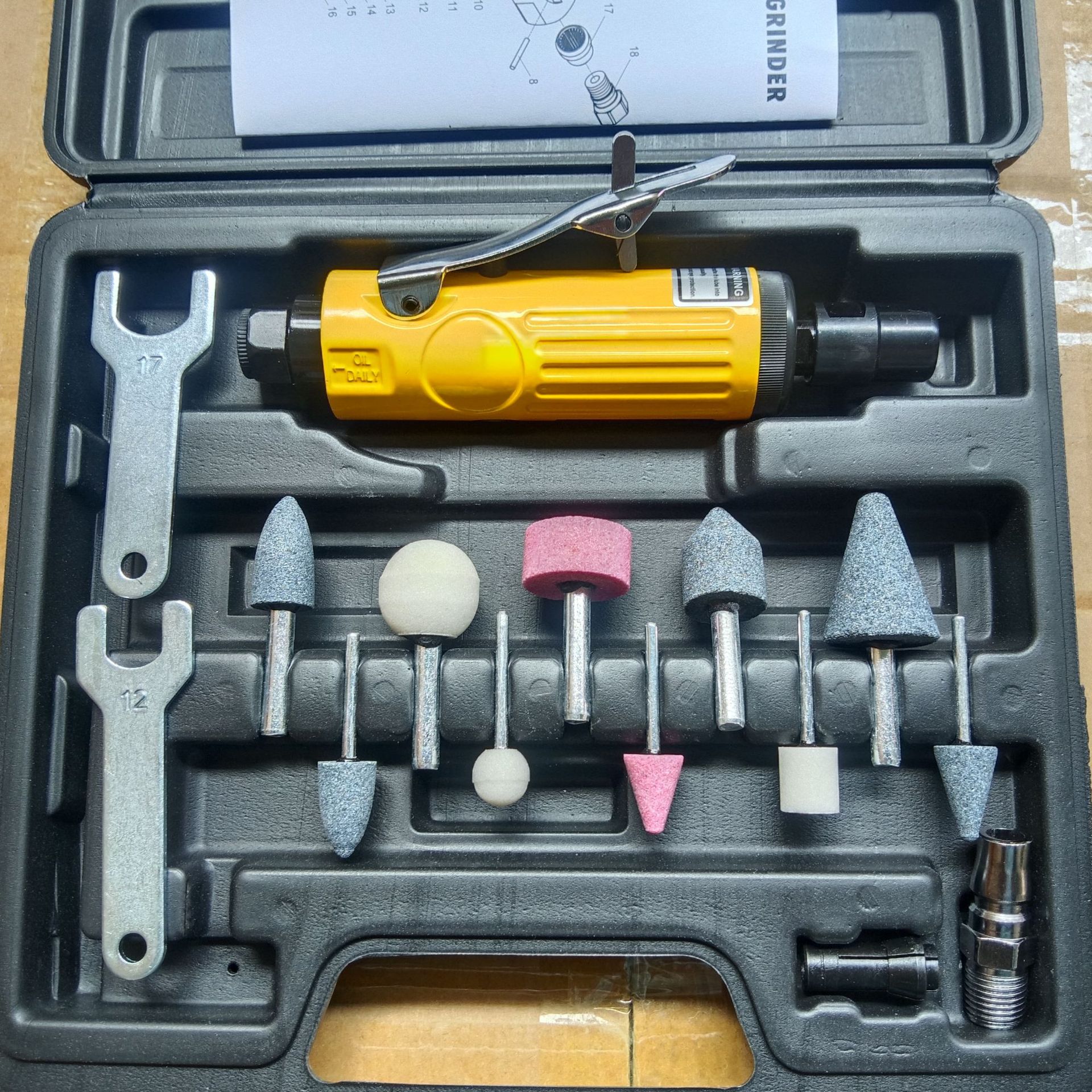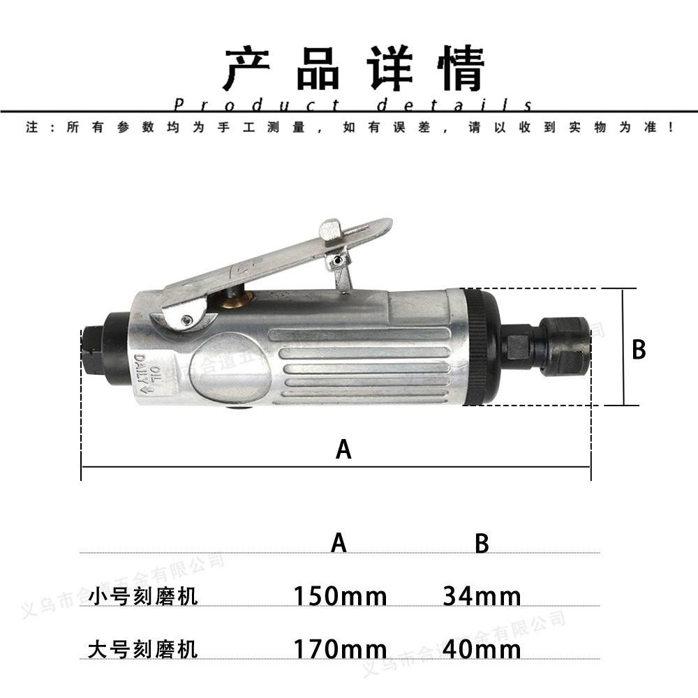 配置:刻磨机一支 拆卸扳手2支 3MM夹头一支 6MM夹头一支 日式进气接头一支 3MM柄径磨头5支 6MM柄径磨头5支
