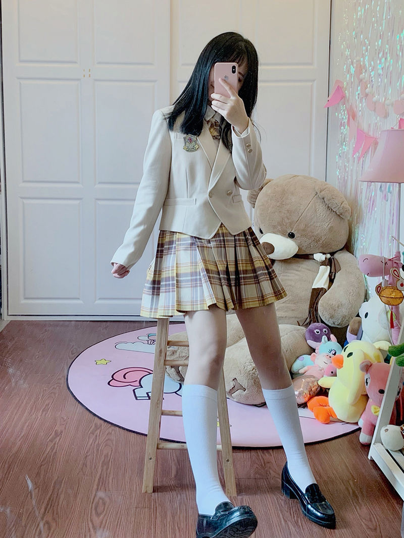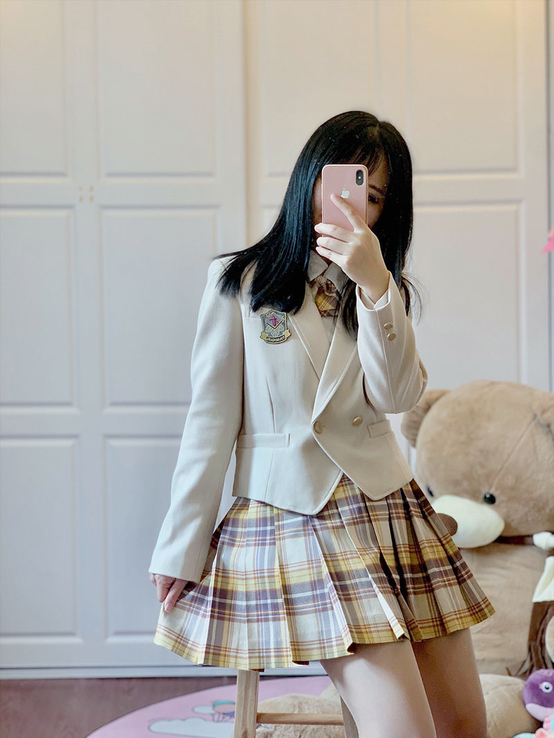 Черный пиджак средней длины (с значком Университета Донъян); Темно-синий пиджак средней длины (с значком Университета Донъян); Темно-зеленый пиджак средней длины (с значком Университета Донъян); Серый пиджак средней длины (с значком Университета Донъян); Темно-красный пиджак средней длины (с значком Университета Донъян); Абрикосовый пиджак средней длины (с значком); Черный костюм средней длины + юбка-сигарета + белая длинная рубашка + галстук-бабочка + Университет Донъян; Костюм средней длины Cyan West + серая клетчатая юбка + белая рубашка с длинными рукавами + галстук-бабочка + Университет Донъян; Темно-зеленый костюм средней длины + юбка в лесную клетку + белая рубашка с длинными рукавами + галстук-бабочка + Университет Донъян; Серый костюм средней длины + белая рубашка с длинными рукавами + темно-серая клетчатая юбка + галстук-бабочка + Университет Донъян; Бордовый костюм средней длины + клетчатая юбка из боярышника + белая рубашка с длинными рукавами + галстук-бабочка + Университет Донъян; Cyan West Средней длины West + клетчатая юбка из боярышника + белая рубашка с длинными рукавами + галстук-бабочка + Университет Донъян; Абрикосовый костюм средней длины + клетчатая юбка Ямабуки + белая рубашка с длинными рукавами + галстук-бабочка + Тоя Да