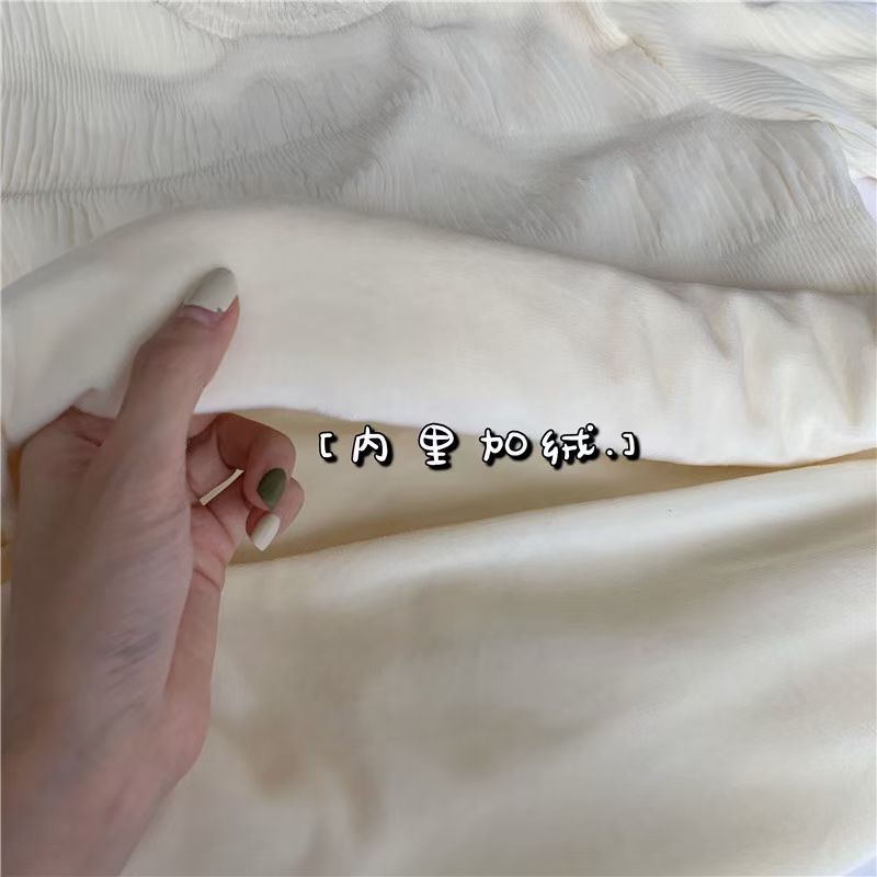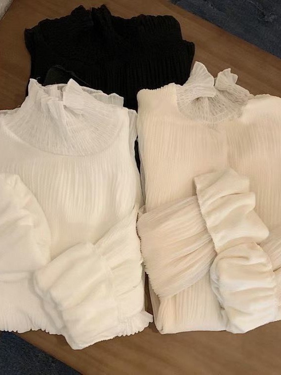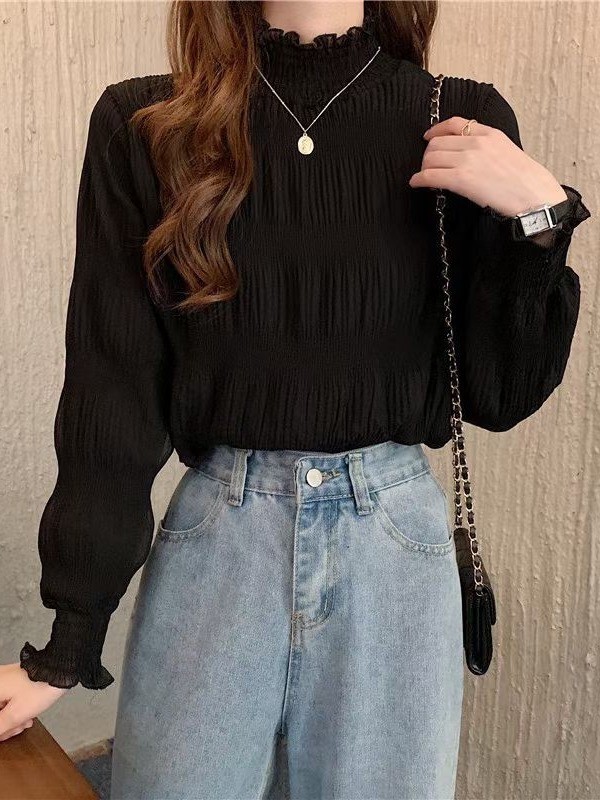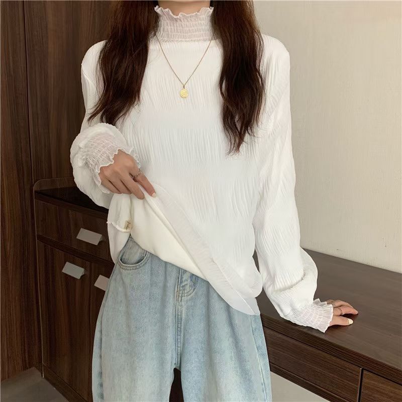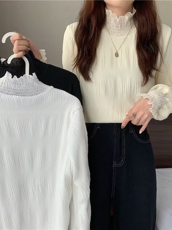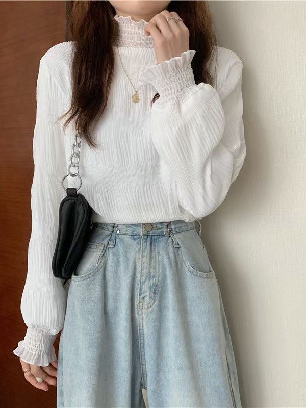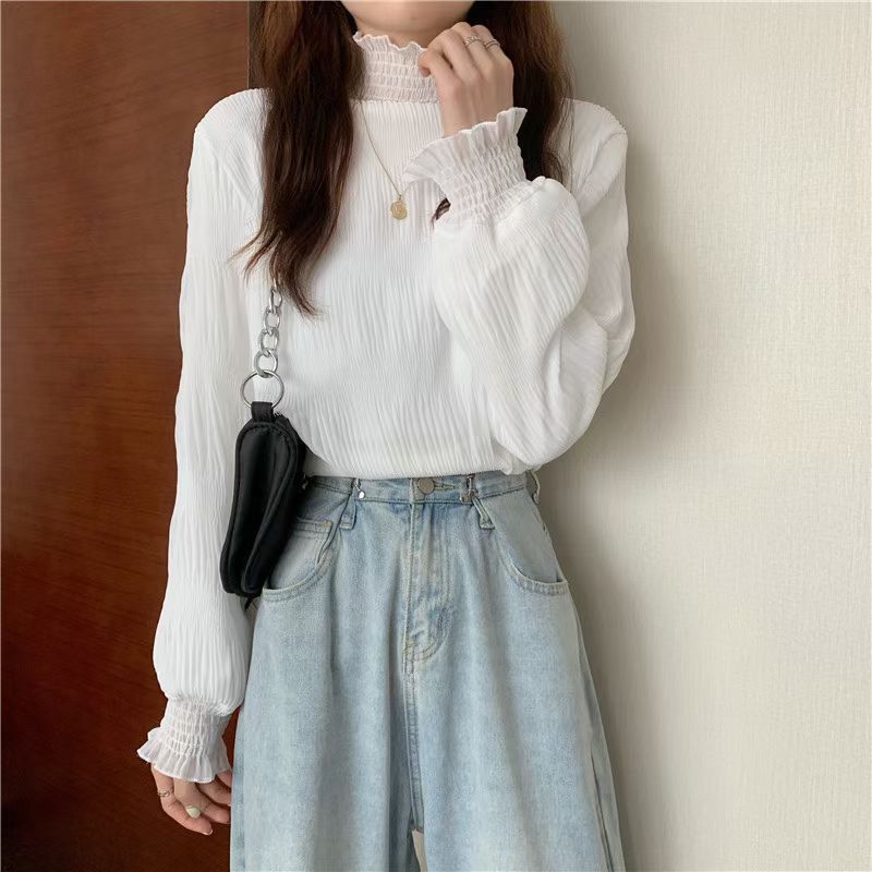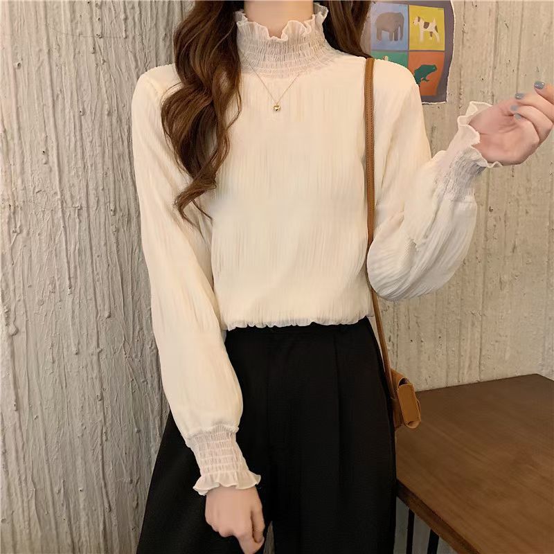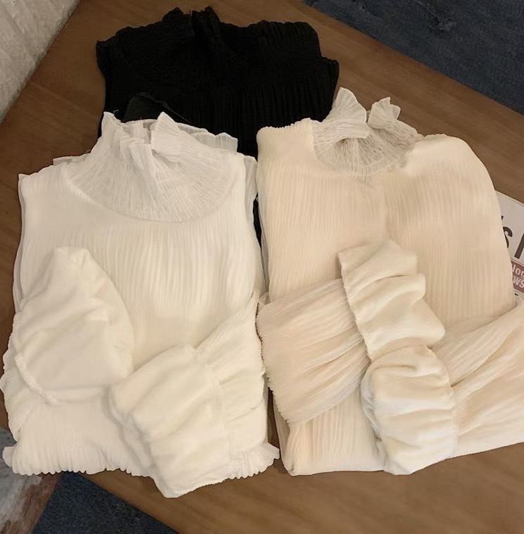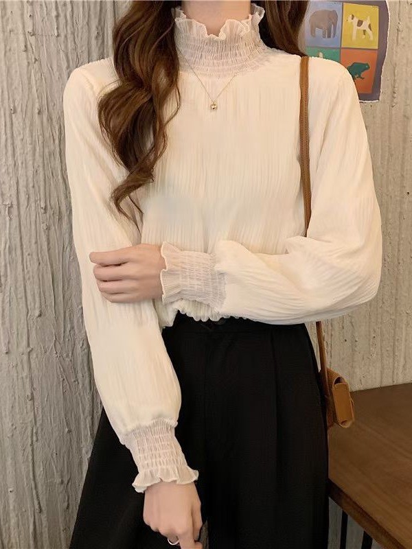 Плиссированная шифоновая блузка для женщин, новая осенне-зимняя модель в корейском стиле, с полувысоким воротником, однотонная, теплая, с кружевным оборчатым подолом, базовая рубашка.