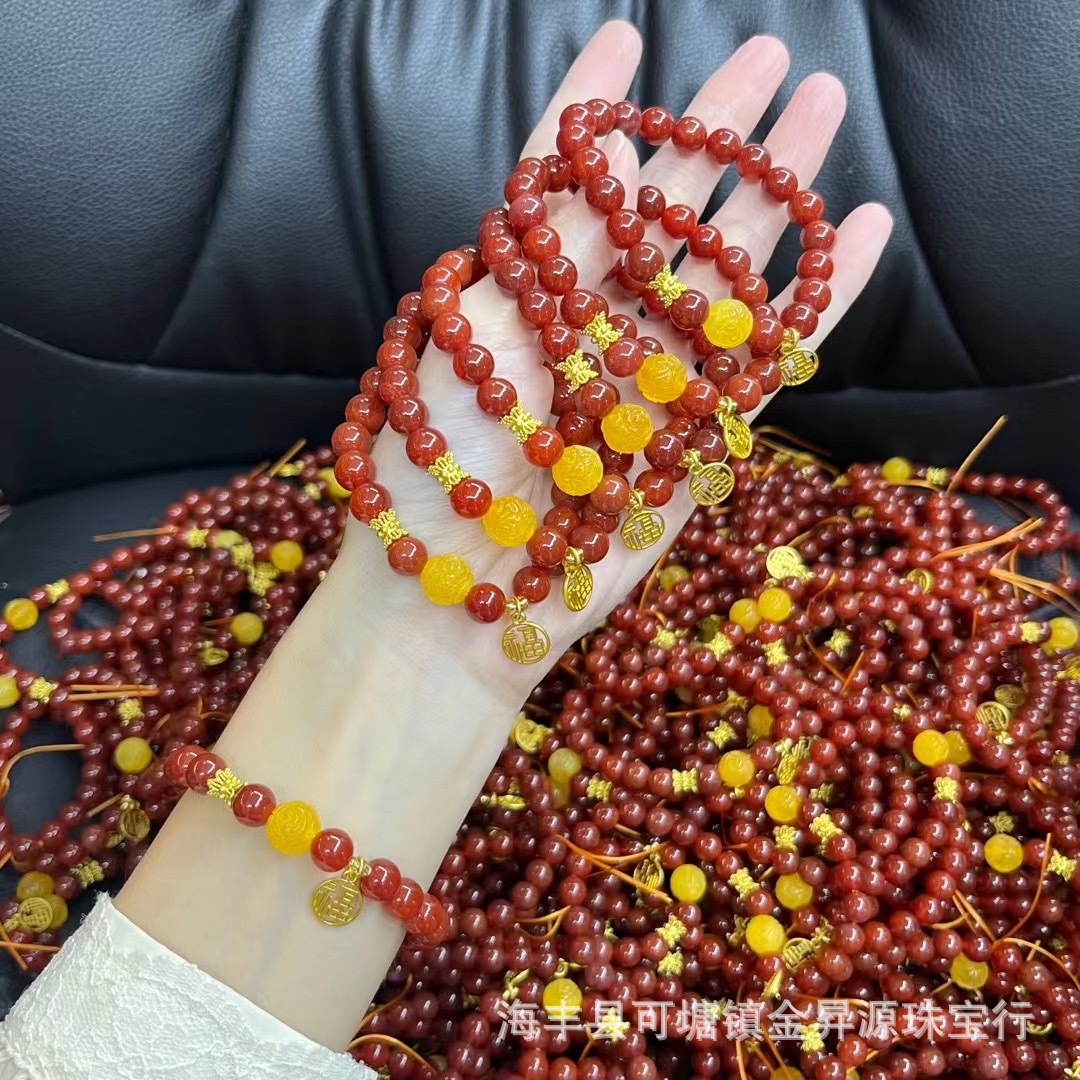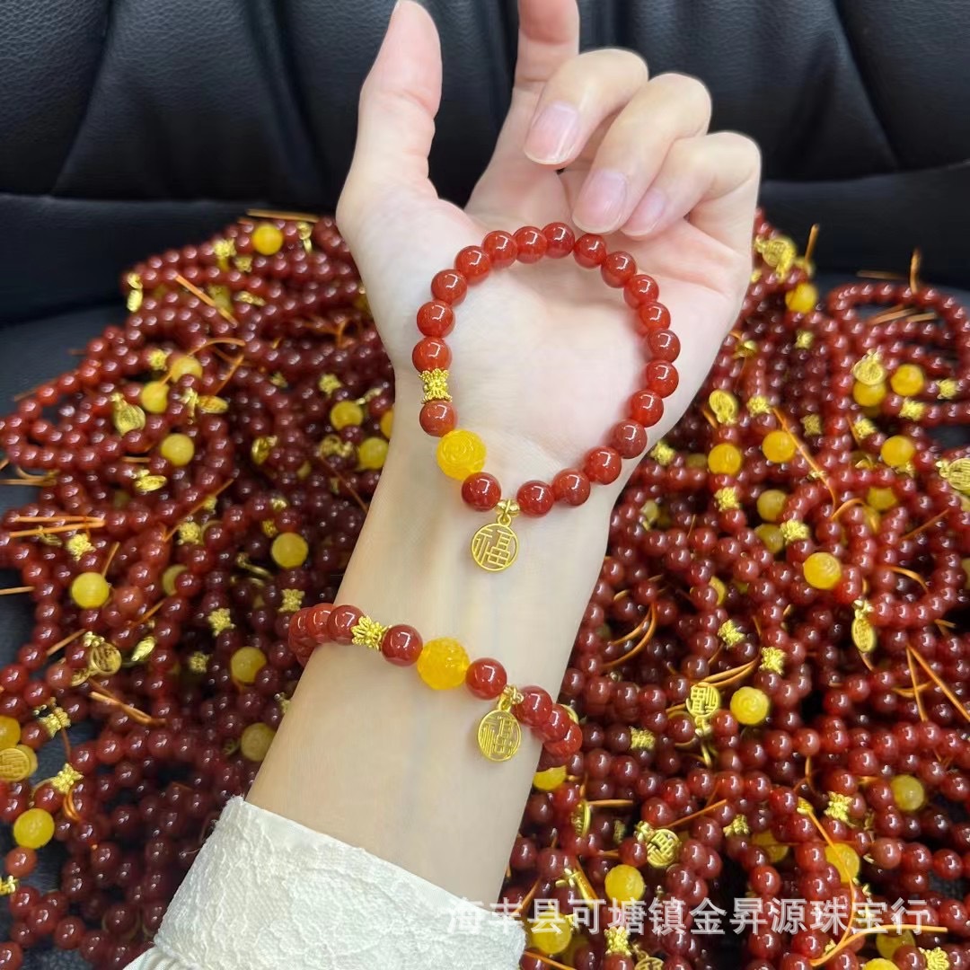 天然红色玛瑙手链南红手串搭配蜜蜡福字吊坠寺庙直播福利同款批发 批发量越大价格越低,可供直播间长期合作,欢迎来电私聊