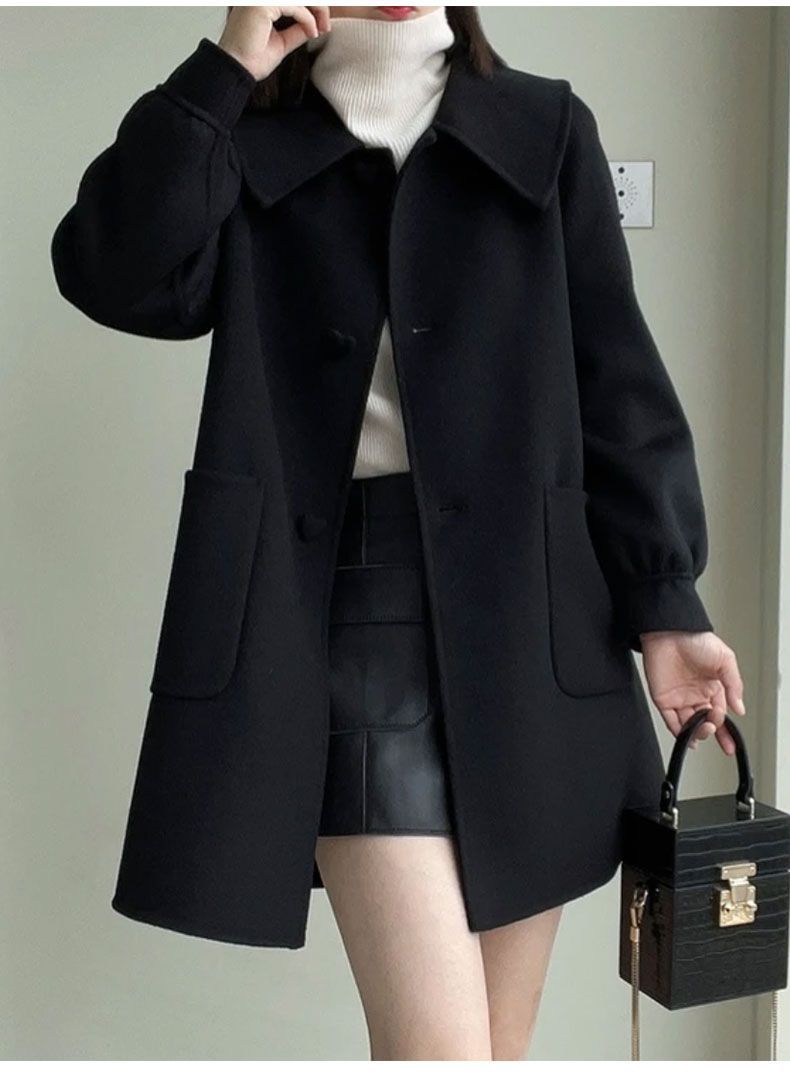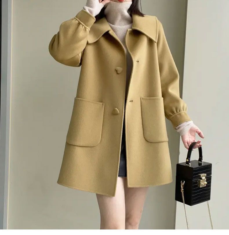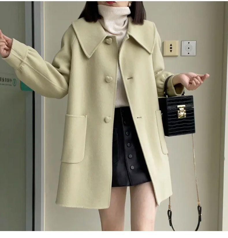 2024 осенне-зимнее новое шерстяное пальто средней длины с пряжкой для похудения, уменьшающее возраст кукольный воротник, шерстяной топ для женщин