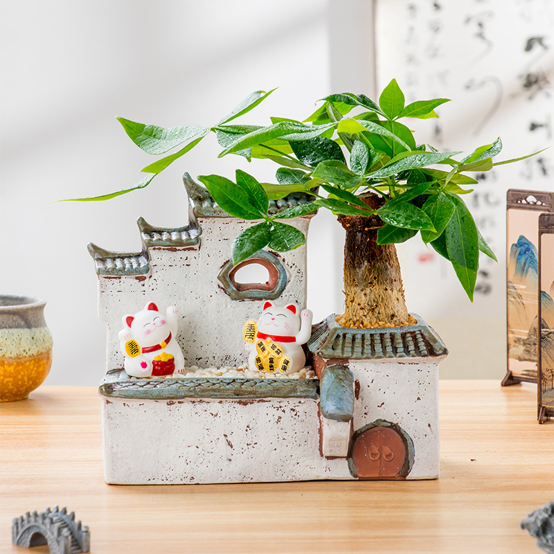 Зеленое растение Горшечное растение Офис Крытый мини-украшение автомобиля Открытие украшения Бизнес процветающий пять благословений Фортуна кошка