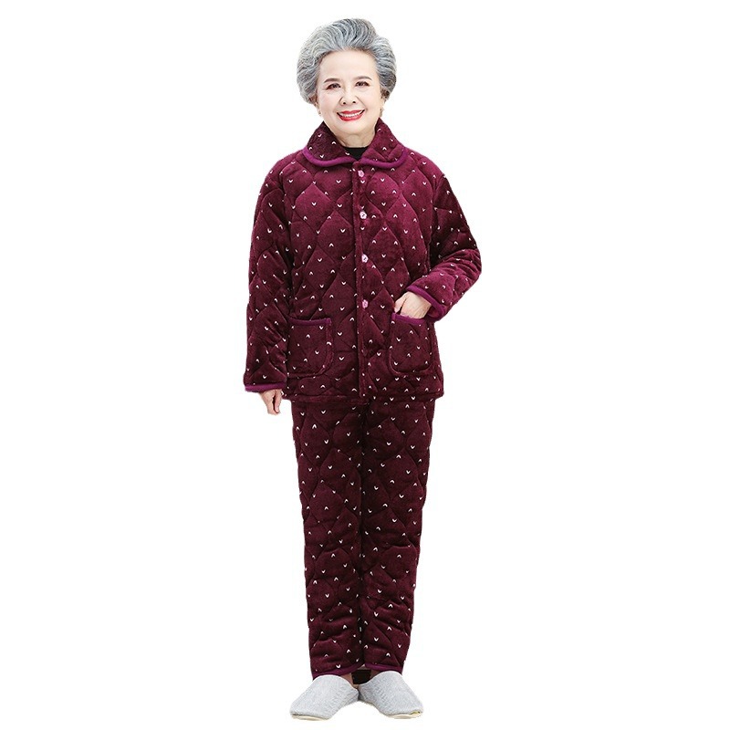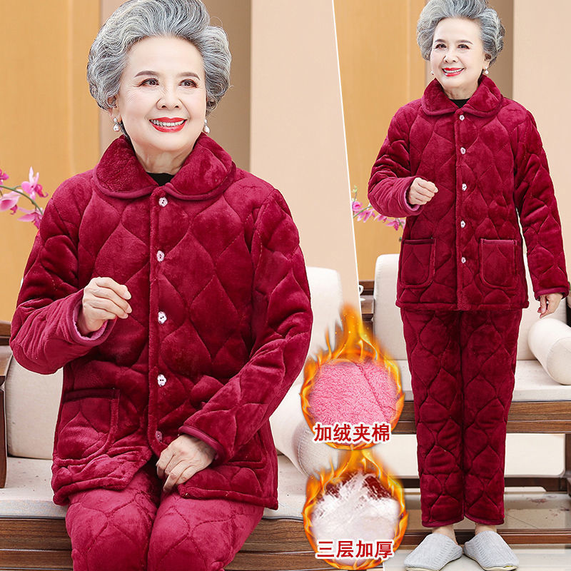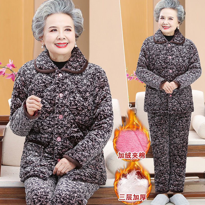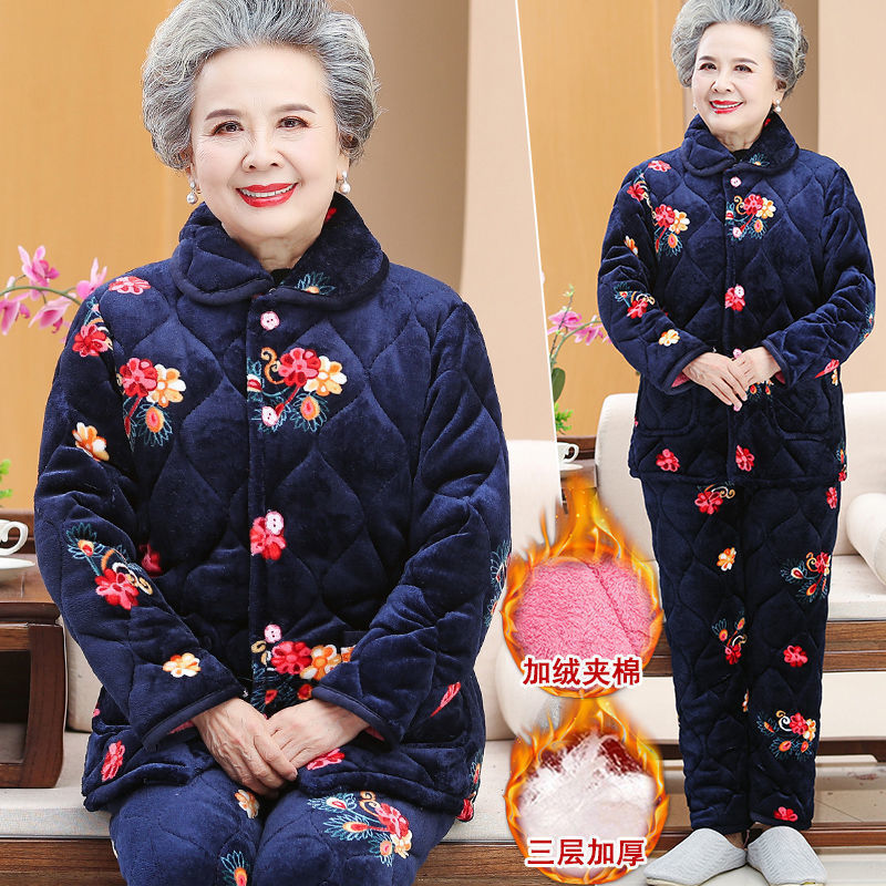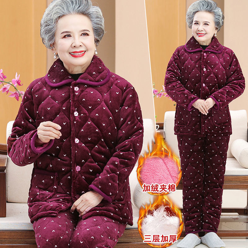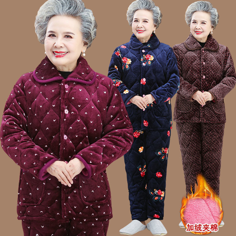Пижама для бабушки Трехслойная утолщенная домашняя одежда для мамы Костюм из кораллового флиса для пожилых людей Зимняя одежда для пожилых людей на флисовой подкладке Костюм для женщин