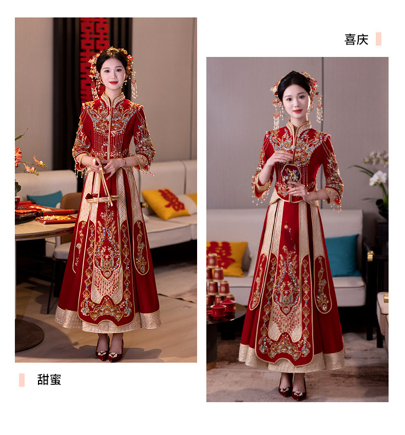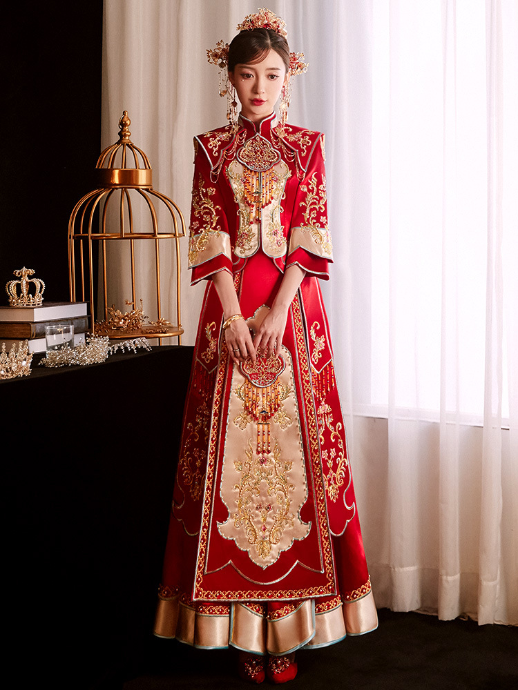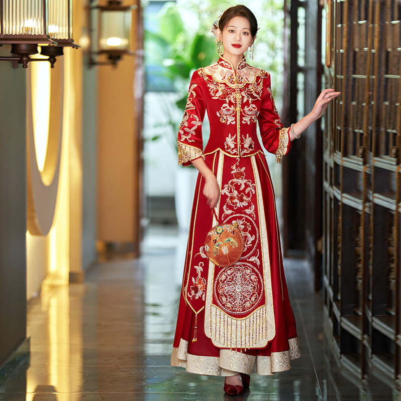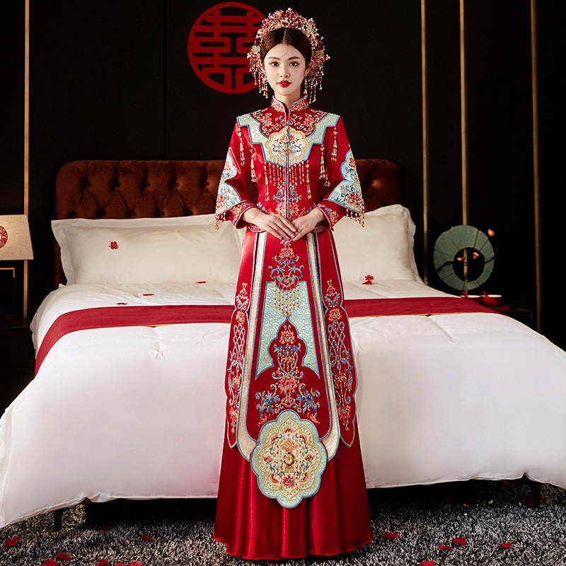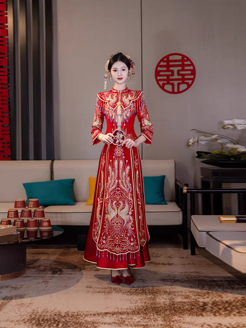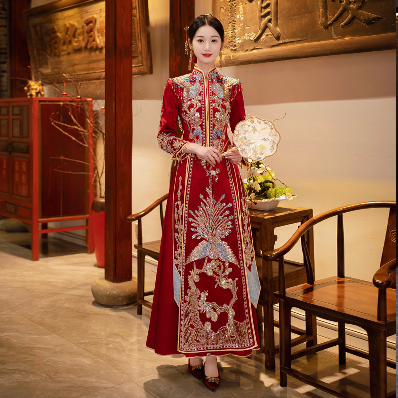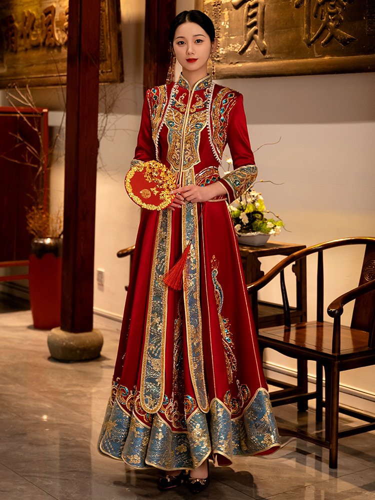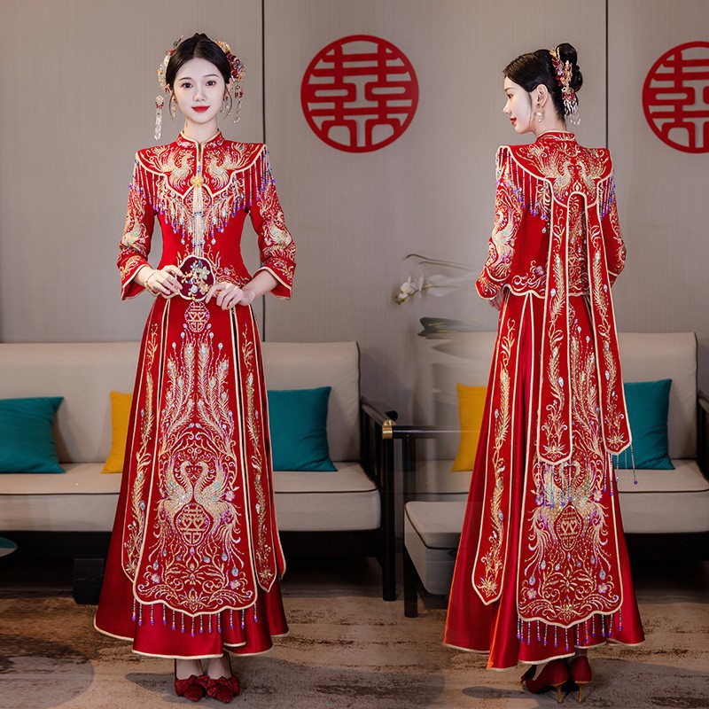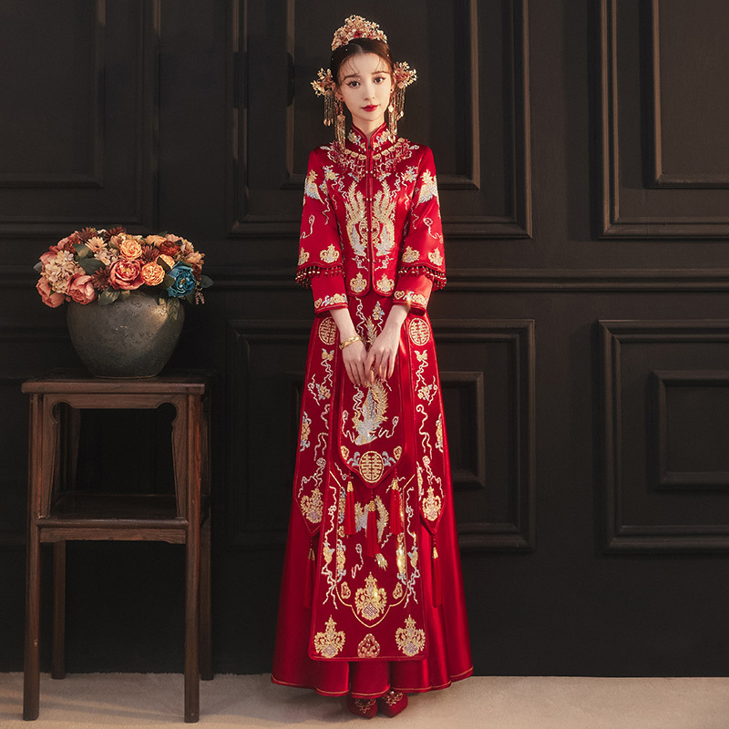 Традиционное китайское свадебное платье для невесты, платье с изображением дракона и феникса для свадьбы и торжественных тостов.