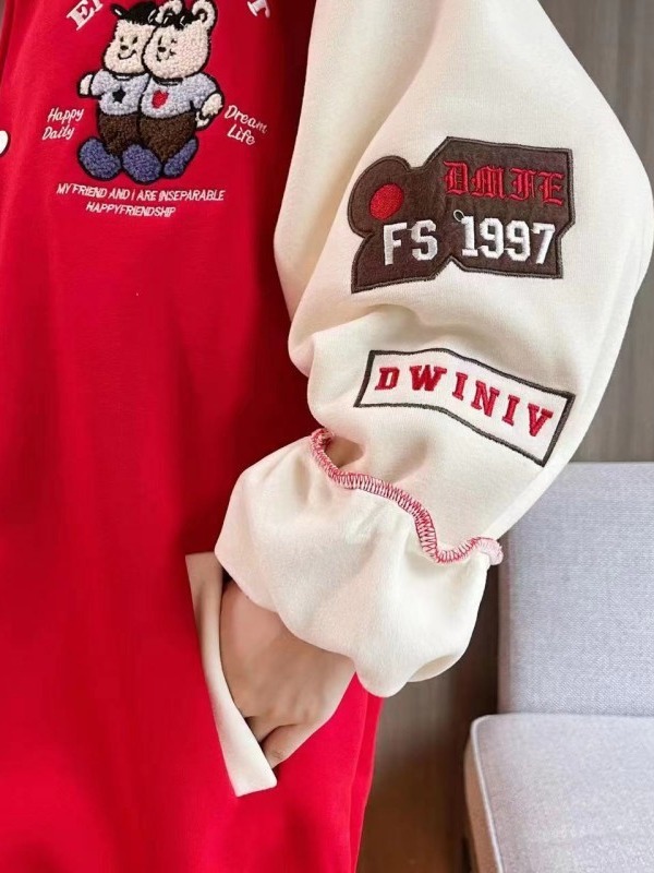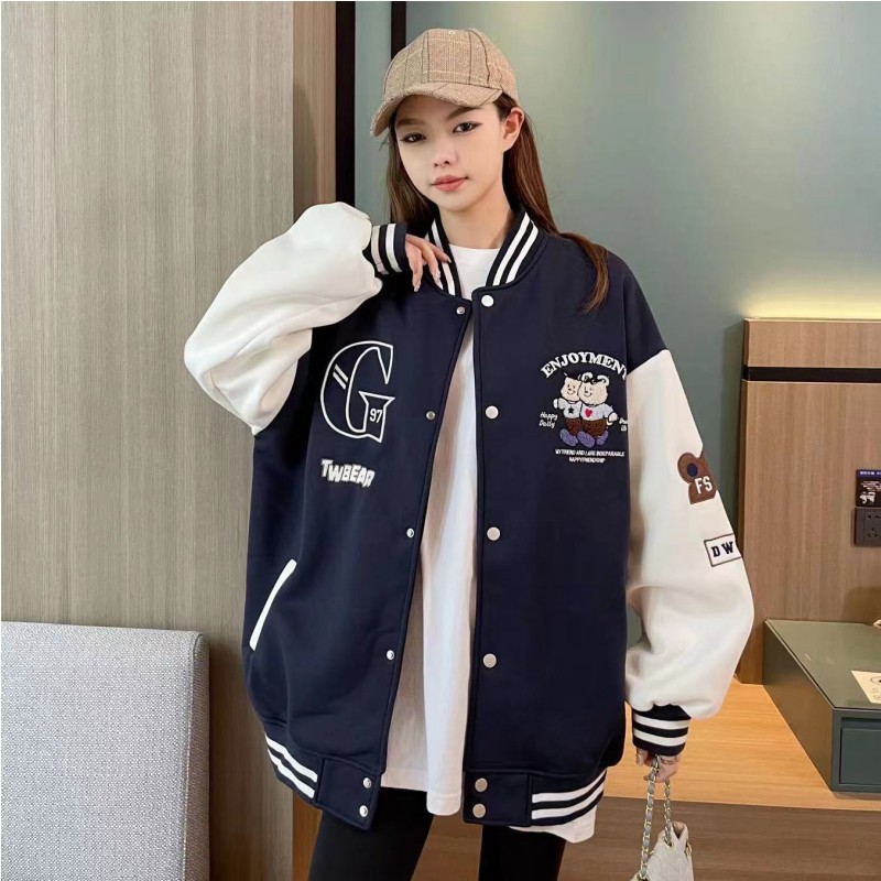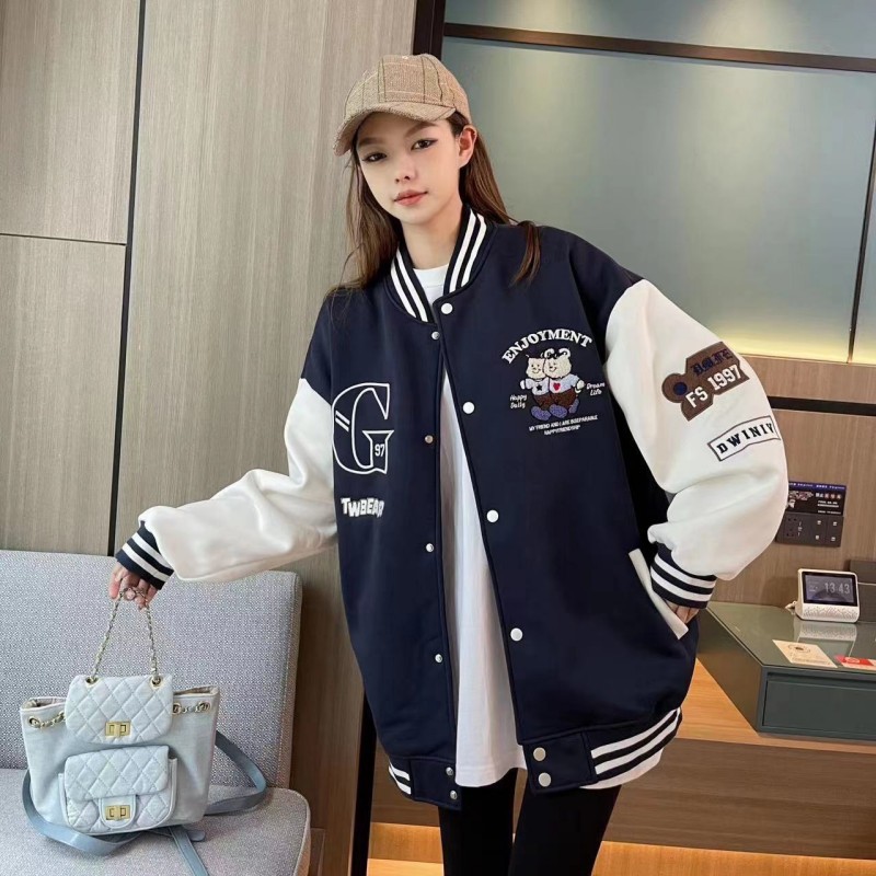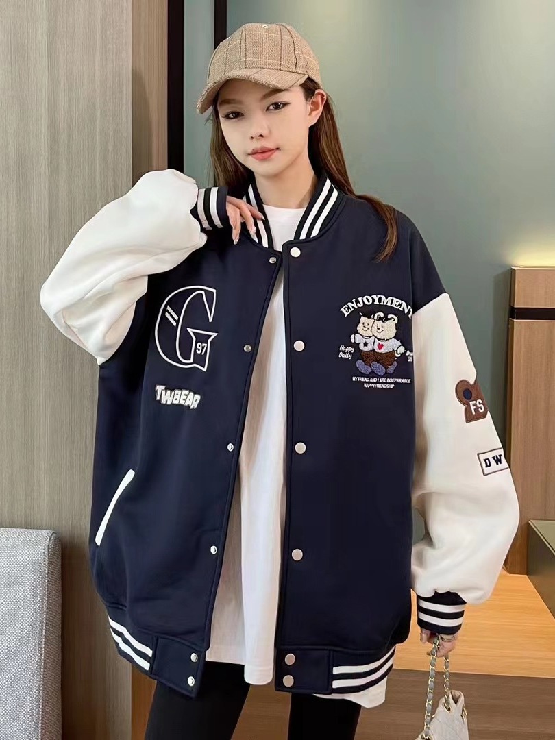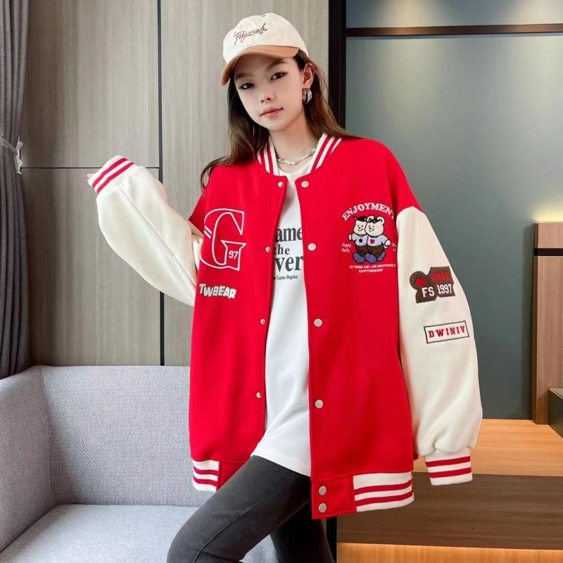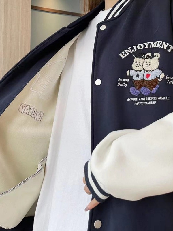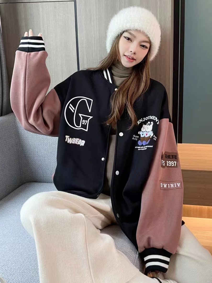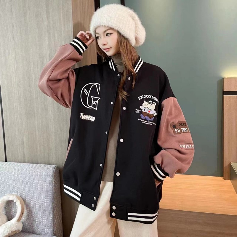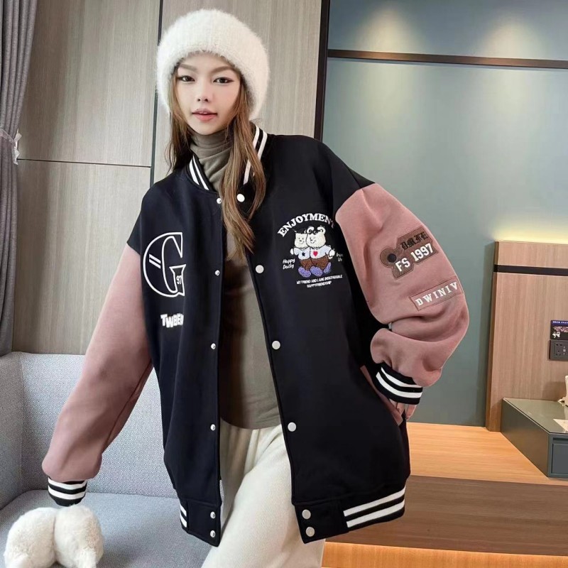 Женский бейсбольный костюм с плотной вышивкой на флисовой подкладке, утолщенный костюм с вертикальным воротником, Свободное пальто средней длины, повседневное пальто в Корейском стиле в академическом стиле
