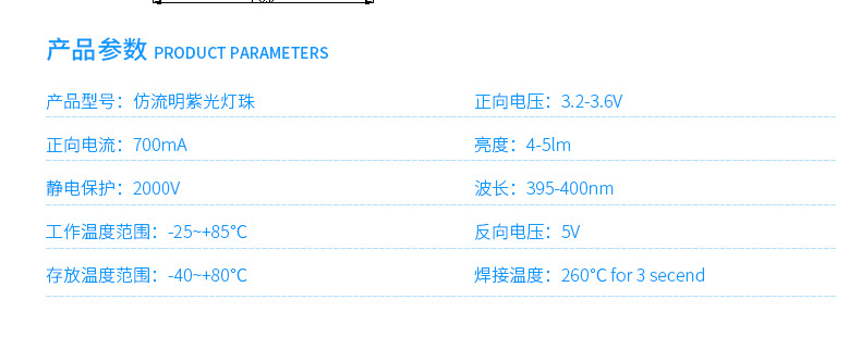 395-400nm 1W обычный объектив (горизонтальный чип); 395-400 нм 1 Вт высокотемпературная линза (горизонтальный чип); 395-400 нм 1 Вт пленка верх 260 ℃ (горизонтальный чип); 395-400nm 3W фильм Топ 260 ℃ (вертикальный чип)