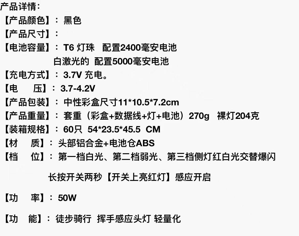 XPE белый свет [аккумулятор 1200 мАч] цветная коробка; T6 белый свет [аккумулятор 2400 мАч] цветная коробка; 10-ваттный белый лазер [аккумулятор 2400 мАч] в цветной упаковке; 20-ваттный белый лазер [аккумулятор 5000 мАч] в цветной упаковке
