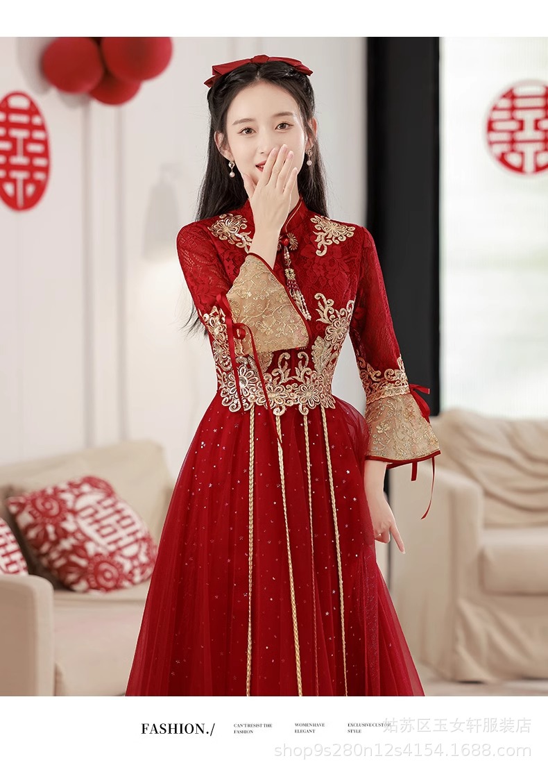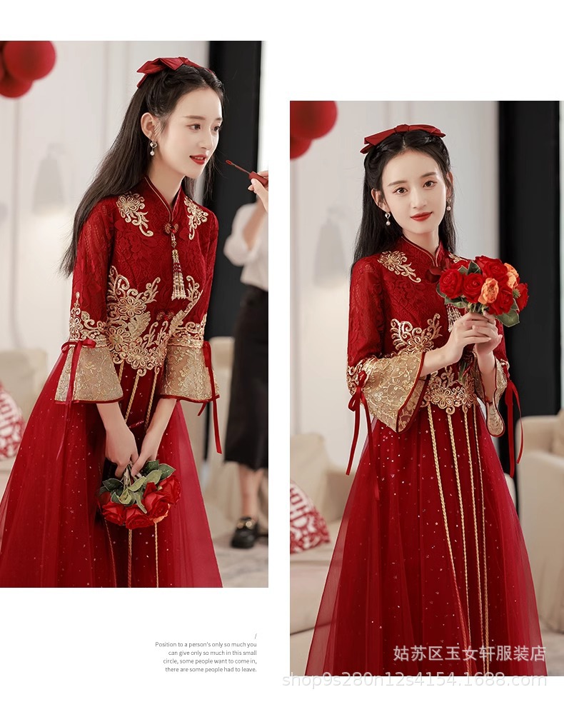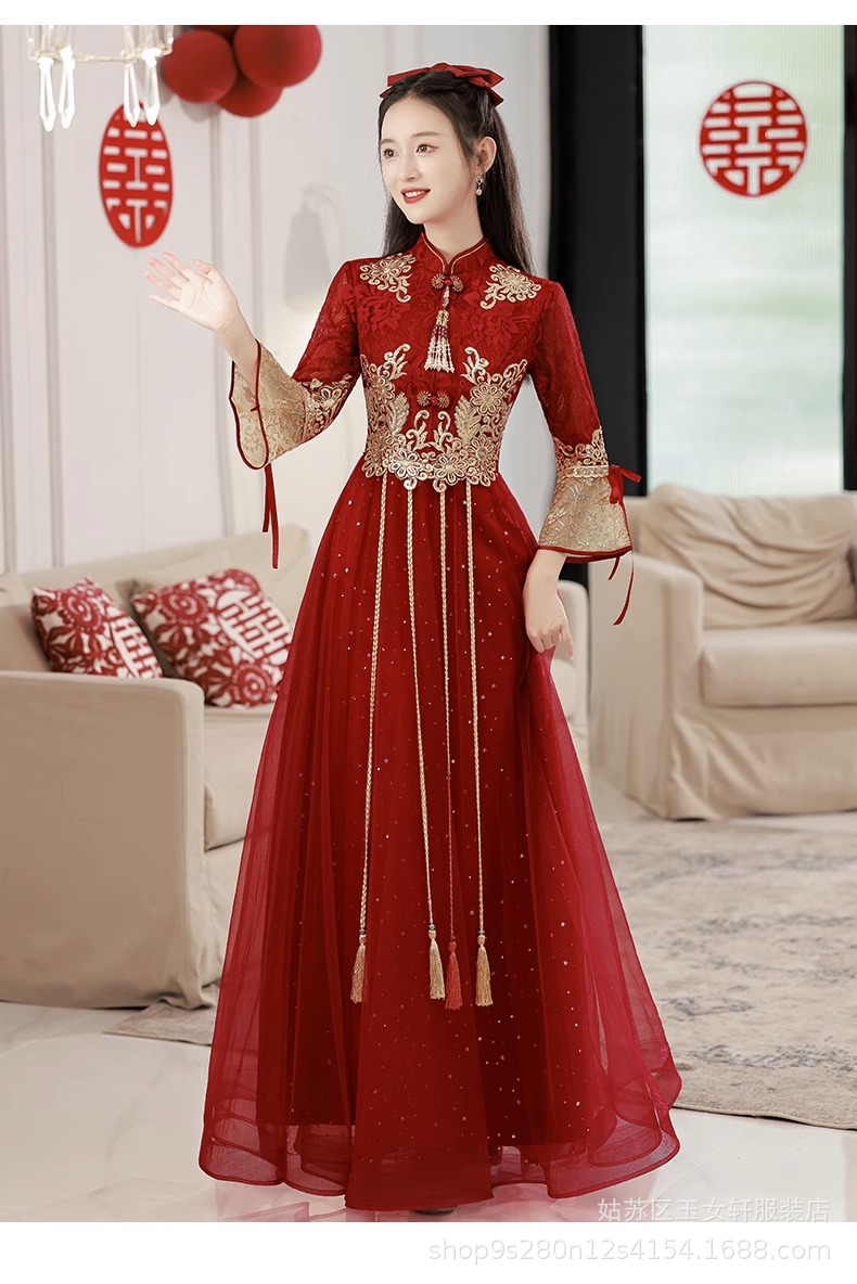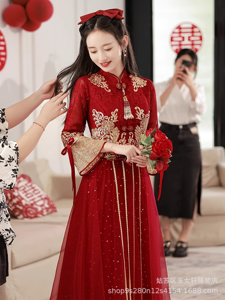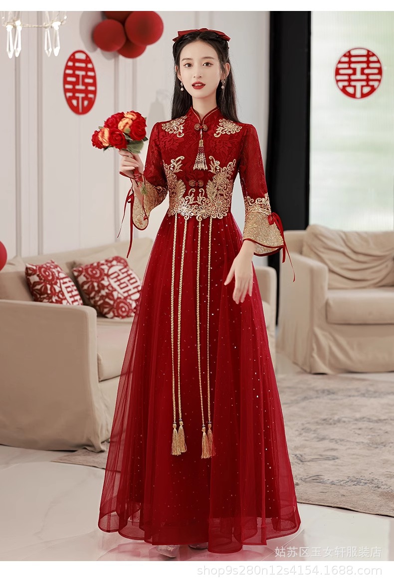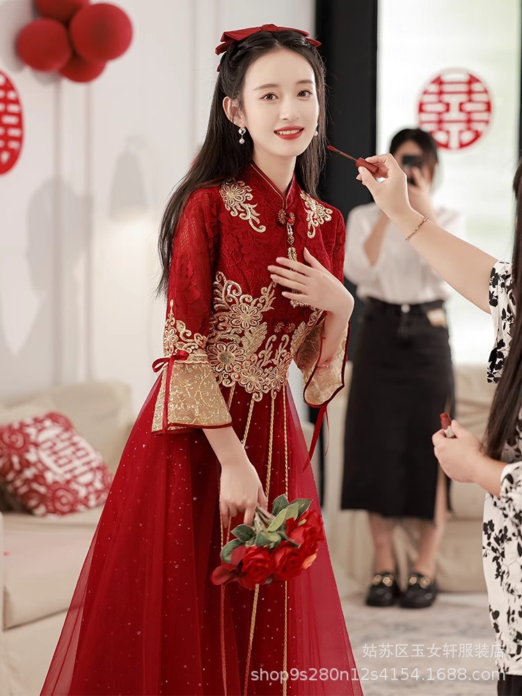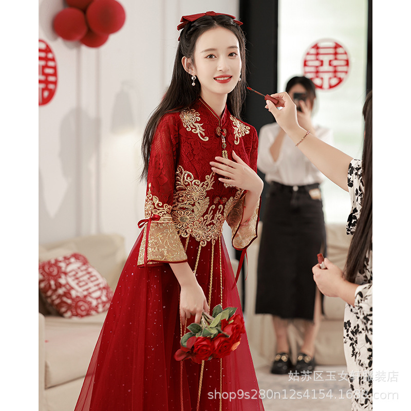 Красное свадебное платье для невесты, новинка 2024 года, осенне-зимнее элитное вечернее платье, китайский костюм Сюхэ, зимнее с длинными рукавами.