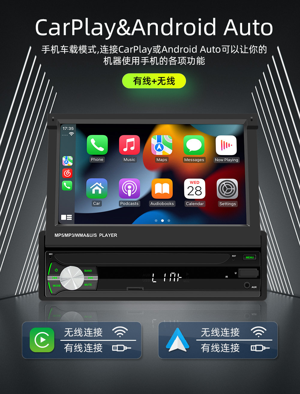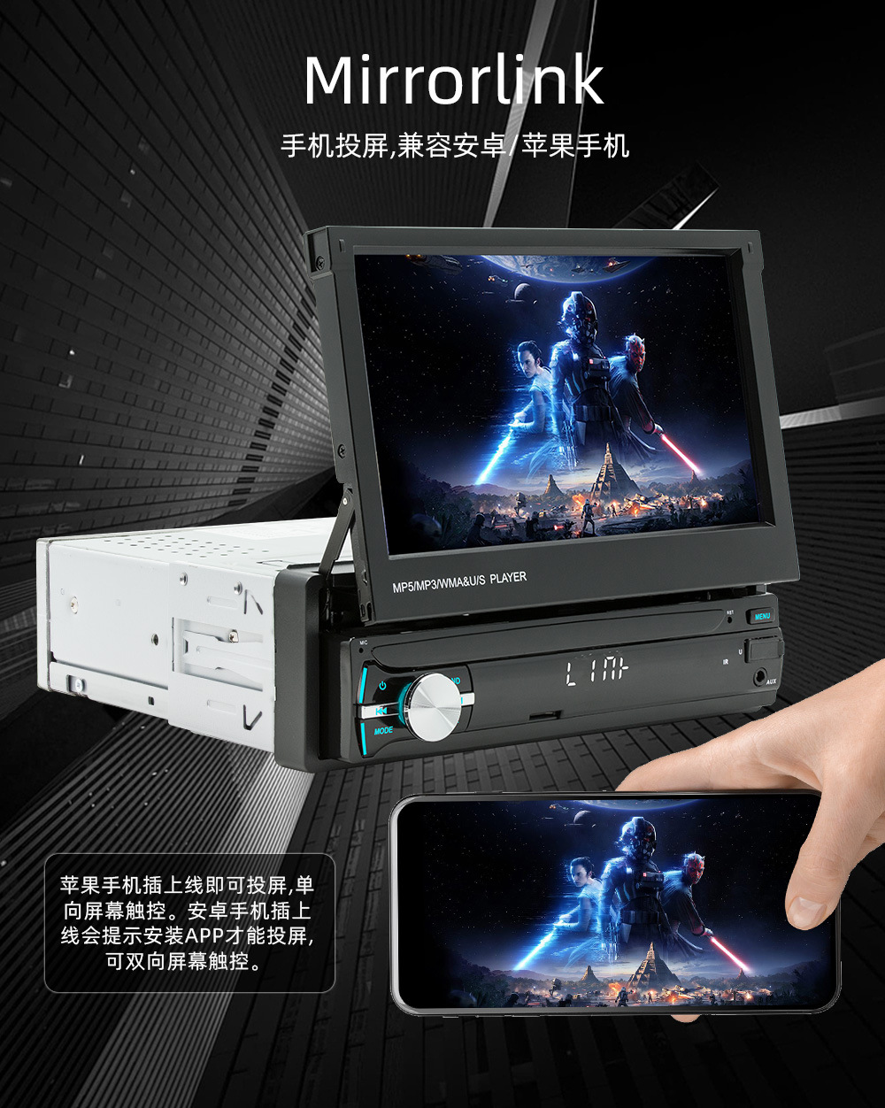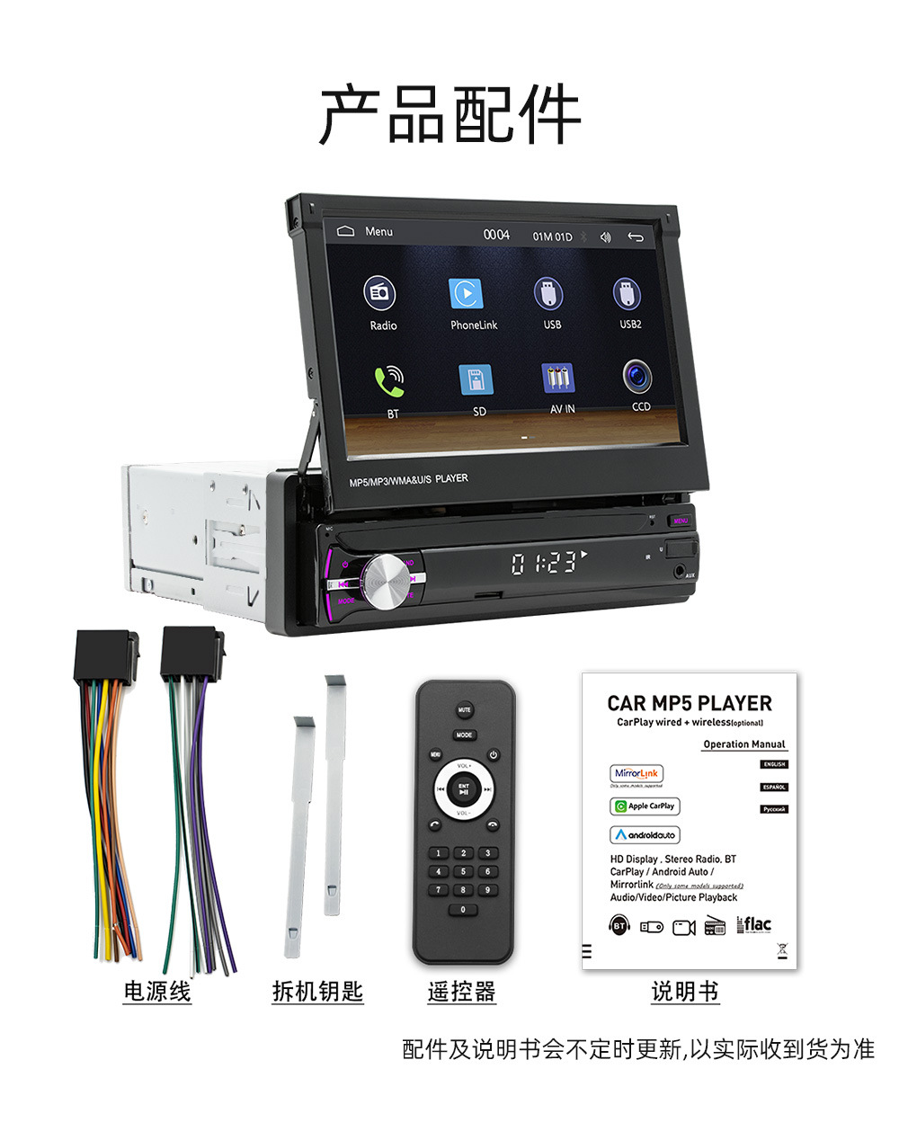 类型:车载MP5-手动伸缩屏 (可选配电动伸缩)