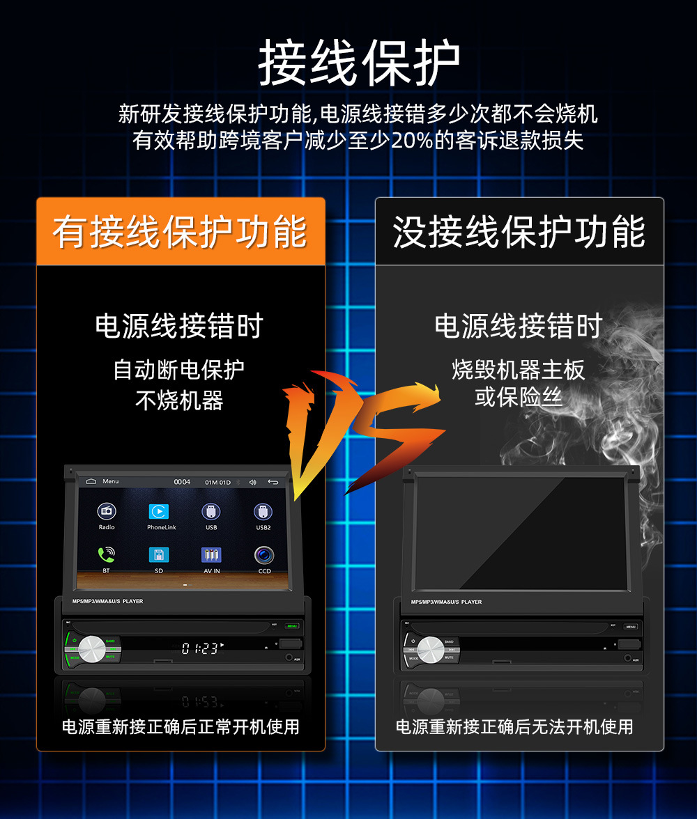 •接线保护功能直接帮跨境客户减少至少20%客诉退款损失(跨境客户零售到国外,客人自己安装接线,正负极分不清接错时候正常会直接烧坏机器主板或者保险丝,导致客诉退货或者差评,我司最新研发此产品电源线随便接N次都不会烧机器和保险丝,直到客户接对为止)