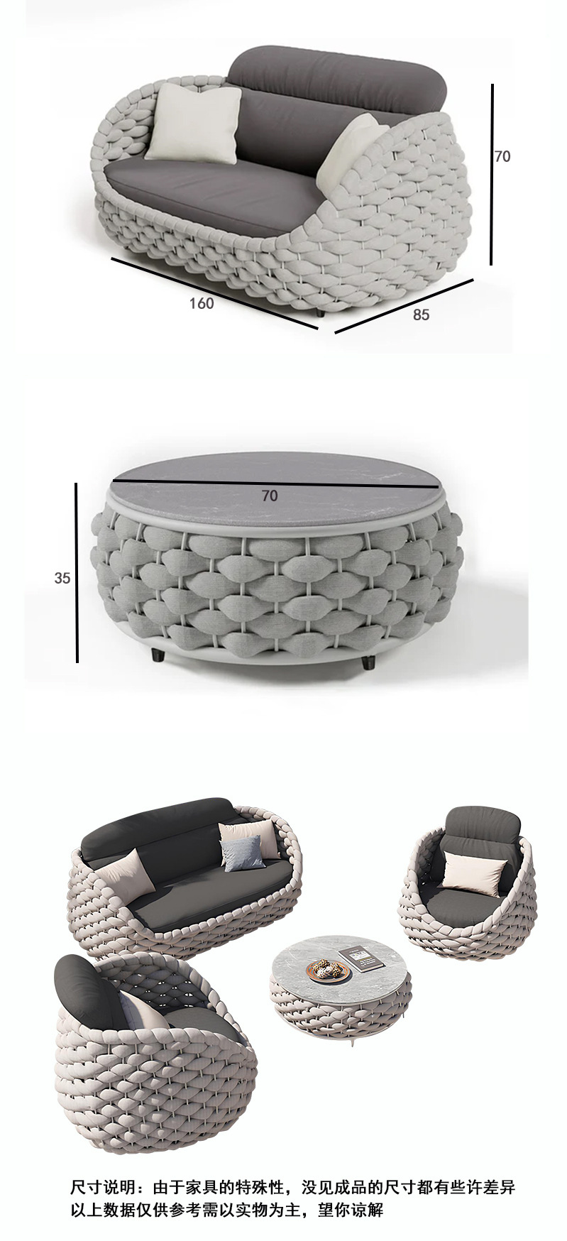 Журнальный столик: Φ700x350; Одноместный диван: 850x850x700; Двуспальный диван: 1600x850x700; двойной диван; Одноместный+одноместный+журнальный столик; Одиночный+Одиночный+Двойной+Журнальный столик